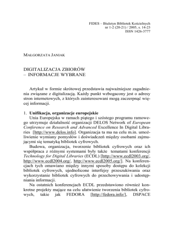 FIDES – Biuletyn Bibliotek Kościelnych nr 1-2 (20-21) / 2005, s. 14-23 ISSN 1426-3777 MAŁGORZATA JANIAK DIGITALIZACJA ZBIORÓW – INFORMACJE WYBRANE Artykuł w formie skrótowej przedstawia najważniejsze zagadnienia związane z digitalizacją. Każdy punkt wzbogacony jest o adresy stron internetowych, z których zainteresowani mogą zaczerpnąć więcej informacji. 1. Unifikacja, organizacje europejskie Unia Europejska w ramach piątego i szóstego programu ramowego utrzymuje działalność organizacji DELOS Network of European Conference on Research and Advanced Excellence In Digital Libraries [http://www.delos.info]. Organizacja ta ma na celu m.in. umożliwienie wymiany pomysłów i doświadczeń między osobami zajmującymi się tematyką bibliotek cyfrowych. Budowa, organizacja, tworzenie bibliotek cyfrowych oraz ich współpraca z różnymi systemami były także tematami konferencji Technology for Digital Libraries (ECDL) [http://www.ecdl2003.org/, http://www.ecdl2004.org/, http://www.ecdl2005.org/]. Na konferencjach tych omawiano między innymi sposoby dostępu do kolekcji bibliotek cyfrowych, ujednolicone interfejsy przeszukiwania oraz wykorzystanie bibliotek cyfrowych do przechowywania i udostępniania informacji. Na ostatnich konferencjach ECDL przedstawiono również konkretne projekty mające na celu ułatwienie tworzenia bibliotek cyfrowych, takie jak FEDORA [http://fedora.info/], DSPACE KOMPUTERYZACJA... : Janiak M., Digitalizacja zbiorów… 15 [http://www.dspace.org/], czy Greenstone [http://www.greenstone.org/]. Polskim systemem dla organizacji kolekcji zdigitalizowanych jest system dLibra [http://dlibra.psnc.pl/] rozwijany w ramach prac badawczo-rozwojowych prowadzonych w Poznańskim Centrum Superkomputerowo-Sieciowym [http://www.man.poznan.pl/]. W ramach prac dotowanych m.in. przez UE znalazł się także projekt digitalizacyjny skarbów należących do bibliotek narodowych krajów europejskich pod nazwą: Tel-Me-Mor. Rozpoczął on swoją działalność 1 lutego 2005 r., a wśród partnerów znalazła się polska Biblioteka Narodowa. Informacje na jego temat dostępne są pod adresem: http://www.bn.org.pl/TMM_POL/TMM_POL_NEW/index.php Kolejnym programem, w ramach którego podejmowane są akcje „ucyfrowania” treści ważnych dla nauki i kultury jest eContentplus. Najnowszy konkurs grantowy (2006 r.) dotyczy przede wszystkim informacji geograficznej, treści edukacyjnych, bibliotek cyfrowych oraz wzmocnienia współpracy między właścicielami informacji cyfrowych [http://ec.europa.eu/index_pl.htm]. Innym pomysłem dofinansowywania własnych projektów jest przystąpienie do programu Cultura2000, który będzie miał swoje nowe edycje w latach 20072013 [http://ec.europa.eu/culture/eac/index_en.html ; http://www.mk.gov.pl/pkk/]. Działania podejmowane na skalę światową, dotyczące także Europy to np. propozycje firmy Google (gigantyczny projekt mający w swym celu ostateczny, ucyfrowienie „całej” literatury przede wszystkim naukowej, pozwalający zawężać wyszukiwanie do dziedzin, a zawierający preprinty, abstrakty, wybrane fragmenty tekstów oraz pełne teksty artykułów czy całych książek – przy współpracy np.. British Library – http://scholar.google.com/) czy Yahoo (projekt, który przy współpracy portalu internetowego Yahoo oraz amerykańskich i europejskich bibliotek uniwersyteckich oraz archiwów Open Content Alliance OCA ma doprowadzić w najbliższym czasie do digitalizacji ok. 18 tys. dzieł literatury amerykańskiej oraz materiałów z innych archiwów narodowych, głównie europejskich. Pierwsze dzieła powinny znaleźć się w sieci do końca tego roku, a wszystkie 18 tys. pozycji do końca 2006 r. [http://wiadomosci.gazeta.pl/wiadomosci/1,53621,2949871.html]. 16 FIDES – Biuletyn Bibliotek Kościelnych 1-2/2005 2. Firmy oraz sprzęt Wybrane polskie firmy: a. Digital-center http://www.digital-center.pl b. Mikrofilm-Center http://www.mikrofilm.pl/ c. DjaF http://www.djaf.pl/ d. ddp http://www.ddp.pl/o_nas/news/20051127.php Wybrane profesjonalne skanery: LPX-250 – RICO [http://www.rico.pl/] Obrotowy/planarny bezdotykowy skaner laserowy LPX-250 firmy Roland znajduje zastosowanie między innymi w różnych dziedzinach sztuki i techniki. Bardzo dobre narzędzie 3D. Łączy on pracę dwóch opcjonalnych trybów skanowania: obrotowego i w płaszczyźnie. Rotacyjny tryb skanowania jest idealny do szybkiego skanowania obiektów sferycznych oraz obiektów o gładkiej powierzchni. Tryb skanowania w płaszczyźnie zaś najlepszy jest do skanowania przedmiotów o powierzchni płaskiej lub wklęsłej, obiektów pochyłych oraz ich subtelnych detali np. książek. DigiBook [http://www.i2s-bookscanner.com/] Urządzenie do skanowania starodruków oraz obiektów o szczególnej wartości. Skaner posiada tak zwaną kołyskę, która przydatna jest przy skanowaniu książek z grubymi grzbietami. Dzięki swoim ruchomym ramionom, kołyska umożliwia takie rozłożenie obiektów, aby skanowane strony były na jednej wysokości. Zastosowanie kołyski zapobiega niszczeniu książek. Głowica skanująca przesuwa się nad obiektem. BookEye [http://www.bookeyeusa.com/] Skaner przeznaczony jest także do digitalizacji starodruków oraz cennych obiektów. Można nim również wykonywać skany map, czasopism, a także zwykłych książek. Skaner dokonuje tycznej korekcji zagięć kartek, czyli eliminuje KOMPUTERYZACJA... : Janiak M., Digitalizacja zbiorów… 17 zniekształcenia obrazu występujące przy grzbiecie książki. Canon MS [http://www.canoneurope.com/] Skaner, pozwalający digitalizować wszelkiego rodzaju mikroformy. Wykonuje on skany z błon negatywowych i pozytywowych wykonanych na filmach srebrowych i diazo. Sprzęt techniczny do odczytu (czytniki)1 Na rynku pojawiło się już wiele wyspecjalizowanych urządzeń przeznaczonych wyłącznie do zapisywania i odczytywania cyfrowego tekstu. Urządzenia te dają możliwość przechowywania kil