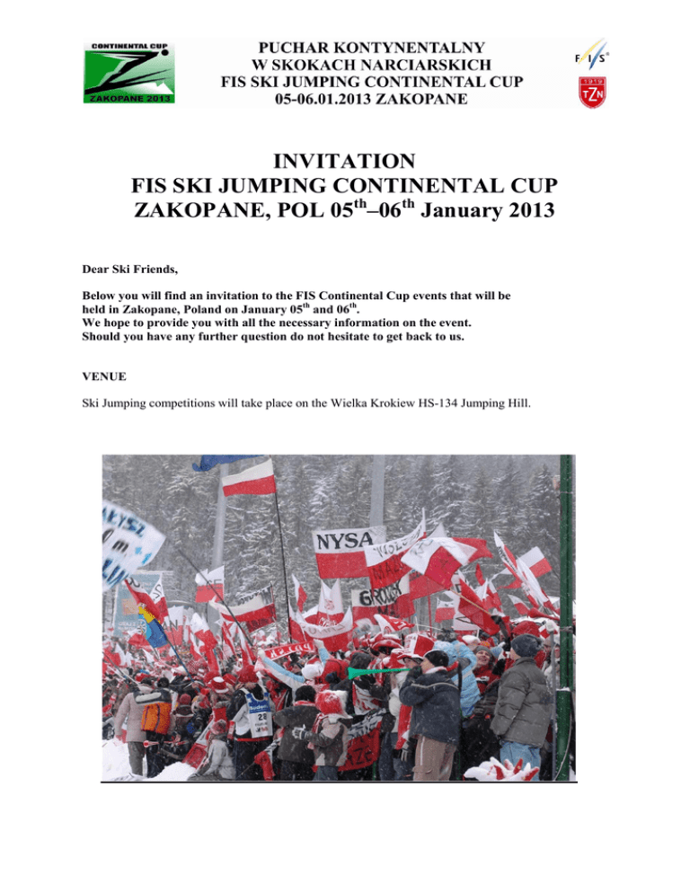 INVITATION FIS SKI JUMPING CONTINENTAL CUP ZAKOPANE, POL 05th–06th January 2013 Dear Ski Friends, Below you will find an invitation to the FIS Continental Cup events that will be held in Zakopane, Poland on January 05th and 06th. We hope to provide you with all the necessary information on the event. Should you have any further question do not hesitate to get back to us. VENUE Ski Jumping competitions will take place on the Wielka Krokiew HS-134 Jumping Hill. ORGANISING COMMITTEE Tatrzański Związek Narciarski – TATRA SKI FEDERATION ul. Bronislawa Czecha 1B 34-500 Zakopane, Poland Phone: +48 18 20 153 08 Fax: +48 18 20 125 88 Email: [email protected] Website: http://www.tzn.com.pl Race Office, Accreditation and Accommodation Office Tatrzański Związek Narciarski – TATRA SKI FEDERATION ul. Bronislawa Czecha 1B 34-500 Zakopane, Poland Meeting room Tatrzański Związek Narciarski – TATRA SKI FEDERATION ul. Bronislawa Czecha 1B 34-500 Zakopane, Poland Organising Committee President OC Executive Director Vice President Secretary Treasurer Chief of Technical Facilities Chief Stewart Chief of Accommodation and Transfer Competition Management Chief of Competition Race Secretary Chief of accreditation & calculations Chief of hill Janusz Majcher Andrzej Kozak Andrzej Gąsienica Makowski Apoloniusz Tajner Marta Chrapko Helena Szufnara Andrzej Stryczek Andrzej Łęcki Ewa Kremer Ryszard Guńka Bożena Zagata Marek Kowalczyk Andrzej Stryczek FIS OFFICIALS FIS Coordinator COC TD TD-Assistant Jumping Judges Tielmann Horst Greger Ivo Hirsch Volkmar Emil Babis Dlugopolski Kazimierz Szostak Tadeusz Bafia Kazimierz Galica Andrzej FIS CZE GER SVK POL POL POL POL ACCOMMODATION The FIS Ski Jumping Continental Cup Zakopane 2013 Organizing Committee takes care of the full board accommodation for the athletes and officials. The bookings for national teams are organized by the OC according to the team quotas and sent entries. All the bookings and accommodation request shall be sent directly to the OC of Zakopane address. . The price for the daily full board accommodation, for those over national quotas, is: 30 Euro per person FB Cash and credit cards are accepted. If there are any NSF who had made their own accommodation arrangements are obliged to inform the OC about the fact not later than December 31st The LOC does not guarantee the availability of accommodation for requests and entries sent later than December 31st Hotel address: Willa “Tadeusz” Oberconiówka 10 +48 18 20 61 214 TRANSFERS Airport pick-ups will be provided on the teams’ requests. All team cars will get special parking labels to park in the reserved areas. DEADLINES Entries by numbers: December 20th Entries by names: December 31st Accreditation requests only by NSF by December 31st FIS Family tickets will be granted according to new FIS rules. ARRIVALS By plane : Warszawa (450 km) Katowice (180 km) Kraków (110 km) By train : Zakopane By car : PL / SVK boarder: West - Sucha Hora- Chochołów 20km East - Łysa Polana 20 km All the airport pick-ups will be provided by the LOC at the teams’ expense, provided that they are requested for in advance. PROGRAMME 03.01.2013 CZWARTEK /DONNERSTAG/ THURSDAY 18:00 Przyjazd ekip / Anreise / Teams’ arrival at the Zakopane Willa “Tadeusz” 04.01.2013 PIĄTEK /FREITAG/ FRIDAY 09:00 Odprawa Techniczna / Mannschaftsfűhrersitzung / Team captains’ meeting 12:00 Oficjalny trening HS-134 (2 serie) Offizielles Training HS-134 (2 Durchgänge) Official training HS-134 (2 rounds) 05.01.2013 SOBOTA /SAMSTAG/ SATURDAY 10:30 Seria próbna / Probedurchgang /Trial round 12:00 Konkurs skoków Puchar Kontynentalny HS-134 Sprungwettkampf Continental Cup HS-134 Ski Jumping Continental Cup Competition HS-134 06.01.2013 NIEDZIELA /SONNTAG/ SUNDAY 10:30 Seria próbna / Probedurchgang /Trial round 12:00 Konkurs skoków Puchar Kontynentalny HS-134 Sprungwettkampf Continental Cup HS-134 Ski Jumping Continental Cup Competition HS-134 SKI WAXING and SERVICE AREA Ski wax cabins will be located at Wielka Krokiew HS-134 hill. DOPING CONTROL According to FIS standards and rules. INSURANCE All athletes need the insurance arranged by their National Ski Associations. The Organizing Committee is not responsible for any injuries of the athletes neither for the damage or lost property. LANGUAGE The official language is English. ADDITIONAL PROGRAMME Ceremonies according to official programme and FIS guidelines. VISA INFORMATION This invitation should be enough to get visas. In case you will need assistance with getting these, do not hesitate to contact us.