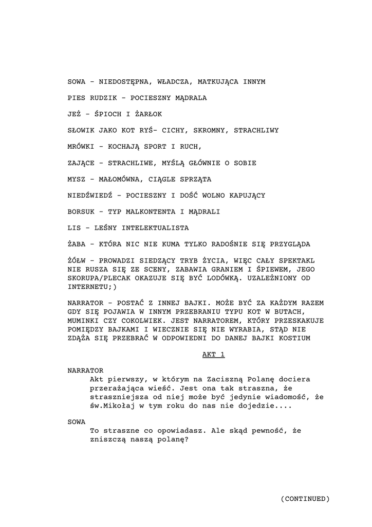 SOWA - NIEDOSTĘPNA, WŁADCZA, MATKUJĄCA INNYM PIES RUDZIK - POCIESZNY MĄDRALA JEŻ - ŚPIOCH I ŻARŁOK SŁOWIK JAKO KOT RYŚ- CICHY, SKROMNY, STRACHLIWY MRÓWKI - KOCHAJĄ SPORT I RUCH, ZAJĄCE - STRACHLIWE, MYŚLĄ GŁÓWNIE O SOBIE MYSZ - MAŁOMÓWNA, CIĄGLE SPRZĄTA NIEDŹWIEDŹ - POCIESZNY I DOŚĆ WOLNO KAPUJĄCY BORSUK - TYP MALKONTENTA I MĄDRALI LIS - LEŚNY INTELEKTUALISTA ŻABA - KTÓRA NIC NIE KUMA TYLKO RADOŚNIE SIĘ PRZYGLĄDA ŻÓŁW - PROWADZI SIEDZĄCY TRYB ŻYCIA, WIĘC CAŁY SPEKTAKL NIE RUSZA SIĘ ZE SCENY, ZABAWIA GRANIEM I ŚPIEWEM, JEGO SKORUPA/PLECAK OKAZUJE SIĘ BYĆ LODÓWKĄ. UZALEŻNIONY OD INTERNETU;) NARRATOR - POSTAĆ Z INNEJ BAJKI. MOŻE BYĆ ZA KAŻDYM RAZEM GDY SIĘ POJAWIA W INNYM PRZEBRANIU TYPU KOT W BUTACH, MUMINKI CZY COKOLWIEK. JEST NARRATOREM, KTÓRY PRZESKAKUJE POMIĘDZY BAJKAMI I WIECZNIE SIĘ NIE WYRABIA, STĄD NIE ZDĄŻA SIĘ PRZEBRAĆ W ODPOWIEDNI DO DANEJ BAJKI KOSTIUM AKT 1 NARRATOR Akt pierwszy, w którym na Zaciszną Polanę dociera przerażająca wieść. Jest ona tak straszna, że straszniejsza od niej może być jedynie wiadomość, że św.Mikołaj w tym roku do nas nie dojedzie.... SOWA To straszne co opowiadasz. Ale skąd pewność, że zniszczą naszą polanę? (CONTINUED) CONTINUED: 2 RUDZIK Wiesz jak lubię się szwendać. Widziałem co zrobiły w innych miejscach. Nie możemy ryzykować. Musimy szybko zwołać wszystkich mieszkańców i rozpocząć ewakuację. SOWA No tak. Tym bardziej, że jest początek wiosny, każdy zajęty swoimi zalotami... RUDZIK No właśnie. Nie mamy dużo czasu. To co? SOWA Dobrze, zwołaj wszystkich, a ja napiszę przemówienie. Ale nie śpiesz się, bo muszę to zrobić starannie i pisanymi literami w zeszycie trzy liniowym. sowa schodzi w kulisy, a Rudzik podchodzi do Żółwia co siedzi przy pianinie i gra smętną melodię NARRATOR O tak, sowa słynęła na całą Zaciszną Polanę ze swojego starannego pisma w zeszycie trzy liniowym, a że tym razem sprawy przybrały wyjątkowo dramatyczny obraz, Sowa postanowiła przygotować na tę okoliczność specjalną prezentację. RUDZIK Do narratora, który przebiera się do innej bajki A ty dokąd się wybierasz? NARRATOR przebiera się szybko Sorki, ale muszę szybko... potrzebują narratora u Kota w butach! RUDZIK AAA! To pędź! do Żółwia Skoro Sowa kazała się nie śpieszyć, to sobie posiedzę chwilę z tobą, żółwiku od pośpiechu eksperciku. (CONTINUED) CONTINUED: 3 ŻÓŁW Ale suchar. RUDZIK A co ty tak tam plumkasz? ŻÓŁW Taka tam, sentymentalna piosenka ... RUDZIK E, no nie bądź taki, zaśpiewaj. ŻÓŁW śpiewa na melodię smutnego bluesa Za dołami, za dziurami Między polem a lasami Tam zaciszna jest kraina Z tęczą co ma kształt komina Spokój tutaj nie ma końca Zieleń wije się do słońca Fauna z florą żyją w zgodzie Na złość wiatru, niepogodzie RUDZIK Smutne to jakieś... Ej, no a nie dasz rady tak czegoś, no wiesz, żeby łapy same chodziły. zaczyna przeskakiwać z nogi na nogę Coś może takiego o tym, no eee ...Czekaj żółwiku, muszę zrobić siku. schodzi ze sceny (CONTINUED) CONTINUED: 4 ŻÓŁW dalej na tę samą melodię podśpiewuje do słów "CZEKAJ ŻÓŁWIKU MUSZĘ ZROBIĆ SIKU..." wraca Rudzik RUDZIK Mam, już mam! Wymyśliłem przy myciu łap. (wybija rytm i do tego dorzuca rapowankę, którą oczywiście powinna złapać "cała sala..." Żółwik też daje czadu dodając jakieś efekty typu beatbox czy skrecz) Zacisze, Zacisze Do rytmu się kołysze To dzielne zwierzaki Nie straszne im ślimaki RUDZIK Ej, Żółwik, z ciebie nie jest wcale taki ślimak jak myślałem! Ojej, zapomniałem! Muszę zwołać wszystkich na zebranie! RUDZIK zwołuje wszystkich przez megafon Uwaga! Uwaga! Wszyscy Zaciszanie Przybywajcie szybko Do Sowy na zebranie! SOWA Drodzy mieszkańcy Zacisznej Polany! Nastał straszny dzień. Zagraża nam ogromne niebezpieczeństwo! (CONTINUED) CONTINUED: 5 WSZYSCY między sobą, do siebie, z przerażeniem Jakie? Co się dzieje? Powódź? Tornado? Angry Birds? Wycieczka dzieci, po której zostaną śmieci? SOWA Nie! To nie rozwrzeszczane przedszkolaki! Z nimi potrafilibyśmy sobie poradzić. Nacierają na nas...ślimaki! WSZYSCY Ślimaki?! Jak to? Skąd? SOWA Wszystko to zwęszył Rudzik. Ślimaki nacierają są groźne i bezwzględne. Po nich wszystko zostaje łyse. To przez nie mamy już (pokazuje na mapie/swojej prezentacji) Łysą Polanę, Łysą Górą, a nawet tu, proszę, droga na Ostrołękę ... miejscowość Łyse. Nacierają na nas z lądu i z wody z prędkością żabiego skoku na minutę. Po nich zostaje jedynie to co po czekoladzie jedzonej przez dzieci. RUDZIK Papierki?! ZAJĄCE Bolące zęby? SOWA Nie! Nie zostaje po nich nic! WSZYSCY z przerażeniem Jej, nic, nic. Sprzątają nawet papierki?! SOWA Moi drodzy. Zaciszna Polana przestanie istnieć, ale jest jeszcze czas byście rozpoczęli poszukiwania i znaleźli nowe, przyjazne miejsce. Jestem zmęczona. Patrolowałam polanę całą noc, a przez te ślimaki nie śpię od rana. Muszę odpocząć. Spotkajmy się wszyscy ostatni raz gdy tylko się spakujecie do drogi. Do zobaczenia. Czuję się taka osowiała! MRÓWKI O nie! My mrówki nie pozwolimy na to! My protestujemy! Będziemy walczyć! Otoczymy polanę i się nie dostaną! (CONTINUED) CONTINUED: 6 RUDZIK Niestety, ze ślimakami nie jest tak łatwo. Stosują niedozwolone chwyty i atakują w najmniej spodziewanym miejscu i momencie. Sami zobaczcie. (ściąga czapkę i pokazuje łysinę) ZAJĄCE przerażone, jąkając się ze strachu Jak to?! To one ci to zrobiły?! Te ślimaki! RUDZIK kiwa potakując głową i wskazuje na Żółwia, który też jest łysy ZAJĄCE Tobie też?! Oj tylko nie to! Nasze futerka! Musimy szybko się pakować i uciekać! Musimy chronić nasze cenne futerka! To straszne! zające panikują, biegają bez ładu, do paniki i hałasu dołączają także inne. Przerywa krzykiem Niedźwiedź wychodzący z toalety NIEDŹWIEDŹ Cisza! Nie dość