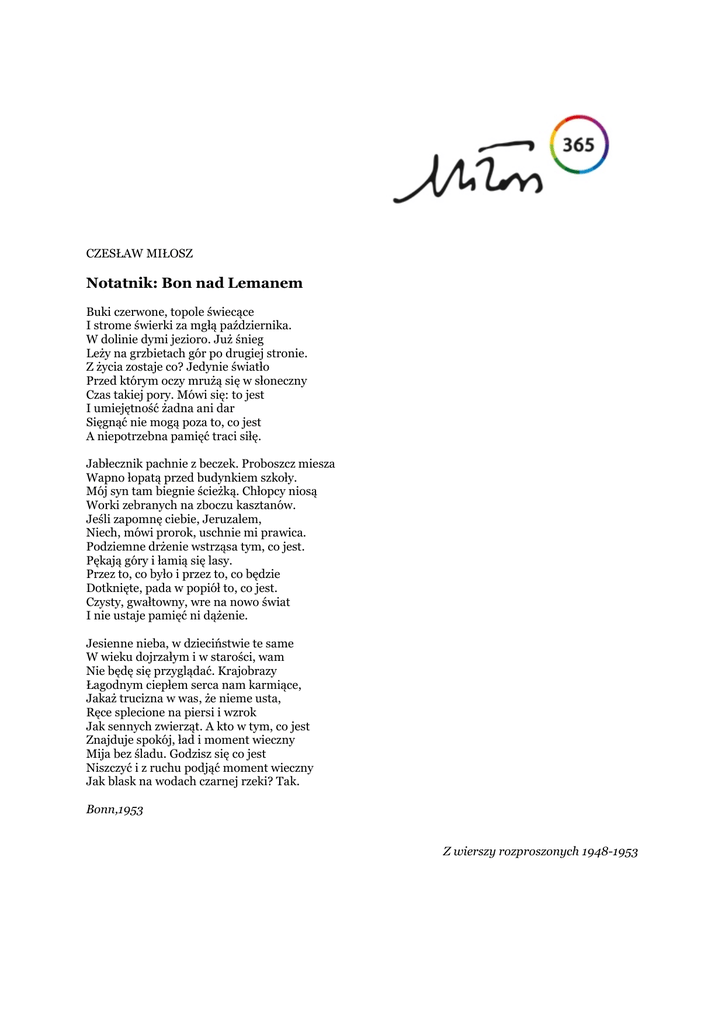 CZESŁAW MIŁOSZ Notatnik: Bon nad Lemanem Buki czerwone, topole świecące I strome świerki za mgłą października. W dolinie dymi jezioro. Już śnieg Leży na grzbietach gór po drugiej stronie. Z życia zostaje co? Jedynie światło Przed którym oczy mrużą się w słoneczny Czas takiej pory. Mówi się: to jest I umiejętność żadna ani dar Sięgnąć nie mogą poza to, co jest A niepotrzebna pamięć traci siłę. Jabłecznik pachnie z beczek. Proboszcz miesza Wapno łopatą przed budynkiem szkoły. Mój syn tam biegnie ścieżką. Chłopcy niosą Worki zebranych na zboczu kasztanów. Jeśli zapomnę ciebie, Jeruzalem, Niech, mówi prorok, uschnie mi prawica. Podziemne drżenie wstrząsa tym, co jest. Pękają góry i łamią się lasy. Przez to, co było i przez to, co będzie Dotknięte, pada w popiół to, co jest. Czysty, gwałtowny, wre na nowo świat I nie ustaje pamięć ni dążenie. Jesienne nieba, w dzieciństwie te same W wieku dojrzałym i w starości, wam Nie będę się przyglądać. Krajobrazy Łagodnym ciepłem serca nam karmiące, Jakaż trucizna w was, że nieme usta, Ręce splecione na piersi i wzrok Jak sennych zwierząt. A kto w tym, co jest Znajduje spokój, ład i moment wieczny Mija bez śladu. Godzisz się co jest Niszczyć i z ruchu podjąć moment wieczny Jak blask na wodach czarnej rzeki? Tak. Bonn,1953 Z wierszy rozproszonych 1948-1953