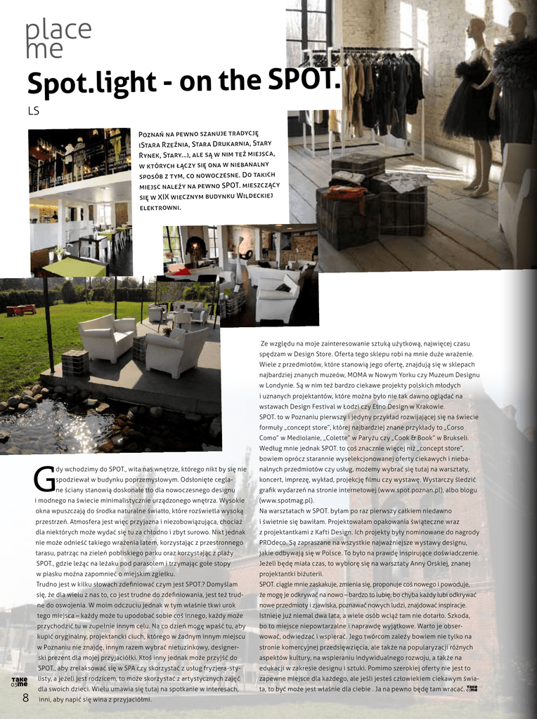 place me Spot.light - on the SPOT. LS Poznań na pewno szanuje tradyc ję (Stara Rzeźnia , Stara Drukarnia, Stary Rynek, Stary…), ale są w nim też miejsca , w których łączy się ona w niebanalny sposób z tym, co nowoc zesne. Do takich miejsc należy na pewno SPOT. mieszcz ący się w XIX wiecznym budynku Wildeckiej elektrowni. Ze względu na moje zainteresowanie sztuką użytkową, najwięcej czasu spędzam w Design Store. Oferta tego sklepu robi na mnie duże wrażenie. Wiele z przedmiotów, które stanowią jego ofertę, znajdują się w sklepach najbardziej znanych muzeów, MOMA w Nowym Yorku czy Muzeum Designu w Londynie. Są w nim też bardzo ciekawe projekty polskich młodych i uznanych projektantów, które można było nie tak dawno oglądać na wstawach Design Festival w Łodzi czy Etno Design w Krakowie. SPOT. to w Poznaniu pierwszy i jedyny przykład rozwijającej się na świecie formuły „concept store”, której najbardziej znane przykłady to „Corso Como” w Mediolanie, „Colette” w Paryżu czy „Cook & Book” w Brukseli. Według mnie jednak SPOT. to coś znacznie więcej niż „concept store”, bowiem oprócz starannie wyselekcjonowanej oferty ciekawych i nieba- 8 dy wchodzimy do SPOT., wita nas wnętrze, którego nikt by się nie nalnych przedmiotów czy usług, możemy wybrać się tutaj na warsztaty, spodziewał w budynku poprzemysłowym. Odsłonięte cegla- koncert, imprezę, wykład, projekcję filmu czy wystawę. Wystarczy śledzić ne ściany stanowią doskonałe tło dla nowoczesnego designu grafik wydarzeń na stronie internetowej (www.spot.poznan.pl), albo blogu i modnego na świecie minimalistycznie urządzonego wnętrza. Wysokie (www.spotmag.pl). okna wpuszczają do środka naturalne światło, które rozświetla wysoką Na warsztatach w SPOT. byłam po raz pierwszy całkiem niedawno przestrzeń. Atmosfera jest więc przyjazna i niezobowiązująca, chociaż i świetnie się bawiłam. Projektowałam opakowania świąteczne wraz dla niektórych może wydać się tu za chłodno i zbyt surowo. Nikt jednak z projektantkami z Kafti Design. Ich projekty były nominowane do nagrody nie może odnieść takiego wrażenia latem, korzystając z przestronnego PROdeco. Są zapraszane na wszystkie najważniejsze wystawy designu, tarasu, patrząc na zieleń pobliskiego parku oraz korzystając z plaży jakie odbywają się w Polsce. To było na prawdę inspirujące doświadczenie. SPOT., gdzie leżąc na leżaku pod parasolem i trzymając gołe stopy Jeżeli będę miała czas, to wybiorę się na warsztaty Anny Orskiej, znanej w piasku można zapomnieć o miejskim zgiełku. projektantki biżuterii. Trudno jest w kilku słowach zdefiniować czym jest SPOT.? Domyślam SPOT. ciągle mnie zaskakuje, zmienia się, proponuje coś nowego i powoduje, się, że dla wielu z nas to, co jest trudne do zdefiniowania, jest też trud- że mogę je odkrywać na nowo – bardzo to lubię, bo chyba każdy lubi odkrywać ne do oswojenia. W moim odczuciu jednak w tym właśnie tkwi urok nowe przedmioty i zjawiska, poznawać nowych ludzi, znajdować inspiracje. tego miejsca – każdy może tu upodobać sobie coś innego, każdy może Istnieje już niemal dwa lata, a wiele osób wciąż tam nie dotarło. Szkoda, przychodzić tu w zupełnie innym celu. Na co dzień mogę wpaść tu, aby bo to miejsce niepowtarzalne i naprawdę wyjątkowe. Warto je obser- kupić oryginalny, projektancki ciuch, którego w żadnym innym miejscu wować, odwiedzać i wspierać. Jego twórcom zależy bowiem nie tylko na w Poznaniu nie znajdę, innym razem wybrać nietuzinkowy, designer- stronie komercyjnej przedsięwzięcia, ale także na popularyzacji różnych ski prezent dla mojej przyjaciółki. Ktoś inny jednak może przyjść do aspektów kultury, na wspieraniu indywidualnego rozwoju, a także na SPOT., aby zrelaksować się w SPA czy skorzystać z usług fryzjera-sty- edukacji w zakresie designu i sztuki. Pomimo szerokiej oferty nie jest to listy, a jeżeli jest rodzicem, to może skorzystać z artystycznych zajęć zapewne miejsce dla każdego, ale jeśli jesteś człowiekiem ciekawym świa- dla swoich dzieci. Wielu umawia się tutaj na spotkanie w interesach, ta, to być może jest właśnie dla ciebie . Ja na pewno będę tam wracać. inni, aby napić się wina z przyjaciółmi.