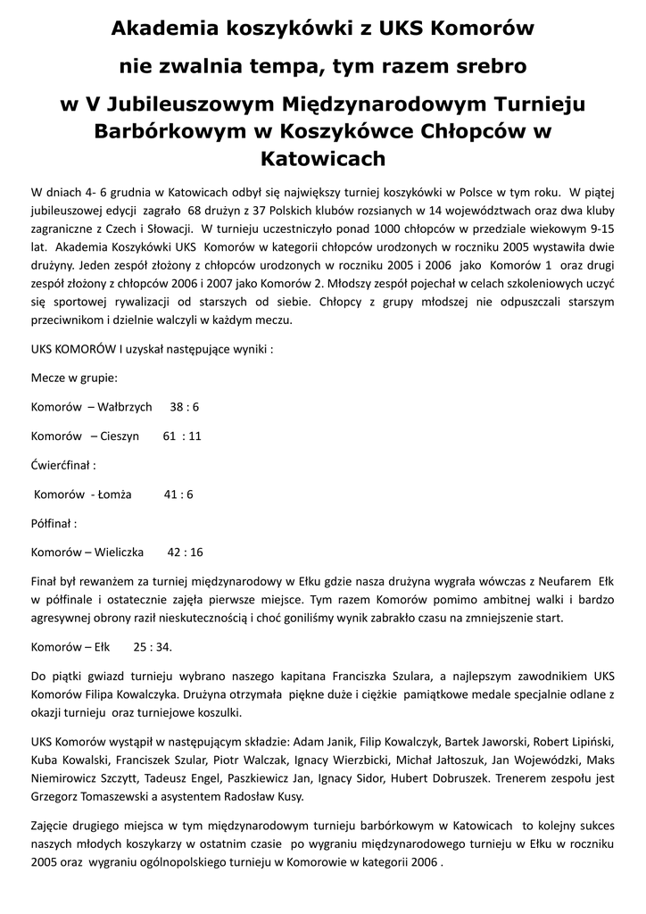 Akademia koszykówki z UKS Komorów nie zwalnia tempa, tym razem srebro w V Jubileuszowym Międzynarodowym Turnieju Barbórkowym w Koszykówce Chłopców w Katowicach W dniach 4- 6 grudnia w Katowicach odbył się największy turniej koszykówki w Polsce w tym roku. W piątej jubileuszowej edycji zagrało 68 drużyn z 37 Polskich klubów rozsianych w 14 województwach oraz dwa kluby zagraniczne z Czech i Słowacji. W turnieju uczestniczyło ponad 1000 chłopców w przedziale wiekowym 9-15 lat. Akademia Koszykówki UKS Komorów w kategorii chłopców urodzonych w roczniku 2005 wystawiła dwie drużyny. Jeden zespół złożony z chłopców urodzonych w roczniku 2005 i 2006 jako Komorów 1 oraz drugi zespół złożony z chłopców 2006 i 2007 jako Komorów 2. Młodszy zespół pojechał w celach szkoleniowych uczyć się sportowej rywalizacji od starszych od siebie. Chłopcy z grupy młodszej nie odpuszczali starszym przeciwnikom i dzielnie walczyli w każdym meczu. UKS KOMORÓW I uzyskał następujące wyniki : Mecze w grupie: Komorów – Wałbrzych Komorów – Cieszyn 38 : 6 61 : 11 Ćwierćfinał : Komorów - Łomża 41 : 6 Półfinał : Komorów – Wieliczka 42 : 16 Finał był rewanżem za turniej międzynarodowy w Ełku gdzie nasza drużyna wygrała wówczas z Neufarem Ełk w półfinale i ostatecznie zajęła pierwsze miejsce. Tym razem Komorów pomimo ambitnej walki i bardzo agresywnej obrony raził nieskutecznością i choć goniliśmy wynik zabrakło czasu na zmniejszenie start. Komorów – Ełk 25 : 34. Do piątki gwiazd turnieju wybrano naszego kapitana Franciszka Szulara, a najlepszym zawodnikiem UKS Komorów Filipa Kowalczyka. Drużyna otrzymała piękne duże i ciężkie pamiątkowe medale specjalnie odlane z okazji turnieju oraz turniejowe koszulki. UKS Komorów wystąpił w następującym składzie: Adam Janik, Filip Kowalczyk, Bartek Jaworski, Robert Lipiński, Kuba Kowalski, Franciszek Szular, Piotr Walczak, Ignacy Wierzbicki, Michał Jałtoszuk, Jan Wojewódzki, Maks Niemirowicz Szczytt, Tadeusz Engel, Paszkiewicz Jan, Ignacy Sidor, Hubert Dobruszek. Trenerem zespołu jest Grzegorz Tomaszewski a asystentem Radosław Kusy. Zajęcie drugiego miejsca w tym międzynarodowym turnieju barbórkowym w Katowicach to kolejny sukces naszych młodych koszykarzy w ostatnim czasie po wygraniu międzynarodowego turnieju w Ełku w roczniku 2005 oraz wygraniu ogólnopolskiego turnieju w Komorowie w kategorii 2006 .