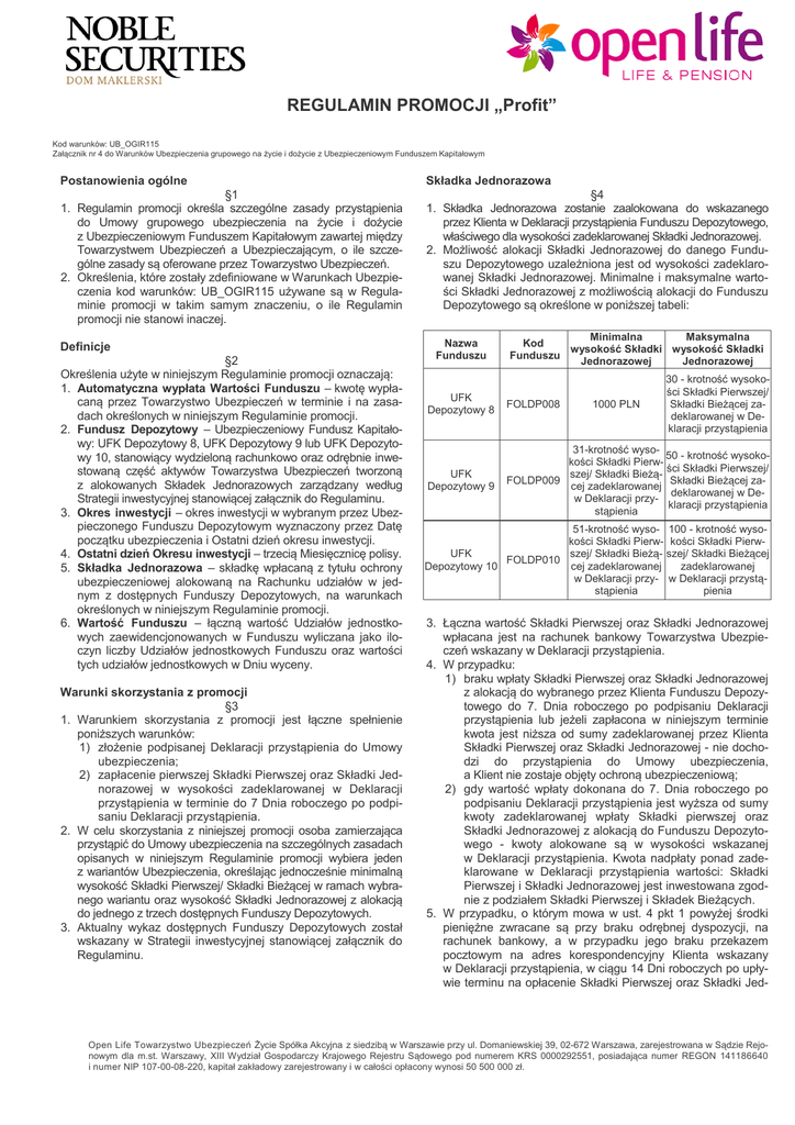 REGULAMIN PROMOCJI „Profit” Kod warunków: UB_OGIR115 Załącznik nr 4 do Warunków Ubezpieczenia grupowego na życie i dożycie z Ubezpieczeniowym Funduszem Kapitałowym Postanowienia ogólne Składka Jednorazowa §1 1. Regulamin promocji określa szczególne zasady przystąpienia do Umowy grupowego ubezpieczenia na życie i dożycie z Ubezpieczeniowym Funduszem Kapitałowym zawartej między Towarzystwem Ubezpieczeń a Ubezpieczającym, o ile szczególne zasady są oferowane przez Towarzystwo Ubezpieczeń. 2. Określenia, które zostały zdefiniowane w Warunkach Ubezpieczenia kod warunków: UB_OGIR115 używane są w Regulaminie promocji w takim samym znaczeniu, o ile Regulamin promocji nie stanowi inaczej. §4 1. Składka Jednorazowa zostanie zaalokowana do wskazanego przez Klienta w Deklaracji przystąpienia Funduszu Depozytowego, właściwego dla wysokości zadeklarowanej Składki Jednorazowej. 2. Możliwość alokacji Składki Jednorazowej do danego Funduszu Depozytowego uzależniona jest od wysokości zadeklarowanej Składki Jednorazowej. Minimalne i maksymalne wartości Składki Jednorazowej z możliwością alokacji do Funduszu Depozytowego są określone w poniższej tabeli: Definicje §2 Określenia użyte w niniejszym Regulaminie promocji oznaczają: 1. Automatyczna wypłata Wartości Funduszu – kwotę wypłacaną przez Towarzystwo Ubezpieczeń w terminie i na zasadach określonych w niniejszym Regulaminie promocji. 2. Fundusz Depozytowy – Ubezpieczeniowy Fundusz Kapitałowy: UFK Depozytowy 8, UFK Depozytowy 9 lub UFK Depozytowy 10, stanowiący wydzieloną rachunkowo oraz odrębnie inwestowaną część aktywów Towarzystwa Ubezpieczeń tworzoną z alokowanych Składek Jednorazowych zarządzany według Strategii inwestycyjnej stanowiącej załącznik do Regulaminu. 3. Okres inwestycji – okres inwestycji w wybranym przez Ubezpieczonego Funduszu Depozytowym wyznaczony przez Datę początku ubezpieczenia i Ostatni dzień okresu inwestycji. 4. Ostatni dzień Okresu inwestycji – trzecią Miesięcznicę polisy. 5. Składka Jednorazowa – składkę wpłacaną z tytułu ochrony ubezpieczeniowej alokowaną na Rachunku udziałów w jednym z dostępnych Funduszy Depozytowych, na warunkach określonych w niniejszym Regulaminie promocji. 6. Wartość Funduszu – łączną wartość Udziałów jednostkowych zaewidencjonowanych w Funduszu wyliczana jako iloczyn liczby Udziałów jednostkowych Funduszu oraz wartości tych udziałów jednostkowych w Dniu wyceny. Warunki skorzystania z promocji §3 1. Warunkiem skorzystania z promocji jest łączne spełnienie poniższych warunków: 1) złożenie podpisanej Deklaracji przystąpienia do Umowy ubezpieczenia; 2) zapłacenie pierwszej Składki Pierwszej oraz Składki Jednorazowej w wysokości zadeklarowanej w Deklaracji przystąpienia w terminie do 7 Dnia roboczego po podpisaniu Deklaracji przystąpienia. 2. W celu skorzystania z niniejszej promocji osoba zamierzająca przystąpić do Umowy ubezpieczenia na szczególnych zasadach opisanych w niniejszym Regulaminie promocji wybiera jeden z wariantów Ubezpieczenia, określając jednocześnie minimalną wysokość Składki Pierwszej/ Składki Bieżącej w ramach wybranego wariantu oraz wysokość Składki Jednorazowej z alokacją do jednego z trzech dostępnych Funduszy Depozytowych. 3. Aktualny wykaz dostępnych Funduszy Depozytowych został wskazany w Strategii inwestycyjnej stanowiącej załącznik do Regulaminu. Nazwa Funduszu Maksymalna Minimalna Kod wysokość Składki wysokość Składki Funduszu Jednorazowej Jednorazowej 30 - krotność wysokości Składki Pierwszej/ Składki Bieżącej zadeklarowanej w Deklaracji przystąpienia UFK Depozytowy 8 FOLDP008 UFK Depozytowy 9 31-krotność wyso50 - krotność wysokokości Składki Pierwści Składki Pierwszej/ szej/ Składki BieżąFOLDP009 Składki Bieżącej zacej zadeklarowanej deklarowanej w Dew Deklaracji przyklaracji przystąpienia stąpienia 1000 PLN 51-krotność wyso- 100 - krotność wysokości Składki Pierw- kości Składki PierwUFK szej/ Składki Bieżą- szej/ Składki Bieżącej FOLDP010 Depozytowy 10 cej zadeklarowanej zadeklarowanej w Deklaracji przy- w Deklaracji przystąstąpienia pienia 3. Łączna wartość Składki Pierwszej oraz Składki Jednorazowej wpłacana jest na rachunek bankowy Towarzystwa Ubezpieczeń wskazany w Deklaracji przystąpienia. 4. W przypadku: 1) braku wpłaty Składki Pierwszej oraz Składki Jednorazowej z alokacją do wybranego przez Klienta Funduszu Depozytowego do 7. Dnia roboczego po podpisaniu Deklaracji przystąpienia lub jeżeli zapłacona w niniejszym terminie kwota jest niższa od sumy zadeklarowanej przez Klienta Składki Pierwszej oraz Składki Jednorazowej - nie dochodzi do przystąpienia do Umowy ubezpieczenia, a Klient nie zostaje objęty ochroną ubezpieczeniową; 2) gdy wartość wpłaty dokonana do 7. Dnia roboczego po podpisaniu Deklaracji przystąpienia jest wyższa od sumy kwoty zadeklarowanej wpłaty Składki pierwszej oraz Składki Jednorazowej z alokacją do Funduszu Depozytowego - kwoty alokowane są w wysokości wskazanej w Deklaracji przystąpienia. Kwota nadpłaty ponad zadeklarowane w Deklaracji przystąpienia wartości: Składki Pierwszej i Składki Jednorazowej jest inwestowana zgodnie z podziałem Składki Pierwszej i Składek Bieżących. 5. W przypadku, o którym mowa w ust. 4 pkt 1 powyżej środki pieniężne zwracane są przy braku odrębnej dyspozycji, na rachunek bankowy, a w przypadku jego braku przekazem pocztowym na adres korespondencyjny Klienta wskazany w Deklaracji przystąpienia, w ciągu 14 Dni roboczych po upływie terminu na opłacenie Składki Pierwszej oraz Składki Jed- Open Life Towarzystwo Ubezpieczeń Życie Spółka Akcyjna z siedzibą w Warszawie przy ul. Domaniewskiej 39, 02-672 Warszawa, zarejestrowana w Sądzie Rejonowym dla m.st. Warszawy, XIII Wydział Gospodarczy Krajowego Rejestru Sądowego pod numerem KRS 0000292551, posiadająca
