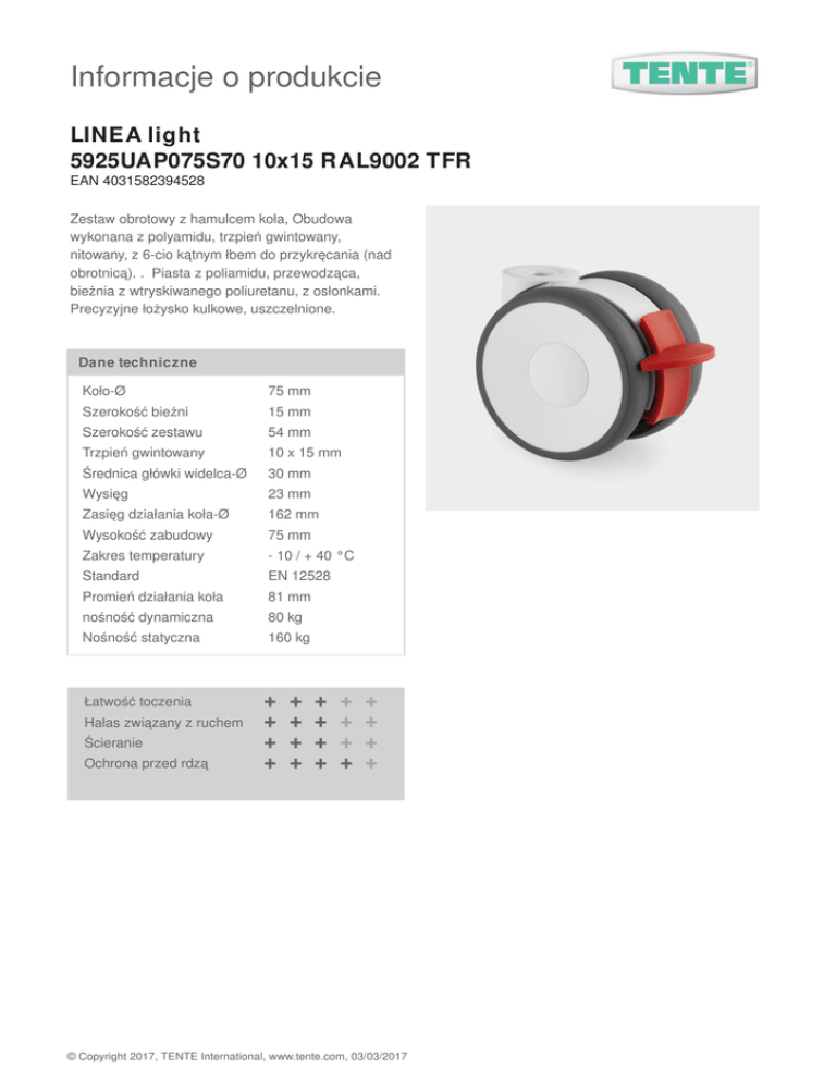 Informacje o produkcie LINEA light 5925UAP075S70 10x15 RAL9002 TFR EAN 4031582394528 Zestaw obrotowy z hamulcem koła, Obudowa wykonana z polyamidu, trzpień gwintowany, nitowany, z 6-cio kątnym łbem do przykręcania (nad obrotnicą). . Piasta z poliamidu, przewodząca, bieżnia z wtryskiwanego poliuretanu, z osłonkami. Precyzyjne łożysko kulkowe, uszczelnione. Dane techniczne Koło-Ø 75 mm Szerokość zestawu 54 mm Szerokość bieżni Trzpień gwintowany Średnica główki widelca-Ø Wysięg Zasięg działania koła-Ø Wysokość zabudowy Zakres temperatury Standard Promień działania koła nośność dynamiczna Nośność statyczna Łatwość toczenia Hałas związany z ruchem Ścieranie Ochrona przed rdzą 15 mm 10 x 15 mm 30 mm 23 mm 162 mm 75 mm - 10 / + 40 °C EN 12528 81 mm 80 kg 160 kg + + + + + + + + + + + + + + + + + + + + © Copyright 2017, TENTE International, www.tente.com, 03/03/2017 Informacje o produkcie LINEA light 5925UAP075S70 10x15 RAL9002 TFR EAN 4031582394528 © Copyright 2017, TENTE International, www.tente.com, 03/03/2017