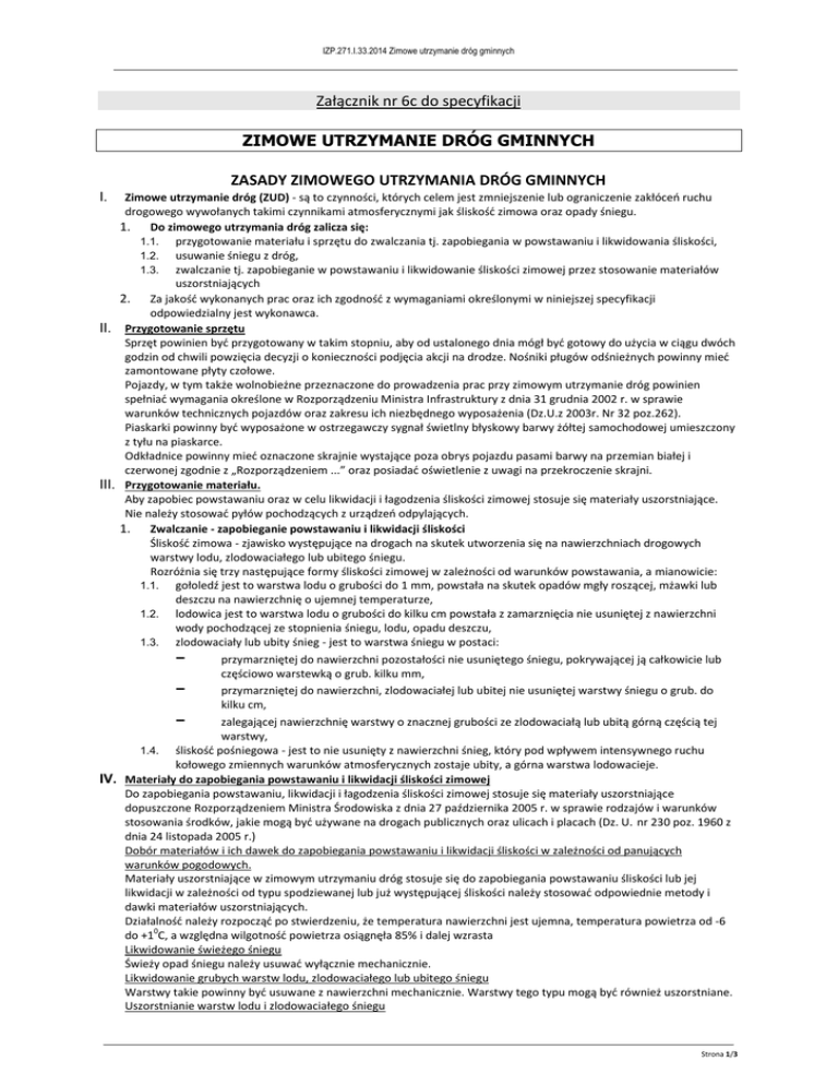 IZP.271.I.33.2014 Zimowe utrzymanie dróg gminnych Załącznik nr 6c do specyfikacji ZIMOWE UTRZYMANIE DRÓG GMINNYCH ZASADY ZIMOWEGO UTRZYMANIA DRÓG GMINNYCH I. Zimowe utrzymanie dróg (ZUD) - są to czynności, których celem jest zmniejszenie lub ograniczenie zakłóceń ruchu drogowego wywołanych takimi czynnikami atmosferycznymi jak śliskość zimowa oraz opady śniegu. 1. Do zimowego utrzymania dróg zalicza się: 1.1. przygotowanie materiału i sprzętu do zwalczania tj. zapobiegania w powstawaniu i likwidowania śliskości, 1.2. usuwanie śniegu z dróg, 1.3. zwalczanie tj. zapobieganie w powstawaniu i likwidowanie śliskości zimowej przez stosowanie materiałów uszorstniających 2. Za jakość wykonanych prac oraz ich zgodność z wymaganiami określonymi w niniejszej specyfikacji odpowiedzialny jest wykonawca. II. Przygotowanie sprzętu Sprzęt powinien być przygotowany w takim stopniu, aby od ustalonego dnia mógł być gotowy do użycia w ciągu dwóch godzin od chwili powzięcia decyzji o konieczności podjęcia akcji na drodze. Nośniki pługów odśnieżnych powinny mieć zamontowane płyty czołowe. Pojazdy, w tym także wolnobieżne przeznaczone do prowadzenia prac przy zimowym utrzymanie dróg powinien spełniać wymagania określone w Rozporządzeniu Ministra Infrastruktury z dnia 31 grudnia 2002 r. w sprawie warunków technicznych pojazdów oraz zakresu ich niezbędnego wyposażenia (Dz.U.z 2003r. Nr 32 poz.262). Piaskarki powinny być wyposażone w ostrzegawczy sygnał świetlny błyskowy barwy żółtej samochodowej umieszczony z tyłu na piaskarce. Odkładnice powinny mieć oznaczone skrajnie wystające poza obrys pojazdu pasami barwy na przemian białej i czerwonej zgodnie z „Rozporządzeniem ...” oraz posiadać oświetlenie z uwagi na przekroczenie skrajni. III. Przygotowanie materiału. Aby zapobiec powstawaniu oraz w celu likwidacji i łagodzenia śliskości zimowej stosuje się materiały uszorstniające. Nie należy stosować pyłów pochodzących z urządzeń odpylających. 1. Zwalczanie - zapobieganie powstawaniu i likwidacji śliskości Śliskość zimowa - zjawisko występujące na drogach na skutek utworzenia się na nawierzchniach drogowych warstwy lodu, zlodowaciałego lub ubitego śniegu. Rozróżnia się trzy następujące formy śliskości zimowej w zależności od warunków powstawania, a mianowicie: 1.1. gołoledź jest to warstwa lodu o grubości do 1 mm, powstała na skutek opadów mgły roszącej, mżawki lub deszczu na nawierzchnię o ujemnej temperaturze, 1.2. lodowica jest to warstwa lodu o grubości do kilku cm powstała z zamarznięcia nie usuniętej z nawierzchni wody pochodzącej ze stopnienia śniegu, lodu, opadu deszczu, 1.3. zlodowaciały lub ubity śnieg - jest to warstwa śniegu w postaci: – przymarzniętej do nawierzchni pozostałości nie usuniętego śniegu, pokrywającej ją całkowicie lub częściowo warstewką o grub. kilku mm, – przymarzniętej do nawierzchni, zlodowaciałej lub ubitej nie usuniętej warstwy śniegu o grub. do kilku cm, – zalegającej nawierzchnię warstwy o znacznej grubości ze zlodowaciałą lub ubitą górną częścią tej warstwy, 1.4. śliskość pośniegowa - jest to nie usunięty z nawierzchni śnieg, który pod wpływem intensywnego ruchu kołowego zmiennych warunków atmosferycznych zostaje ubity, a górna warstwa lodowacieje. IV. Materiały do zapobiegania powstawaniu i likwidacji śliskości zimowej Do zapobiegania powstawaniu, likwidacji i łagodzenia śliskości zimowej stosuje się materiały uszorstniające dopuszczone Rozporządzeniem Ministra Środowiska z dnia 27 października 2005 r. w sprawie rodzajów i warunków stosowania środków, jakie mogą być używane na drogach publicznych oraz ulicach i placach (Dz. U. nr 230 poz. 1960 z dnia 24 listopada 2005 r.) Dobór materiałów i ich dawek do zapobiegania powstawaniu i likwidacji śliskości w zależności od panujących warunków pogodowych. Materiały uszorstniające w zimowym utrzymaniu dróg stosuje się do zapobiegania powstawaniu śliskości lub jej likwidacji w zależności od typu spodziewanej lub już występującej śliskości należy stosować odpowiednie metody i dawki materiałów uszorstniających. Działalność należy rozpocząć po stwierdzeniu, że temperatura nawierzchni jest ujemna, temperatura powietrza od -6 0 do +1 C, a względna wilgotność powietrza osiągnęła 85% i dalej wzrasta Likwidowanie świeżego śniegu Świeży opad śniegu należy usuwać wyłącznie mechanicznie. Likwidowanie grubych warstw lodu, zlodowaciałego lub ubitego śniegu Warstwy takie powinny być usuwane z nawierzchni mechanicznie. Warstwy tego typu mogą być również uszorstniane. Uszorstnianie warstw lodu i zlodowaciałego śniegu Strona 1/3 IZP.271.I.33.2014 Zimowe utrzymanie dróg gminnych 2 Warstwy lodu i zlodowaciałego śniegu powinny być posypywane kruszywem w ilości 60-100 g/m jednorazowo. Posypywanie należy powtarzać w miarę usuwania kruszywa przez wiatr i ruch pojazdów. Uszorstnianie ubitego śniegu Do uszorstnienia ubitego śniegu stosować jedno lub dwukrotnie posypanie w ciągu dnia materiałem uszorstniającym w 2 ilości 100-150 g/m . Zamawiający zastrzega, że nie wyraża zgody na stosowanie soli kamiennej (NaCl) lub mieszanek z jej udziałem na drogach o nawierzchni betonowej. V. Zasady odbioru robót zimowych Ogólne warunki odbioru Odbiorowi podlega każdy element zleconej pracy. Upoważniony pracownik Zamawiającego kontroluje stan dróg i sposób prowadzenia robót ZUD. W przypadkach jakichkolwiek zastrzeżeń spisywany jest protokół podpisany przez obie strony, który będzie podstawą naliczania kar przewidzianych umową. W przypadkach rażących zaniedbań Zamawiający będzie miała prawo wypowiedzieć umowę ze skutkiem natychmiastowym. Wykonawca robót ponosi pełną odpowiedzialność za szkody lub wypadki drogowe spowodowane na skutek wadliwego lub niezgodnego z obowiązującymi