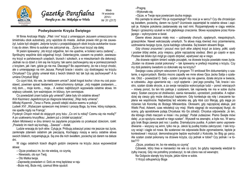 Gazetka Parafialna Parafia p.w. p.w. św. Mikołaja w Wielu Wiele 14 września 2014 r. Nr 31 (217) Podwyższenie Krzyża Świętego W filmie Andrzeja Wajdy: „Piłat i inni” krzyż z umierającym Jezusem umieszczono na śmietnisku obok autostrady, przy wjeździe do miasta. Jednak prawie nikt go nie zauważył, ludzie byli obojętni. Jedynie turyści z przejeżdżających obok krzyża autokarów rzucali się do okien. Mimo to autokar nie zatrzymał się… Życie musi toczyć się dalej. W pieśni śpiewamy: „kto krzyż odgadnie, ten nie upadnie, w boleści sercu zadanej”… Spróbujmy wspólnie dziś odgadnąć krzyż. Ostentacyjnie, czasem na przekór, zawieszamy krzyż w państwowych urzędach, biurach i szkołach, a w mieszkaniach dla dekoracji. Jednak na co dzień z nim się nie liczymy: tak samo zachowujemy się w pomieszczeniach z krzyżem, jak i tam, gdzie go nie ma. Dlaczego? Bo zapominamy, że nie o krzyż chodzi, ale o umierającego na nim Jezusa. Pomyśl bracie i siostro: czy dostrzegasz na krzyżu Chrystusa? Czy gdyby umierał ktoś z twoich bliskich też tak byś się zachowywał? A tu umiera Chrystus! Bóg! Co czyni ktoś, kto wie, że niebawem umrze? Jeżeli kogoś kocha i chce mu coś pozostawić, powinien spisać testament. Unieruchomiony dyktuje: „mój majątek zostawiam..., mój dom..., moje konto..., moje... A wobec najbliższych wypowiada ostatnie słowa. Im większy człowiek, tym ważniejsze; im bliższy, tym cenniejsze. Co powiedzieli znani ludzie gdy umierali? Jakie były ich ostatnie słowa? Król Kazimierz Jagiellończyk po diagnozie lekarskiej: „Więc tedy umierać”. Mikołaj Kopernik: „Teraz o Panie, pozwól odejść słudze swemu w pokoju”. Ludwik XVI: „Wybaczam sprawcom mej śmierci i proszę Boga, by krew, którą rozlejecie, nie spadła nigdy na Francję”. Fryderyk Chopin mówił do stojących przy łożu: „Co oni tu robią? Czemu się nie modlą?” A po ucałowaniu krucyfiksu: „Jestem już u źródeł szczęścia”. Adam Mickiewicz w dniu śmierci na zapytanie przyjaciela co przekazać dzieciom, rzekł: „Powiedz im niech się kochają... Zawsze” – dodał. Ludzie wracają do tych słów. Cytują je. Próbują zobaczyć przez nie jeszcze raz życie, zamknięte zdaniem ostatnim jak pieczęcią. Kochający noszą w sercu ostatnie słowa swoich bliskich, rozpamiętują je. Są one dla nich światłem, pociechą lub darem na dalsze dni. W ciągu ostatnich trzech długich godzin cierpienia na krzyżu Jezus wypowiedział słowa: – Ojcze przebacz im, bo nie wiedzą, co czynią. – Niewiasto, oto syn Twój. – Oto Matka twoja. –Zaprawdę powiadam ci: Dziś ze mną będziesz w raju –Boże mój, Boże mój, czemuś Mnie opuścił. –Pragnę. –Wykonało się. –Ojcze, w Twoje ręce powierzam ducha mojego. Kto pamięta te słowa? Kto je rozpamiętuje? Kto nosi je w sercu? Czy dla chrześcijan są światłem, pociechą, darem na życie? Uczniowie zapamiętali te ostatnie słowa i zapisali je. Kolejne pokolenia zastanawiały się nad nimi. Rozpamiętywały w ciągu wieków. Święci i grzesznicy szukali w nich głębokiego znaczenia. Słowa wyszeptane przez Konającego – wykrzyczane w świat. Dawne słowa Jezusa miały moc – uzdrawiały chorych, opętanych, niespokojnych, grzeszników. Nawet wskrzeszały umarłych. Te słowa mają również moc przemienienia, uzdrowienia twojego życia, życia każdego człowieka. Są bowiem słowami Boga. Gdy chcesz zrozumieć i poczuć moc tych słów zdejmij krzyż ze ściany, półki, szafy i postaw bliżej siebie, przy miejscu, gdzie najczęściej siadasz. Bierz go często w ręce. Postaw tak blisko byś mógł go często dotykać, wpatrywać się w niego. „Na drzewie rajskim śmierć wzięła początek, na drzewie krzyża powstało nowe życie. „Szatan na drzewie został pokonany” – tak śpiewamy w prefacji mszalnej o krzyżu. Czy my dziś jesteśmy świadomi co dokonało się na krzyżu? Swojego czasu późnym wieczorem II program TV emitował film dokumentalny o szatanie, o egzorcystach. Bardzo mocno zapadły we mnie słowa Ojca Jacka Salija o szatanie. Otóż – powiedział O. Salij – szatan zwykle się nie ujawnia, działa skrycie w świecie, w człowieku. Jego ujawnienie się – czyli opętanie – jest jego porażką. Tak, bracie i siostro, szatan działa skrycie, a za swoje narzędzia wykorzystuje ludzi – ponoć wierzących – mówię ponoć, bo ten kto paktuje z szatanem, tak naprawdę nie ma w sobie ducha wiary. Szatan zaczyna od złośliwości, siania nienawiści, uprzedzeń, podziałów. A najbardziej się cieszy gdy może dokuczyć kapłanom. Gdy kontestuje się rolę i znaczenie kapłana we wspólnocie. Najbardziej też wścieka się, gdy ktoś czci Maryję, gdy sięga po różaniec lub Koronkę do Bożego Miłosierdzia. Okresami, gdy najczęściej atakuje, jest Wielki Post, Adwent, czas rekolekcji czy misji. Warto sięgnąć do wczorajszej liturgii, do sceny, gdy apostołowie pytają Chrystusa: kto Go zdradzi. Chrystus odpowiada: „to ten, dla którego chleb maczam w misie i mu podaję”. Podał Judaszowi. Pismo Święte mówi dalej: „a po spożyciu wszedł w niego szatan”. Wyszedł na zewnątrz, a była noc. W sercu gdy brak Boga zawsze jest noc i pustka. Dramatyczna pustka. A potem samo usprawiedliwianie – wszyscy są winni, tylko nie ja. Jakoś tę pustkę trzeba zakrzyczeć. I taki krzyczy wciąż i ciągle od nowa. Bo szatanowi nie odpowiada Boże zgromadzenie, będzie je kontestował i niszczył, demonstracyjnie będzie wychodził z Kościoła, bo Bóg go parzy. Ale szatan został pokonany na drzewie krzyża, czy jednak w tobie? Czy jednak i w tobie??? „Ojcze, przebacz im, bo nie wiedzą co czynią” Człowiek, który trwa w nienawiści nie wie co czyni, bo gdyby naprawdę wiedział to żyłby inaczej. Gdy nie potrafimy przebaczyć, to rak zżera nas od wewnątrz. Na Golgocie stanęły trzy krzyże, jakże różne w sobie. 1/ Krzyż odku