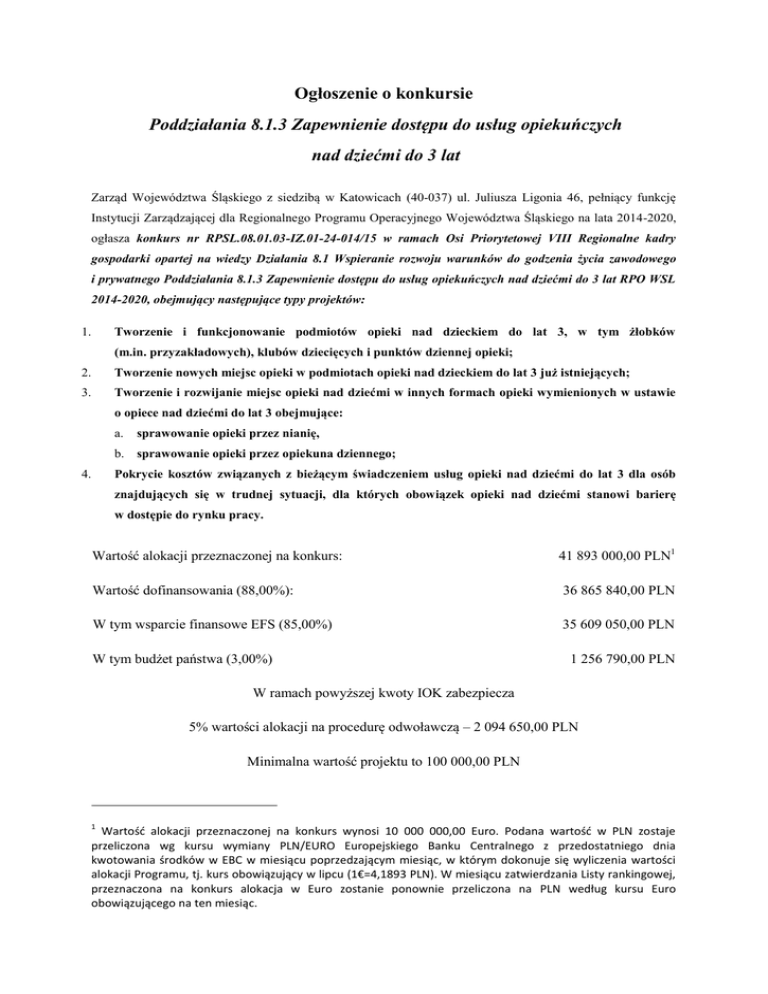 Ogłoszenie o konkursie Poddziałania 8.1.3 Zapewnienie dostępu do usług opiekuńczych nad dziećmi do 3 lat Zarząd Województwa Śląskiego z siedzibą w Katowicach (40-037) ul. Juliusza Ligonia 46, pełniący funkcję Instytucji Zarządzającej dla Regionalnego Programu Operacyjnego Województwa Śląskiego na lata 2014-2020, ogłasza konkurs nr RPSL.08.01.03-IZ.01-24-014/15 w ramach Osi Priorytetowej VIII Regionalne kadry gospodarki opartej na wiedzy Działania 8.1 Wspieranie rozwoju warunków do godzenia życia zawodowego i prywatnego Poddziałania 8.1.3 Zapewnienie dostępu do usług opiekuńczych nad dziećmi do 3 lat RPO WSL 2014-2020, obejmujący następujące typy projektów: Tworzenie i funkcjonowanie podmiotów opieki nad dzieckiem do lat 3, w tym żłobków 1. (m.in. przyzakładowych), klubów dziecięcych i punktów dziennej opieki; 2. Tworzenie nowych miejsc opieki w podmiotach opieki nad dzieckiem do lat 3 już istniejących; 3. Tworzenie i rozwijanie miejsc opieki nad dziećmi w innych formach opieki wymienionych w ustawie o opiece nad dziećmi do lat 3 obejmujące: a. sprawowanie opieki przez nianię, b. sprawowanie opieki przez opiekuna dziennego; Pokrycie kosztów związanych z bieżącym świadczeniem usług opieki nad dziećmi do lat 3 dla osób 4. znajdujących się w trudnej sytuacji, dla których obowiązek opieki nad dziećmi stanowi barierę w dostępie do rynku pracy. Wartość alokacji przeznaczonej na konkurs: 41 893 000,00 PLN1 Wartość dofinansowania (88,00%): 36 865 840,00 PLN W tym wsparcie finansowe EFS (85,00%) 35 609 050,00 PLN W tym budżet państwa (3,00%) 1 256 790,00 PLN W ramach powyższej kwoty IOK zabezpiecza 5% wartości alokacji na procedurę odwoławczą – 2 094 650,00 PLN Minimalna wartość projektu to 100 000,00 PLN 1 Wartość alokacji przeznaczonej na konkurs wynosi 10 000 000,00 Euro. Podana wartość w PLN zostaje przeliczona wg kursu wymiany PLN/EURO Europejskiego Banku Centralnego z przedostatniego dnia kwotowania środków w EBC w miesiącu poprzedzającym miesiąc, w którym dokonuje się wyliczenia wartości alokacji Programu, tj. kurs obowiązujący w lipcu (1€=4,1893 PLN). W miesiącu zatwierdzania Listy rankingowej, przeznaczona na konkurs alokacja w Euro zostanie ponownie przeliczona na PLN według kursu Euro obowiązującego na ten miesiąc. Maksymalna dopuszczalna kwota dofinansowania nie może być wyższa niż wartość alokacji przewidzianej na konkurs Poziom dofinansowania wynosi 88,00% Poziom wkładu własnego 12,00% Nabór wniosków o dofinansowanie realizacji projektów będzie prowadzony od dnia 03.09.2015 r. do dnia 05.10.2015 r. Wnioski złożone po upływie terminu zamknięcia naboru będą pozostawione bez rozpatrzenia. Projekty składane są na formularzu wniosku aplikacyjnego utworzonego za pomocą Lokalnego Systemu Informatycznego dostępnego pod adresem lsi.slaskie.pl. Wniosek należy przesłać w formie elektronicznej (format .pdf) do Instytucji Organizującej Konkurs z wykorzystaniem platform elektronicznych: a) Platformy Elektronicznych Usług Publicznych PeUP, dostępnej pod adresem: www.sekap.pl lub b) Elektronicznej Platformy www.epuap.gov.pl Usług Administracji Publicznej ePUAP, dostępnej pod adresem: 2 Szczegółowe informacje na temat konkursu znajdują się w załączniku do niniejszego ogłoszenia pt. Regulamin konkursu, który jest dostępny na stronach internetowych IOK www.efs.slaskie.pl, www.rpo.slaskie.pl oraz na portalu www.funduszeeuropejskie.gov.pl. 2 IOK zaleca korzystanie z platformy SEKAP (www.sekap.pl). IOK nie ponosi odpowiedzialności za sposób funkcjonowania platformy ePUAP (www.epuap.gov.pl).