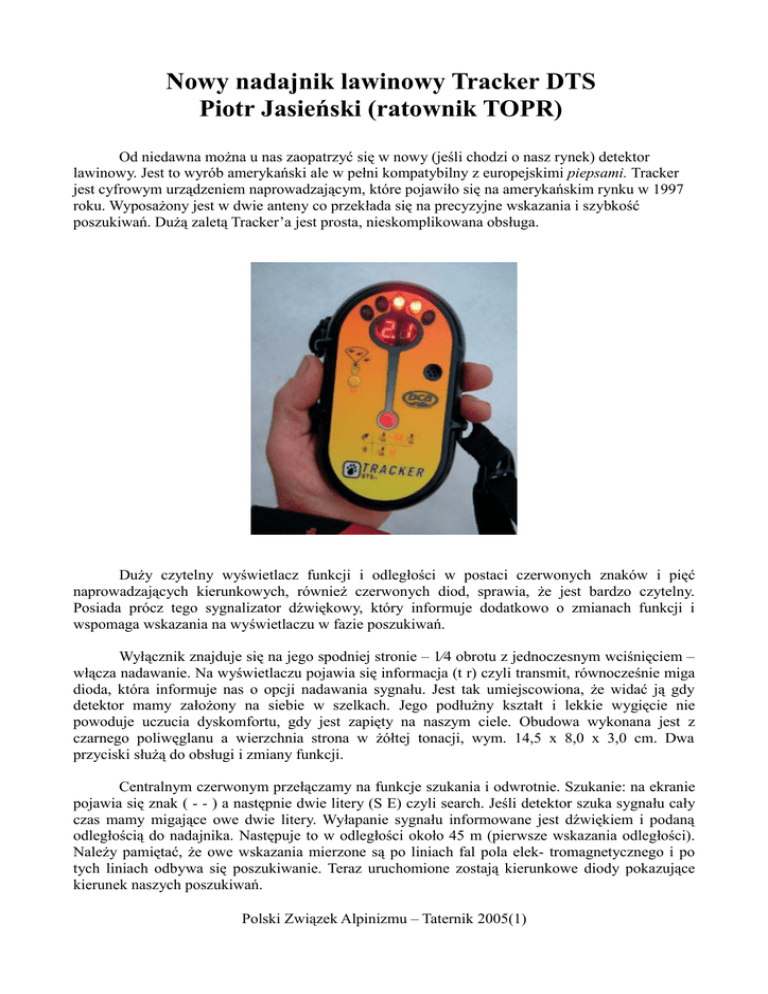 Nowy nadajnik lawinowy Tracker DTS Piotr Jasieński (ratownik TOPR) Od niedawna można u nas zaopatrzyć się w nowy (jeśli chodzi o nasz rynek) detektor lawinowy. Jest to wyrób amerykański ale w pełni kompatybilny z europejskimi piepsami. Tracker jest cyfrowym urządzeniem naprowadzającym, które pojawiło się na amerykańskim rynku w 1997 roku. Wyposażony jest w dwie anteny co przekłada się na precyzyjne wskazania i szybkość poszukiwań. Dużą zaletą Tracker’a jest prosta, nieskomplikowana obsługa. Duży czytelny wyświetlacz funkcji i odległości w postaci czerwonych znaków i pięć naprowadzających kierunkowych, również czerwonych diod, sprawia, że jest bardzo czytelny. Posiada prócz tego sygnalizator dźwiękowy, który informuje dodatkowo o zmianach funkcji i wspomaga wskazania na wyświetlaczu w fazie poszukiwań. Wyłącznik znajduje się na jego spodniej stronie – 1⁄4 obrotu z jednoczesnym wciśnięciem – włącza nadawanie. Na wyświetlaczu pojawia się informacja (t r) czyli transmit, równocześnie miga dioda, która informuje nas o opcji nadawania sygnału. Jest tak umiejscowiona, że widać ją gdy detektor mamy założony na siebie w szelkach. Jego podłużny kształt i lekkie wygięcie nie powoduje uczucia dyskomfortu, gdy jest zapięty na naszym ciele. Obudowa wykonana jest z czarnego poliwęglanu a wierzchnia strona w żółtej tonacji, wym. 14,5 x 8,0 x 3,0 cm. Dwa przyciski służą do obsługi i zmiany funkcji. Centralnym czerwonym przełączamy na funkcje szukania i odwrotnie. Szukanie: na ekranie pojawia się znak ( - - ) a następnie dwie litery (S E) czyli search. Jeśli detektor szuka sygnału cały czas mamy migające owe dwie litery. Wyłapanie sygnału informowane jest dźwiękiem i podaną odległością do nadajnika. Następuje to w odległości około 45 m (pierwsze wskazania odległości). Należy pamiętać, że owe wskazania mierzone są po liniach fal pola elek- tromagnetycznego i po tych liniach odbywa się poszukiwanie. Teraz uruchomione zostają kierunkowe diody pokazujące kierunek naszych poszukiwań. Polski Związek Alpinizmu – Taternik 2005(1) Kiedy dystans jest mniejszy od 10 m, wskazania podawane są z dokładnością 10 cm, przy jednoczesnym zagęszczeniu przerywanego sygnału dźwiękowego. Powinniśmy poruszać się wolniej i bardziej precyzyjnie, bez wykonywania gwałtownych ruchów ze względu na znaczne zagęszczenie linii sił pola elektromagnetycznego. Po pięciu minutach urządzenie automatycznie może przełączyć się na nadawanie. Informuje o tym 10-cio sekundowy sygnał dźwiękowy i na wyświetlaczu (A r). Przyciśnięcie czerwonego przycisku powoduje pozostanie w opcji szukania. Funkcje automatycznego przechodzenia można wyłączyć. Drugim, bocznym – żółtym włącza się funkcję specjalną (S P) lub wychodzi się z niej. Służy ona do wykrywania mocniejszego sygnału, dzięki zawężonemu kątowi skanowania (wskazują trzy diody kierunkowe). Tę funkcję stosuje się przy zasypaniach grupowych. Jak każde poszukiwanie składa się ono z trzech etapów: 1. wstępne czyli szukanie sygnału 2. zasadnicze 3. szczegółowe (najczęściej metodą krzyża, aby wyznaczyć najmniejszą odległość). Tu posiłkuje-my się sondą lawinową i łopatą. Z tego co wiem, u nas nie robiło się żadnych testów porównujących parametry detektorów lawinowych, być może u uwagi na ich małą podaż na rynku. Ale w Internecie znalazłem dwa opisy testów urządzeń naprowadzających. Jeden miał miejsce we Francji a drugi w Szwajcarii. Porównywano wszystkie, zarówno cyfrowe, jak i analogowe piepsy. W jednym z testów uczestniczyli ratownicy górscy a w drugim zupełni dyletanci, po parunasto-minutowym przeszkoleniu. Pod uwagę brano czas wyszukania pozoranta, zakopanego na głębokości 1 m. Wyniki obu testów były takie same, Tracker naprowadzał najszybciej. Polecam stronę anglojęzyczną, na której można zobaczyć ciekawe animacje i demo tego cyfrowego detektora http://www.bcaccess.com/ bca/products/tracker/tracker_demo.php a w naszym rodzimym języku więcej informacji i szczegółowy opis poszukiwań znajdziemy na stronie http://www.madrock.pl Urządzenie zasilane jest trzema bateriami (al- kalicznymi) AAA, a waży 230 g. Polski Związek Alpinizmu – Taternik 2005(1)