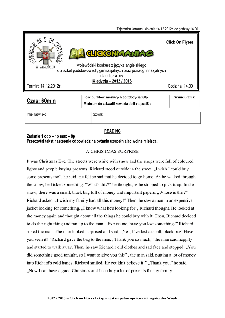 Tajemnica konkursu do dnia 14.12.2012r. do godziny 14.00 Click On Flyers wojewódzki konkurs z języka angielskiego dla szkół podstawowych, gimnazjalnych oraz ponadgimnazjalnych etap I szkolny IX edycja – 2012 / 2013 Termin: 14.12.2012r. Godzina: 14.00 Czas: 60min Imię nazwisko Ilość punktów możliwych do zdobycia: 60p Wynik ucznia: Minimum do zakwalifikowania do II etapu:48 p Szkoła: READING Zadanie 1 odp – 1p max – 8p Przeczytaj tekst następnie odpowiedz na pytania uzupełniając wolne miejsca. A CHRISTMAS SURPRISE It was Christmas Eve. The streets were white with snow and the shops were full of coloured lights and people buying presents. Richard stood outside in the street. „I wish I could buy some presents too”, he said. He felt so sad that he decided to go home. As he walked through the snow, he kicked something. ”What's this?” he thought, as he stopped to pick it up. In the snow, there was a small, black bag full of money and important papers. „Whose is this?” Richard asked. „I wish my family had all this money!” Then, he saw a man in an expensive jacket looking for something. „I know what he's looking for”, Richard thought. He looked at the money again and thought about all the things he could buy with it. Then, Richard decided to do the right thing and ran up to the man. „Excuse me, have you lost something?” Richard asked the man. The man looked surprised and said, „Yes, I 've lost a small, black bag! Have you seen it?” Richard gave the bag to the man. „Thank you so much,” the man said happily and started to walk away. Then, he saw Richard's old clothes and sad face and stopped. „You did something good tonight, so I want to give you this” , the man said, putting a lot of money into Richard's cold hands. Richard smiled. He couldn't believe it!” „Thank you,” he said. „Now I can have a good Christmas and I can buy a lot of presents for my family 2012 / 2013 – Click on Flyers I etap – zestaw pytań opracowała Agnieszka Wnuk 1.Everyone was buying presents because it was………………………………………….. 2. There were ………………………………………………….. on the shop windows. 3. Richard was………………………………………….. because he couldn’t buy any presents. 4. Richard found…………………………………………. in the snow. 5. The man was wearing……………………………………………………….. . 6.The man was…………………………………………………………………the black bag. 7. Richard did the………………………………………………….and gave the bag to the man. 8. Richard’s clothes were………………………………………………… . Pkt: Taken from Skills Builder Flyers 2 by Agnieszka Wnuk VOCABULARY Zadanie 2 odp – 1p max -16p Połącz obrazki (a-h) z definicjami (1-8) w tabeli poniżej i wpisz ich nazwy obok definicji. a) b) c) f) d) g) h) e) 1. We use this to move around the screen……………………………………………………………….. 2. We use this to type………………………………………………………………………………………. 3. We use this to make copies of documents or photos……………………………………………….. 4. We use this to see people alive on our computer…………………………………………………….. 5. We use this to listen to music……………………………………………………………………………. 6. We use this to read CDs / DVD’s……………………………………………………………………….. 7. We use this to see documents and websites…………………………………………………………… 8. We use this to print documents…………………………………………………………………………… 1 2 3 4 5 6 Adapted from Fairyland 5 by Agnieszka Wnuk 7 Pkt: 2012 / 2013 – Click on Flyers I etap – zestaw pytań opracowała Agnieszka Wnuk 8 Zadanie 3 odp – 1p max-8p Podpisz obrazki przedstawiające zawody. D ___ ___ ___ W ___ ___ T ___ ___ ___ ___ ___ ___ ___ B ___ ___ D ___ ____ ___ ___ ___ ___ ___ G ___ ___ ___ ___ P ___ ___ ___ ___ ___ ___ ___ ___ ___ ___ ___ S ___ ___ ___ T ___ A ___ ___ ___ ___ ___ ___ ___ ___ P ___ ___ ___ ___ ___ ___ ___ ___ M __ __ __ - __ __ A __ ___ ___ ___ ___ 2012 / 2013 – Click on Flyers I etap – zestaw pytań opracowała Agnieszka Wnuk T __ __ __ __ __ A __ __ __ __ Prepared by Agnieszka Wnuk Pkt: GRAMMAR Zadanie 4 odp – 1p max – 11p Zakreśl w kółko poprawny element w zdaniach. 1. I eat very little / few meat - I don’t like it very much. 2. Would you like a few / some milk in your coffee? 3. There is a little / a lot of food in the fridge. It’s almost empty. 4. Mark eats few / too many hamburgers. He should stop. 5. We had few / little eggs so we couldn’t make an omelette. 6. You don’t need much/ many apples to make this pie. 7. Has he eaten any bread? Not much / Not many. 8. Would you like some soup? Yes, a few / a little please. 9. My sister needs some / many flour for this cake. 10. I put too much/ too many salt in the spaghetti. 11. There is lots of / not much pears in the basket. Prepared by Agnieszka Wnuk Pkt: Zadanie 5 odp – 1p, max – 10p Ułóż pytania do podkreślonych elementów zdań. 1. My favourite subject is Biology. ………………………………………………………………………………………………. 2. I visited his family a month ago. ……………………………………………………………………………………………….. 3. I can play the guitar. …………………………………………………………………………………………………. 4. I went out with my friends on Saturday. ………………………………………………………………………………………