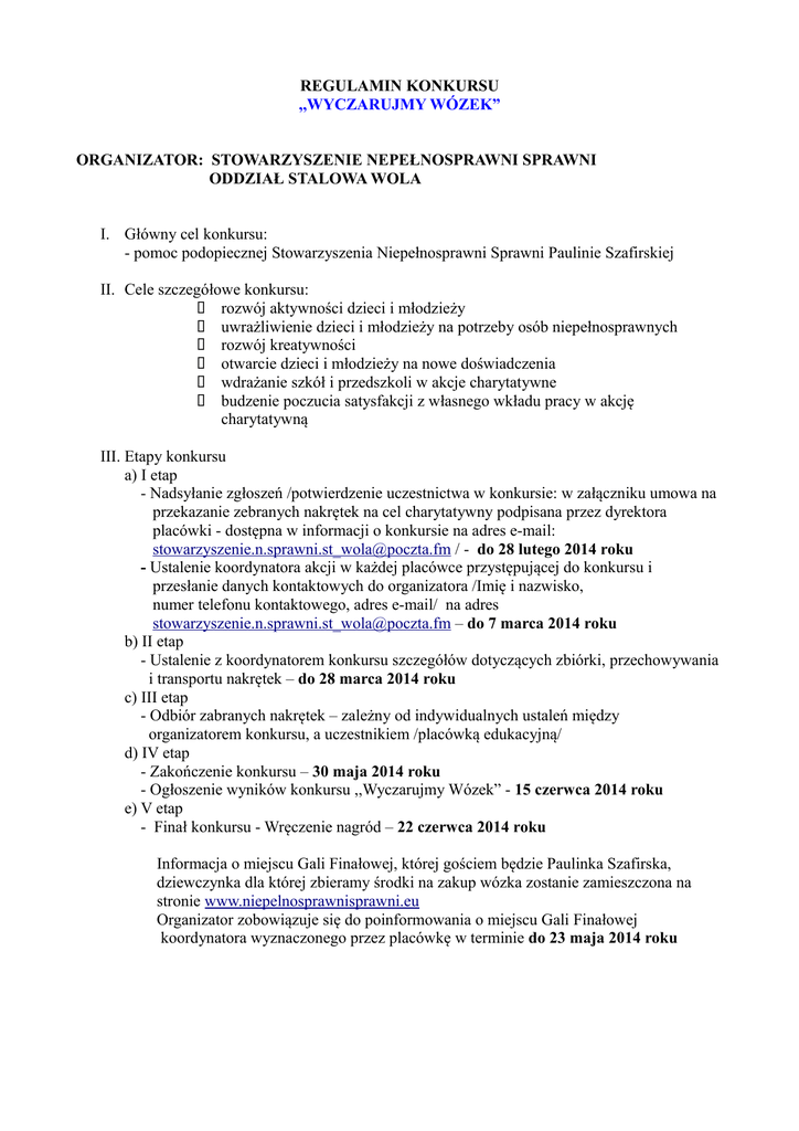 REGULAMIN KONKURSU ,,WYCZARUJMY WÓZEK” ORGANIZATOR: STOWARZYSZENIE NEPEŁNOSPRAWNI SPRAWNI ODDZIAŁ STALOWA WOLA I. Główny cel konkursu: - pomoc podopiecznej Stowarzyszenia Niepełnosprawni Sprawni Paulinie Szafirskiej II. Cele szczegółowe konkursu: – rozwój aktywności dzieci i młodzieży – uwrażliwienie dzieci i młodzieży na potrzeby osób niepełnosprawnych – rozwój kreatywności – otwarcie dzieci i młodzieży na nowe doświadczenia – wdrażanie szkół i przedszkoli w akcje charytatywne – budzenie poczucia satysfakcji z własnego wkładu pracy w akcję charytatywną III. Etapy konkursu a) I etap - Nadsyłanie zgłoszeń /potwierdzenie uczestnictwa w konkursie: w załączniku umowa na przekazanie zebranych nakrętek na cel charytatywny podpisana przez dyrektora placówki - dostępna w informacji o konkursie na adres e-mail: [email protected] / - do 28 lutego 2014 roku - Ustalenie koordynatora akcji w każdej placówce przystępującej do konkursu i przesłanie danych kontaktowych do organizatora /Imię i nazwisko, numer telefonu kontaktowego, adres e-mail/ na adres [email protected] – do 7 marca 2014 roku b) II etap - Ustalenie z koordynatorem konkursu szczegółów dotyczących zbiórki, przechowywania i transportu nakrętek – do 28 marca 2014 roku c) III etap - Odbiór zabranych nakrętek – zależny od indywidualnych ustaleń między organizatorem konkursu, a uczestnikiem /placówką edukacyjną/ d) IV etap - Zakończenie konkursu – 30 maja 2014 roku - Ogłoszenie wyników konkursu ,,Wyczarujmy Wózek” - 15 czerwca 2014 roku e) V etap - Finał konkursu - Wręczenie nagród – 22 czerwca 2014 roku Informacja o miejscu Gali Finałowej, której gościem będzie Paulinka Szafirska, dziewczynka dla której zbieramy środki na zakup wózka zostanie zamieszczona na stronie www.niepelnosprawnisprawni.eu Organizator zobowiązuje się do poinformowania o miejscu Gali Finałowej koordynatora wyznaczonego przez placówkę w terminie do 23 maja 2014 roku IV. Kontakt z koordynatorem konkursu ,,Wyczarujmy Wózek” Dyrektor Oddziału Stalowa Wola - Jadwiga Palińska tel. służbowy: 690 121 573 tel. prywatny: 601 364 160 e-mail: [email protected] V. Nagrody w konkursie I miejsce – Złota Statuetka Czarodzieja II miejsce – Srebrna Statuetka Czarodzieja III miejsce – Brązowa Statuetka Czarodzieja Certyfikat Czarodzieja potwierdzający uczestnictwo w akcji charytatywnej dla każdej placówki, która potwierdzi swój udział w konkursie. VI. Ważne informacje 1. Laureaci konkursu zobowiązują się do wyznaczenia delegacji, która reprezentować będzie placówkę na Gali Finałowej. 2. Koordynatorzy placówek zobowiązani są do poinformowania organizatora o ilości osób delegowanych na Galę Finałową z podaniem imienia i nazwiska oraz funkcji osoby odbierającej nagrodę dla placówki 3. Przyjazd na Galę Finałową odbywa się na koszt własny placówki. Organizator nie nie zapewnia zwrotu kosztów! 4. Organizator zobowiązuje się do poinformowania o miejscu Gali Finałowej koordynatora wyznaczonego przez placówkę w terminie do 23 maja 2014 roku