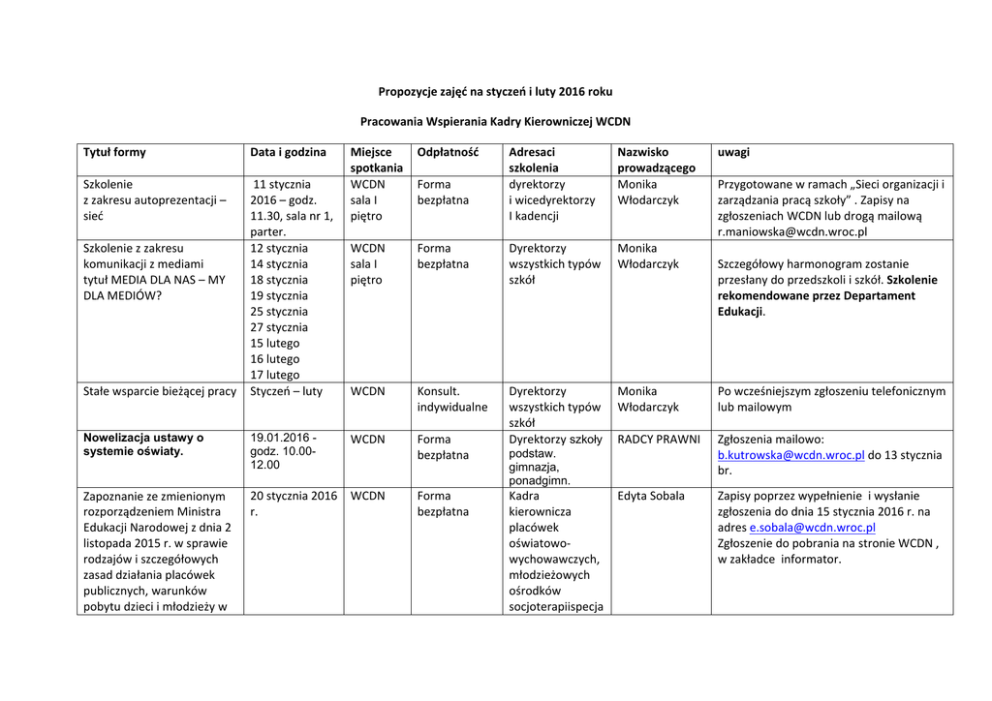 Propozycje zajęć na styczeń i luty 2016 roku Pracowania Wspierania Kadry Kierowniczej WCDN Tytuł formy Data i godzina Szkolenie z zakresu autoprezentacji – sieć 11 stycznia 2016 – godz. 11.30, sala nr 1, parter. 12 stycznia Szkolenie z zakresu komunikacji z mediami 14 stycznia 18 stycznia tytuł MEDIA DLA NAS – MY 19 stycznia DLA MEDIÓW? 25 stycznia 27 stycznia 15 lutego 16 lutego 17 lutego Stałe wsparcie bieżącej pracy Styczeń – luty Miejsce Odpłatność spotkania WCDN Forma sala I bezpłatna piętro WCDN sala I piętro Forma bezpłatna WCDN Konsult. indywidualne WCDN Forma bezpłatna Nowelizacja ustawy o systemie oświaty. 19.01.2016 godz. 10.0012.00 Zapoznanie ze zmienionym rozporządzeniem Ministra Edukacji Narodowej z dnia 2 listopada 2015 r. w sprawie rodzajów i szczegółowych zasad działania placówek publicznych, warunków pobytu dzieci i młodzieży w 20 stycznia 2016 WCDN r. Forma bezpłatna Adresaci szkolenia dyrektorzy i wicedyrektorzy I kadencji Dyrektorzy wszystkich typów szkół Nazwisko prowadzącego Monika Włodarczyk Dyrektorzy wszystkich typów szkół Dyrektorzy szkoły Monika Włodarczyk Po wcześniejszym zgłoszeniu telefonicznym lub mailowym RADCY PRAWNI Zgłoszenia mailowo: [email protected] do 13 stycznia br. Edyta Sobala Zapisy poprzez wypełnienie i wysłanie zgłoszenia do dnia 15 stycznia 2016 r. na adres [email protected] Zgłoszenie do pobrania na stronie WCDN , w zakładce informator. Monika Włodarczyk podstaw. gimnazja, ponadgimn. Kadra kierownicza placówek oświatowo‐ wychowawczych, młodzieżowych ośrodków socjoterapiispecja uwagi Przygotowane w ramach „Sieci organizacji i zarządzania pracą szkoły” . Zapisy na zgłoszeniach WCDN lub drogą mailową [email protected] Szczegółowy harmonogram zostanie przesłany do przedszkoli i szkół. Szkolenie rekomendowane przez Departament Edukacji. tych placówkach oraz wysokości i zasad odpłatności wnoszonej przez rodziców za pobyt ich dzieci w tych placówkach – konsultacje zbiorowe Nowelizacja ustawy o systemie oświaty. 22.01.2016 godz. 10.0012.00 Powtórka z 19.01.16. WCDN Coaching w rozwoju zawodowym i osobistym dyrektora szkoły 23.01, 30.01 i 12.02.2016 g. 9.00‐16.00 WCDN 300 zł Nowelizacja ustawy o systemie oświaty. 26.01.2016 godz. 10.0012.00 WCDN Nowelizacja ustawy o systemie oświaty. 29.01.2016 godz. 10.0012.00 Powtórka z 26.01.16 WCDN Zmiany w prawie oświatowym‐ RMA 29 24.02 2016 g.12.00 WCDN Sala nr 1 I piętro Forma bezpłatna lnych ośrodków szkolno‐ wychowawczych, specjalnych ośrodków wychowawczych, placówek zapewniających opiekę i wychowanie uczniom w okresie pobierania nauki poza miejscem stałego zamieszkania Dyrektorzy szkoły RADCY PRAWNI Zgłoszenia mailowo: [email protected] do 15 stycznia br. Dyrektorzy szkół Grażyna Jarmuż Forma bezpłatna Dyrektorzy RADCY PRAWNI Forma bezpłatna Dyrektorzy Prowadzącym będzie trener biznesu, psycholog, coach Grupa do 15 osób Zgłoszenia mailowo: [email protected] do 19 stycznia br. Zgłoszenia mailowo: [email protected] do 25 stycznia br. bezpłatnie Dyrektorzy szkół i placówek, inni zainteresowani podstaw. gimnazja, ponadgimn. przedszkoli. RADCY PRAWNI przedszkoli. Grażyna Jarmuż, Renata Maniowska Zapisy na zgłoszeniach WCDN lub drogą mailową [email protected] Dotyczy: rozporządzenia w sprawie zakresu i form prowadzenia w szkołach i placówkach systemu oświaty działalności wychowawczej, edukacyjnej, informacyjnej i profilaktycznej w celu przeciwdziałania narkomanii oraz rozporządzenia w sprawie szczegółowych warunków przechodzenia ucznia ze szkoły publicznej lub szkoły niepublicznej o uprawnieniach szkoły publicznej jednego typu do szkoły publicznej innego typu albo do szkoły publicznej tego samego typu Rekomendowane tematy rad pedagogicznych na styczeń‐ luty 2016 r. Tytuł rady pedagogicznej Pozyskiwanie środków zewnętrznych w nowym okresie programowania‐ projekty Zmiany w prawie oświatowym Ilość godzin 4 godz. Adresaci szkolenia Rady pedagogiczne 3 godz. Rady pedagogiczne Nazwisko prowadzącego A.Stocki K. Nowak uwagi Zgłoszenia na drukach WCDN, fax 717964560 Zgłoszenia na drukach WCDN, fax 717964560 Tematy konsultacji z zakresu żywienia: styczeń / luty 2016r. (formy bezpłatne, zgłoszenia- [email protected]) 14.01.2016r. – POWTÓRKA „Nowości na rynku żywieniowym” . Godzina rozpoczęcia spotkania 10.00, sala nr 11, piętro I. 21.01.2016r. – Charakterystyka Produktów z Piramidy Zdrowego Żywienia – ryby, drób, woda i sól. Godzina rozpoczęcia spotkania 10.00, sala nr 11, piętro I. 28.01.2016r. – Charakterystyka najbardziej popularnych diet na rynku ( np. paleo dieta, Dukana). Godzina rozpoczęcia spotkania 10.00, sala nr 11, piętro I. 18.02.2016r. - Charakterystyka Produktów z Piramidy Zdrowego Żywienia – nasiona roślin strączkowych, jaja, tłuszcze. Godzina rozpoczęcia spotkania 10.00, sala nr 12, piętro I.