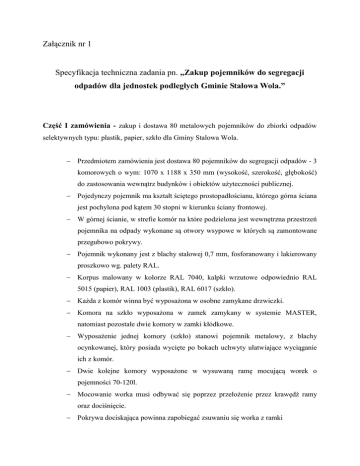 Załącznik nr 1 Specyfikacja techniczna zadania pn. „Zakup pojemników do segregacji odpadów dla jednostek podległych Gminie Stalowa Wola.” Część I zamówienia - zakup i dostawa 80 metalowych pojemników do zbiorki odpadów selektywnych typu: plastik, papier, szkło dla Gminy Stalowa Wola. Przedmiotem zamówienia jest dostawa 80 pojemników do segregacji odpadów - 3 komorowych o wym: 1070 x 1188 x 350 mm (wysokość, szerokość, głębokość) do zastosowania wewnątrz budynków i obiektów użyteczności publicznej. Pojedynczy pojemnik ma kształt ściętego prostopadłościanu, którego górna ściana jest pochylona pod kątem 30 stopni w kierunku ściany frontowej. W górnej ścianie, w strefie komór na które podzielona jest wewnętrzna przestrzeń pojemnika na odpady wykonane są otwory wsypowe w których są zamontowane przegubowo pokrywy. Pojemnik wykonany jest z blachy stalowej 0,7 mm, fosforanowany i lakierowany proszkowo wg. palety RAL. Korpus malowany w kolorze RAL 7040, kalpki wrzutowe odpowiednio RAL 5015 (papier), RAL 1003 (plastik), RAL 6017 (szkło). Każda z komór winna być wyposażona w osobne zamykane drzwiczki. Komora na szkło wyposażona w zamek zamykany w systemie MASTER, natomiast pozostałe dwie komory w zamki kłódkowe. Wyposażenie jednej komory (szkło) stanowi pojemnik metalowy, z blachy ocynkowanej, który posiada wycięte po bokach uchwyty ułatwiające wyciąganie ich z komór. Dwie kolejne komory wyposażone w wysuwaną ramę mocującą worek o pojemności 70-120l. Mocowanie worka musi odbywać się poprzez przełożenie przez krawędź ramy oraz dociśnięcie. Pokrywa dociskająca powinna zapobiegać zsuwaniu się worka z ramki Pojedynczy pojemnik musi być wyposażony w uszczelki wokół otworów wlotowych oraz system samozamykania klapek wrzutowych dla eliminacji wydobywania się nieprzyjemnych zapachów. Pojedynczy pojemnik musi być wyposażony w specjalne otwory mocujące do ścian uwzględniające specyfikę obiektów, w których zostanie umieszczony. Pojedynczy pojemnik musi posiadać specjalne gumy antypoślizgowe. Klapki wrzutowe powinny posiadać trwałe, kolorowe oznakowanie ułatwiające segregowanie odpadów: SZKŁO, PAPIER, PLASTIK. Wymagane dokumenty dotyczące pojemnika do segregacji: a) atest higieniczny Państwowego Zakładu Higieny lub inny równoważny dokument. b) ekspertyza o niepalności. Pojemniki muszą spełniać normy obowiązujące i odnoszące się do jakości produktów oraz bezpieczeństwa ich użytkowania Gwarancja w okresie 6 lat. Wykonawca w okresie gwarancji zobowiązany jest do przeglądu i bieżących remontów konkretnie wskazanych pojemników na wezwanie Zamawiającego oraz likwidowania usterek powstałych z przyczyn konstrukcyjnych oraz eksploatacyjnych w tym usterki mechaniczne. Maksymalny czas reakcji od momentu pisemnego zgłoszenia za zwrotnym potwierdzeniem to 3 dni robocze. Pojemniki zostaną dostarczone w miejsca wskazane przez Zamawiającego na terenie Gminy. Część II zamówienia - zakup i dostawa 40 pojemników PE koloru zielonego na zużyte baterie dla Gminy Stalowa Wola. Przedmiotem zamówienia jest dostawa 40 pojemników na zużyte baterie dla Gminy Stalowa Wola do zastosowania wewnątrz budynków i obiektów użyteczności publicznej. Materiał: tworzywo sztuczne PE. Zapobiega wydostaniu się płynu z rozlanych baterii na zewnątrz. Posiada uniwersalny otwór umożliwiający wrzucanie baterii różnych typów. Wygląda jak bateria przez co nie można pomylić się co do przeznaczenia Pojemność 40 l Wysokość 500 mmm Waga 6 kg Pojemniki muszą spełniać normy obowiązujące i odnoszące się do jakości produktów oraz bezpieczeństwa ich użytkowania Pojemniki zostaną dostarczone w miejsca wskazane przez Zamawiającego na terenie Gminy. Część III zamówienia - zakup i dostawa 5 000 torebek auto- bag z kolorowym nadrukiem dla Gminy Stalowa Wola służących do gromadzenia odpadów w samochodach. Przedmiotem zamówienia jest dostawa 5 000 torebek auto- bag dla Gminy Stalowa Wola. Torebka auto-bag posiada haczyk do zawieszania, można ją również zawieszać za pomocą taśmy dwustronnie klejącej (klej akrylowy - przy odrywaniu nie pozostawia śladów). Torebka auto-bag wykonana jest z wytrzymałego papieru, a zawieszka z haczykiem z kartonu. Jednorazowego użytku - po zapełnieniu wystarczy wyrzucić do kosza i zawiesić nową torebkę. W przypadku kiedy wrzucone śmieci to suche odpady (np. papierki, opakowania, puste butelki itp.) torebkę można opróżnić i użyć ponownie. Pojemność (ponad 3 litry). Duży wlot umożliwia łatwe wrzucanie większych śmieci m.in. opakowań po napojach. Torebki powinny być zaopatrzone w kolorową grafikę o treści Gmina Stalowa Wola Wydział Gospodarki Odpadami, adresy i numery telefonów, na ringu kartonowym/zawieszce. Po wybraniu oferty Wykonawca zobowiązany jest do przedstawienia projektu nadruku do akceptacji w terminie do 14 dni od podpisania umowy.
