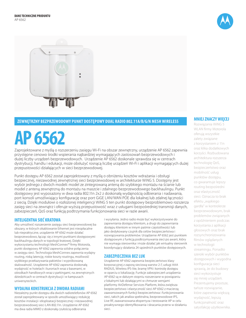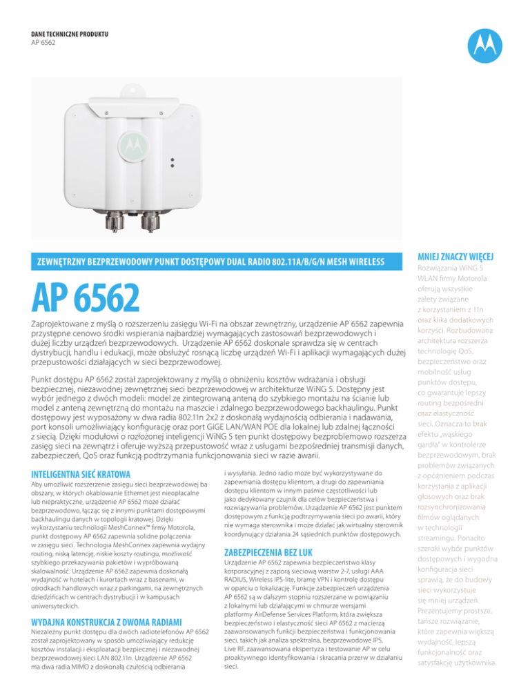 DANE TECHNICZNE PRODUKTU AP 6562 Zewnętrzny bezprzewodowy punkt dostępowy DUAL RADIO 802.11a/b/g/n MESH WIRELESS AP 6562 Zaprojektowane z myślą o rozszerzeniu zasięgu Wi-Fi na obszar zewnętrzny, urządzenie AP 6562 zapewnia przystępne cenowo środki wspierania najbardziej wymagających zastosowań bezprzewodowych i dużej liczby urządzeń bezprzewodowych. Urządzenie AP 6562 doskonale sprawdza się w centrach dystrybucji, handlu i edukacji, może obsłużyć rosnącą liczbę urządzeń Wi-Fi i aplikacji wymagających dużej przepustowości działających w sieci bezprzewodowej. Punkt dostępu AP 6562 został zaprojektowany z myślą o obniżeniu kosztów wdrażania i obsługi bezpiecznej, niezawodnej zewnętrznej sieci bezprzewodowej w architekturze WiNG 5. Dostępny jest wybór jednego z dwóch modeli: model ze zintegrowaną anteną do szybkiego montażu na ścianie lub model z anteną zewnętrzną do montażu na maszcie i zdalnego bezprzewodowego backhaulingu. Punkt dostępowy jest wyposażony w dwa radia 802.11n 2x2 z doskonałą wydajnością odbierania i nadawania, port konsoli umożliwiający konfigurację oraz port GiGE LAN/WAN POE dla lokalnej lub zdalnej łączności z siecią. Dzięki modułowi o rozłożonej inteligencji WiNG 5 ten punkt dostępowy bezproblemowo rozszerza zasięg sieci na zewnątrz i oferuje wyższą przepustowość wraz z usługami bezpośredniej transmisji danych, zabezpieczeń, QoS oraz funkcją podtrzymania funkcjonowania sieci w razie awarii. Inteligentna sieć kratowa Aby umożliwić rozszerzenie zasięgu sieci bezprzewodowej ba obszary, w których okablowanie Ethernet jest nieopłacalne lub niepraktyczne, urządzenie AP 6562 może działać bezprzewodowo, łącząc się z innymi punktami dostępowymi backhaulingu danych w topologii kratowej. Dzięki wykorzystaniu technologii MeshConnex™ firmy Motorola, punkt dostępowy AP 6562 zapewnia solidne połączenia w zasięgu sieci. Technologia MeshConnex zapewnia wydajny routing, niską latencję, niskie koszty routingu, możliwość szybkiego przekazywania pakietów i wypróbowaną skalowalność. Urządzenie AP 6562 zapewnia doskonałą wydajność w hotelach i kurortach wraz z basenami, w ośrodkach handlowych wraz z parkingami, na zewnętrznych dziedzińcach w centrach dystrybucji i w kampusach uniwersyteckich. Wydajna konstrukcja z dwoma radiami Niezależny punkt dostępu dla dwóch radiotelefonów AP 6562 został zaprojektowany w sposób umożliwiający redukcję kosztów instalacji i eksploatacji bezpiecznej i niezawodnej bezprzewodowej sieci LAN 802.11n. Urządzenie AP 6562 ma dwa radia MIMO z doskonałą czułością odbierania i wysyłania. Jedno radio może być wykorzystywane do zapewniania dostępu klientom, a drugi do zapewniania dostępu klientom w innym paśmie częstotliwości lub jako dedykowany czujnik dla celów bezpieczeństwa i rozwiązywania problemów. Urządzenie AP 6562 jest punktem dostępowym z funkcją podtrzymywania sieci po awarii, który nie wymaga sterownika i może działać jak wirtualny sterownik koordynujący działania 24 sąsiednich punktów dostępowych. Zabezpieczenia bez luk Urządzenie AP 6562 zapewnia bezpieczeństwo klasy korporacyjnej z zaporą sieciową warstw 2-7, usługi AAA RADIUS, Wireless IPS-lite, bramę VPN i kontrolę dostępu w oparciu o lokalizację. Funkcje zabezpieczeń urządzenia AP 6562 są w dalszym stopniu rozszerzane w powiązaniu z lokalnymi lub działającymi w chmurze wersjami platformy AirDefense Services Platform, która zwiększa bezpieczeństwo i elastyczność sieci AP 6562 z macierzą zaawansowanych funkcji bezpieczeństwa i funkcjonowania sieci, takich jak analiza spektralna, bezprzewodowe IPS, Live RF, zaawansowana ekspertyza i testowanie AP w celu proaktywnego identyfikowania i skracania przerw w działaniu sieci. MNIEJ ZNACZY WIĘCEJ Rozwiązania WiNG 5 WLAN firmy Motorola oferują wszystkie zalety związane z korzystaniem z 11n oraz klika dodatkowych korzyści. Rozbudowana architektura rozszerza technologię QoS, bezpieczeństwo oraz mobilność usług punktów dostępu, co gwarantuje lepszy routing bezpośredni oraz elastyczność sieci. Oznacza to brak efektu „wąskiego gardła” w kontrolerze bezprzewodowym, brak problemów związanych z opóźnieniem podczas korzystania z aplikacji głosowych oraz brak rozsynchronizowania filmów oglądanych w technologii streamingu. Ponadto szeroki wybór punktów dostępowych i wygodna konfiguracja sieci sprawią, że do budowy sieci wykorzystuje się mniej urządzeń. Prezentujemy prostsze, tańsze rozwiązanie, które zapewnia większą wydajność, lepszą STRONA 1 funkcjonalność oraz satysfakcję użytkownika. DANE TECHNICZNE PRODUKTU AP 6562 Zwiększ wrażenia swoich gości Szybka i bezprzewodowa instalacja Urządzenie AP 6562 jest prostym rozszerzeniem zewnętrznym dla wewnętrznej sieci bezprzewodowej, co zapewnia klientom na uzyskanie zasięgu na zewnątrz, co pozwala zwiększyć ich zadowolenie, przyspieszyć meldowanie się i obsługę lub zwiększać zyski w obszarach basenów i dostępu dla gości. Urządzenie AP 6562 nie wymaga konfiguracji ani ręcznego utrzymywania oprogramowania sprzętowego. Kontroler sieci bezprzewodowej firmy Motorola wykrywa punkty dostępowe sieci i automatycznie pobiera wszystkie parametry konfiguracyjne oraz oprogramowanie, co znacznie obniża koszty instalacji, konserwacji i rozwiązywania problemów urządzeń warstwy 2 i 3. Opcje wewnętrznej i zewnętrznej anteny SKU oraz nieduża i estetyczna obudowa zapewniają więcej wyboru dla lokalizacji montażowych. Arkusz danych technicznych urządzenia AP 6562 Charakterystyka fizyczna AP 6562 (antena wewnętrzna) Wymiary: AP 6562 (antena zewnętrzna) 9,1” W x 9,8” H x 2,6” D Waga: 9,1” W x 9,8” H x 2,6” D 2,9 funta Numer części: 2,9 funta AP-6562-66030 (-US, -WR, -EU) AP-6562-66040 (-US, -WR, -EU) Konfiguracje montażu: Adaptowalny zestaw montażowy dla instalacji na ścianie i 