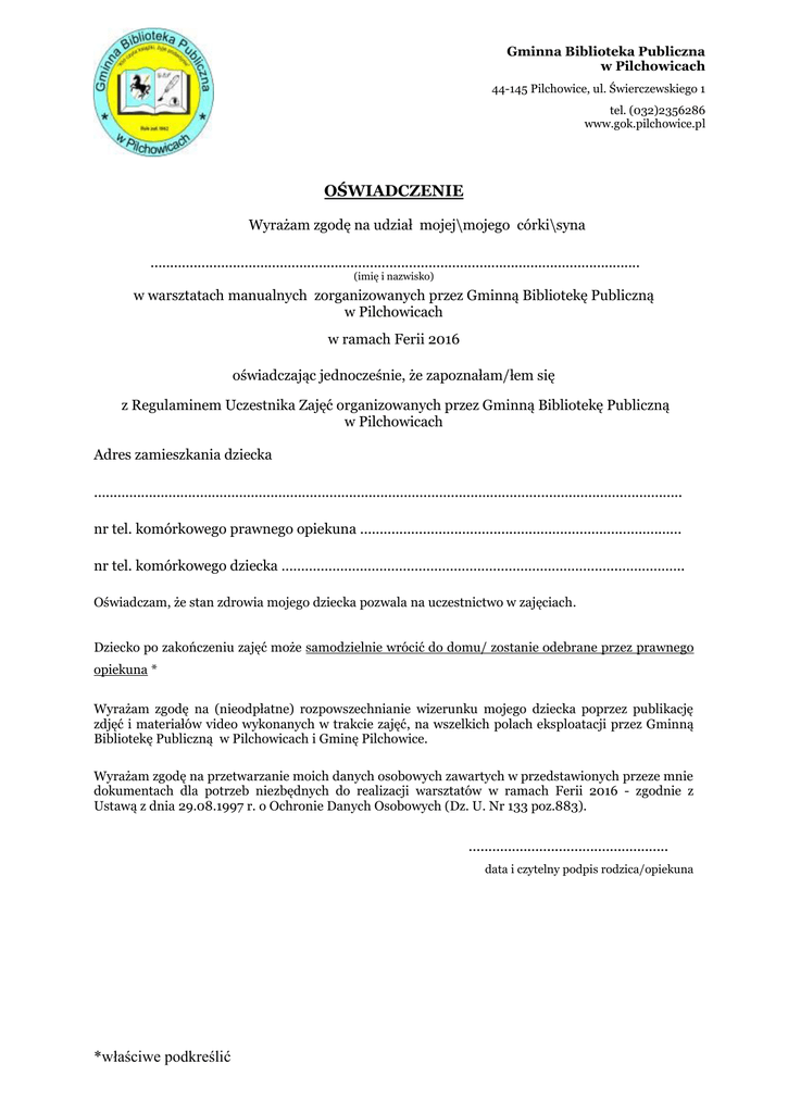 Gminna Biblioteka Publiczna w Pilchowicach 44-145 Pilchowice, ul. Świerczewskiego 1 tel. (032)2356286 www.gok.pilchowice.pl OŚWIADCZENIE Wyrażam zgodę na udział mojej\mojego córki\syna ............................................................................................................................. (imię i nazwisko) w warsztatach manualnych zorganizowanych przez Gminną Bibliotekę Publiczną w Pilchowicach w ramach Ferii 2016 oświadczając jednocześnie, że zapoznałam/łem się z Regulaminem Uczestnika Zajęć organizowanych przez Gminną Bibliotekę Publiczną w Pilchowicach Adres zamieszkania dziecka ...................................................................................................................................................... nr tel. komórkowego prawnego opiekuna .................................................................................. nr tel. komórkowego dziecka …………………………………………………………………………..…………….. Oświadczam, że stan zdrowia mojego dziecka pozwala na uczestnictwo w zajęciach. Dziecko po zakończeniu zajęć może samodzielnie wrócić do domu/ zostanie odebrane przez prawnego opiekuna * Wyrażam zgodę na (nieodpłatne) rozpowszechnianie wizerunku mojego dziecka poprzez publikację zdjęć i materiałów video wykonanych w trakcie zajęć, na wszelkich polach eksploatacji przez Gminną Bibliotekę Publiczną w Pilchowicach i Gminę Pilchowice. Wyrażam zgodę na przetwarzanie moich danych osobowych zawartych w przedstawionych przeze mnie dokumentach dla potrzeb niezbędnych do realizacji warsztatów w ramach Ferii 2016 - zgodnie z Ustawą z dnia 29.08.1997 r. o Ochronie Danych Osobowych (Dz. U. Nr 133 poz.883). ................................................... data i czytelny podpis rodzica/opiekuna *właściwe podkreślić