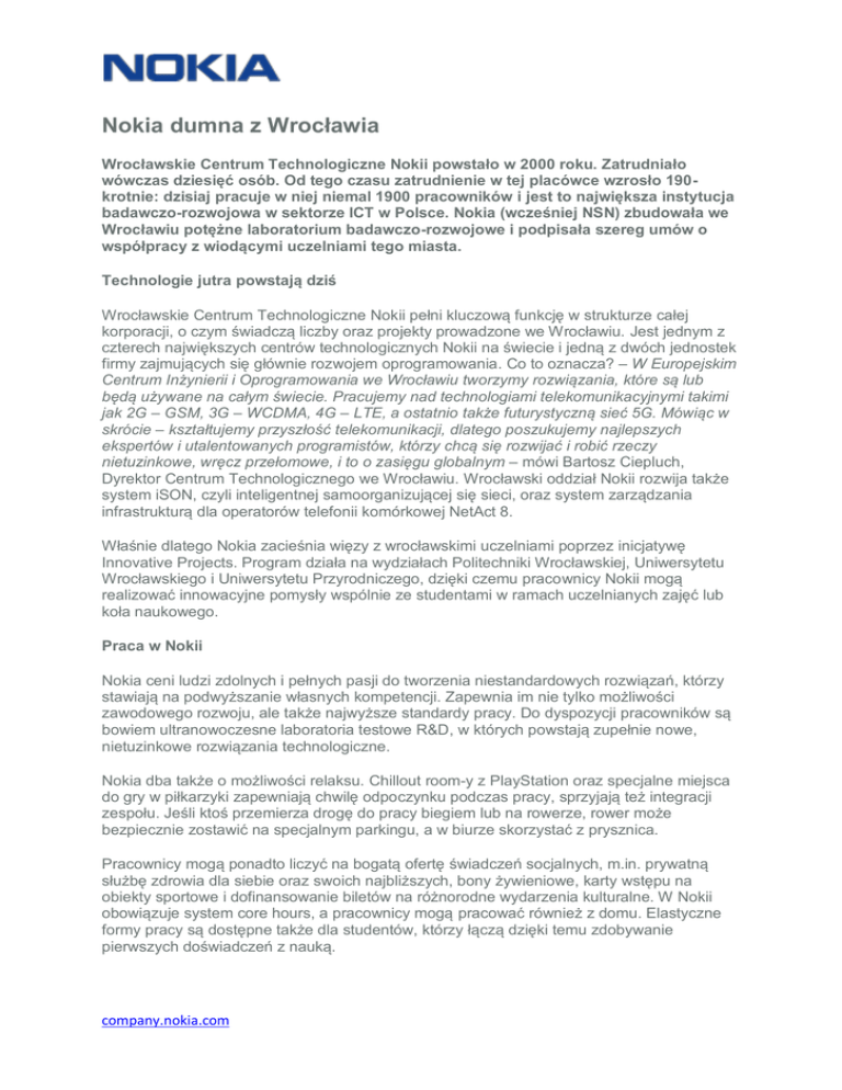 Nokia dumna z Wrocławia Wrocławskie Centrum Technologiczne Nokii powstało w 2000 roku. Zatrudniało wówczas dziesięć osób. Od tego czasu zatrudnienie w tej placówce wzrosło 190krotnie: dzisiaj pracuje w niej niemal 1900 pracowników i jest to największa instytucja badawczo-rozwojowa w sektorze ICT w Polsce. Nokia (wcześniej NSN) zbudowała we Wrocławiu potężne laboratorium badawczo-rozwojowe i podpisała szereg umów o współpracy z wiodącymi uczelniami tego miasta. Technologie jutra powstają dziś Wrocławskie Centrum Technologiczne Nokii pełni kluczową funkcję w strukturze całej korporacji, o czym świadczą liczby oraz projekty prowadzone we Wrocławiu. Jest jednym z czterech największych centrów technologicznych Nokii na świecie i jedną z dwóch jednostek firmy zajmujących się głównie rozwojem oprogramowania. Co to oznacza? – W Europejskim Centrum Inżynierii i Oprogramowania we Wrocławiu tworzymy rozwiązania, które są lub będą używane na całym świecie. Pracujemy nad technologiami telekomunikacyjnymi takimi jak 2G – GSM, 3G – WCDMA, 4G – LTE, a ostatnio także futurystyczną sieć 5G. Mówiąc w skrócie – kształtujemy przyszłość telekomunikacji, dlatego poszukujemy najlepszych ekspertów i utalentowanych programistów, którzy chcą się rozwijać i robić rzeczy nietuzinkowe, wręcz przełomowe, i to o zasięgu globalnym – mówi Bartosz Ciepluch, Dyrektor Centrum Technologicznego we Wrocławiu. Wrocławski oddział Nokii rozwija także system iSON, czyli inteligentnej samoorganizującej się sieci, oraz system zarządzania infrastrukturą dla operatorów telefonii komórkowej NetAct 8. Właśnie dlatego Nokia zacieśnia więzy z wrocławskimi uczelniami poprzez inicjatywę Innovative Projects. Program działa na wydziałach Politechniki Wrocławskiej, Uniwersytetu Wrocławskiego i Uniwersytetu Przyrodniczego, dzięki czemu pracownicy Nokii mogą realizować innowacyjne pomysły wspólnie ze studentami w ramach uczelnianych zajęć lub koła naukowego. Praca w Nokii Nokia ceni ludzi zdolnych i pełnych pasji do tworzenia niestandardowych rozwiązań, którzy stawiają na podwyższanie własnych kompetencji. Zapewnia im nie tylko możliwości zawodowego rozwoju, ale także najwyższe standardy pracy. Do dyspozycji pracowników są bowiem ultranowoczesne laboratoria testowe R&D, w których powstają zupełnie nowe, nietuzinkowe rozwiązania technologiczne. Nokia dba także o możliwości relaksu. Chillout room-y z PlayStation oraz specjalne miejsca do gry w piłkarzyki zapewniają chwilę odpoczynku podczas pracy, sprzyjają też integracji zespołu. Jeśli ktoś przemierza drogę do pracy biegiem lub na rowerze, rower może bezpiecznie zostawić na specjalnym parkingu, a w biurze skorzystać z prysznica. Pracownicy mogą ponadto liczyć na bogatą ofertę świadczeń socjalnych, m.in. prywatną służbę zdrowia dla siebie oraz swoich najbliższych, bony żywieniowe, karty wstępu na obiekty sportowe i dofinansowanie biletów na różnorodne wydarzenia kulturalne. W Nokii obowiązuje system core hours, a pracownicy mogą pracować również z domu. Elastyczne formy pracy są dostępne także dla studentów, którzy łączą dzięki temu zdobywanie pierwszych doświadczeń z nauką. company.nokia.com Specjaliści poszukiwani Centrum Technologiczne we Wrocławiu nieustannie zatrudnia nowe osoby. Poszukiwani są przede wszystkim studenci kierunków technicznych oraz doświadczeni deweloperzy, którzy wesprą ambitny i dynamicznie rozwijający się wrocławski team. Aby aktywnie wyszukiwać młode talenty, wrocławski oddział Nokii prowadzi bardzo ciekawe programy dla studentów i absolwentów – staże Working Students oraz płatne praktyki wakacyjne z darmowym zakwaterowaniem. Nokia Nokia to największy na świecie specjalista w dziedzinie transmisji szerokopasmowej w sieciach komórkowych. Firma działa w czołówce każdej generacji technologii mobilnych, od pierwszego połączenia w sieci GSM, po pierwsze połączenie w sieci LTE. Eksperci na całym świecie tworzą nowe rozwiązania, których poszukują operatorzy dla swoich sieci. Nokia inwestuje w innowacyjne technologie mobilne, które łączą miliardy urządzeń na całym świecie. Firma dostarcza najbardziej wydajne sieci komórkowe na świecie, wiedzę umożliwiającą maksymalne zwiększenie ich wartości oraz usługi, dzięki którym wszystkie te elementy perfekcyjnie ze sobą współpracują. Więcej informacji: www.nsn.com / / http://company.nokia.com Informacje dla prasy Nokia Sylwia Pilarska Centrum technologiczne Wrocław Tel. +48 795467733 e-mail: [email protected] Nokia Andrzej Styliński Communications Tel. +48 660 430 098 E-mail: [email protected] company.nokia.com
