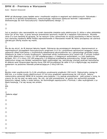 AutoRok.PL / DesignForum.PL BMW i8 - Premiera w Warszawie Autor: Wojciech Sierpowski BMW od dłuższego czasu badało sens i możliwości wejścia w segment aut elektrycznych. Odczekało i uczyniło to w sposób kompleksowy, wykorzystując najnowsze zdobycze techniki i odpowiednio dostosowując do nich futurystyczny i bezkompleksowy design. Już w zeszłym roku wprowadziło na rynek niezwykłe miejskie auto elektryczne i3, które o włos zdobyłoby tytuł Car of the Year, a teraz lansuje prawdziwie sportowy model i8 o napędzie hybrydowym. Wysoka cena i3 a tym bardziej i8 sprawia, że na naszym rynku samochody te raczej pozostaną w sferze marzeń, tym niemniej niedawno BMW Polska zaprezentowało w Warszawie model i8, który począwszy od czerwca uatrakcyjni ofertę wozów tej marki. Nie da się ukryć, że i8 stanowi łakomy kąsek. Odznacza się porażającym designem, dopracowanym w najmniejszych szczegółach futurystycznym wnętrzem 2+2 no i prawdziwie sportowymi osiągami, które zapewnia układ hybrydowy z możliwością doładowania akumulatorów np z garażowego gniazdka prądu. Osadzono je nisko w tunelu środkowym, natomiast silniki rozlokowano przy osiach kół. Z przodu znalazł się silnik elektryczny o mocy 131 KM współpracujący z 2-biegowym automatem, a z tyłu spalinowy – R3-1.5 o mocy 231 KM połączony z 6-biegową przekładnią automatyczną. Dzięki przebiegłej elektronice mogą one działać niezależnie bądź wspomagać się, odzyskując energię podczas hamowania. W efekcie auto dysponujące łączną mocą 326 KM przyspiesza do setki w 4,4 s legitymując się średnim spalaniem na poziomie niewiele przekraczającym 2 litry/100 km. Bardzo niski współczynnik Cx 0,26 umożliwia uzyskiwanie prędkości 250 km/h. Maksymalny zasięg to 600 km, a w trybie czysto elektrycznym 37 km przy prędkości ograniczonej do 120 km/h. Jedyny niekorzystny parametr BMW i8 to wysoka cena pojazdu. I tu pasuje powiedzenie - jeśli pytasz o cenę, to znaczy że cię nie stać na takie auto. No cóż, nie jest powiedziane, że gdyby ten samochód posiadał klasyczny napęd, byłby o wiele tańszy, bo technologie zapożyczone z Formuły 1 albo wyścigówek z Le Mans kosztują. I to się raczej nie zmieni. WS Galeria zdjęć http://mas.auto.pl Kreator PDF Utworzono 3 March, 2017, 16:22