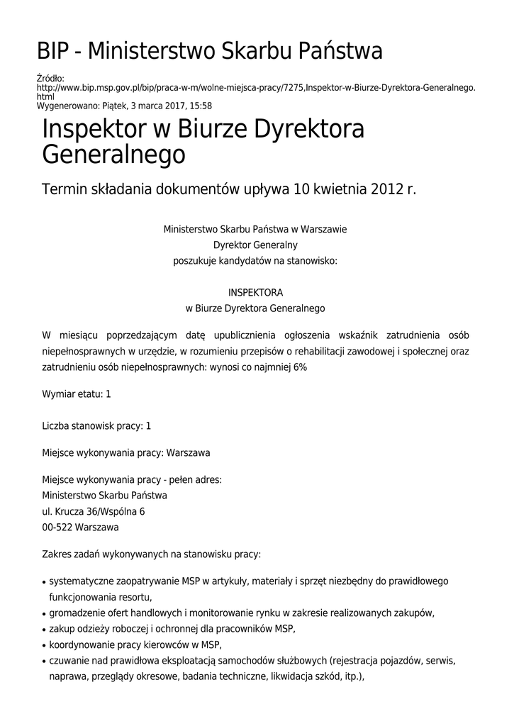 BIP - Ministerstwo Skarbu Państwa Źródło: http://www.bip.msp.gov.pl/bip/praca-w-m/wolne-miejsca-pracy/7275,Inspektor-w-Biurze-Dyrektora-Generalnego. html Wygenerowano: Piątek, 3 marca 2017, 15:58 Inspektor w Biurze Dyrektora Generalnego Termin składania dokumentów upływa 10 kwietnia 2012 r. Ministerstwo Skarbu Państwa w Warszawie Dyrektor Generalny poszukuje kandydatów na stanowisko: INSPEKTORA w Biurze Dyrektora Generalnego W miesiącu poprzedzającym datę upublicznienia ogłoszenia wskaźnik zatrudnienia osób niepełnosprawnych w urzędzie, w rozumieniu przepisów o rehabilitacji zawodowej i społecznej oraz zatrudnieniu osób niepełnosprawnych: wynosi co najmniej 6% Wymiar etatu: 1 Liczba stanowisk pracy: 1 Miejsce wykonywania pracy: Warszawa Miejsce wykonywania pracy - pełen adres: Ministerstwo Skarbu Państwa ul. Krucza 36/Wspólna 6 00-522 Warszawa Zakres zadań wykonywanych na stanowisku pracy: ● systematyczne zaopatrywanie MSP w artykuły, materiały i sprzęt niezbędny do prawidłowego funkcjonowania resortu, ● gromadzenie ofert handlowych i monitorowanie rynku w zakresie realizowanych zakupów, ● zakup odzieży roboczej i ochronnej dla pracowników MSP, ● koordynowanie pracy kierowców w MSP, ● czuwanie nad prawidłowa eksploatacją samochodów służbowych (rejestracja pojazdów, serwis, naprawa, przeglądy okresowe, badania techniczne, likwidacja szkód, itp.), ● rozliczanie czasu pracy kierowców oraz sporządzanie na potrzeby wydziału różnego rodzaju kalkulacji, ● współpraca z firmami świadczącymi usługi serwisowe związane z taborem samochodowym na rzecz MSP, ● inicjowanie i przygotowywanie postępowań o udzielenie zamówienia publicznego w zakresie właściwości wydziału. Warunki pracy Warunki dotyczące charakteru pracy na stanowisku i sposobu wykonywania zadań ● praca częściowo w siedzibie urzędu, częściowo poza urzędem (wyjazdy po zakupy, wyjazdy do serwisu, itp.), Miejsce i otoczenie organizacyjno-techniczne stanowiska pracy ● praca przy monitorze ekranowym, obsługa urządzeń biurowych, jazda samochodem. Budynek może stwarzać problemy dla osób niepełnosprawnych ruchowo (brak podjazdów, niedostosowane windy i toalety, korytarze dzielone drzwiami z samozamykaczami) Inne Wymagania związane ze stanowiskiem pracy niezbędne wykształcenie: /średnie doświadczenie: okres doświadczenia: 3 lata doświadczenia zawodowego pozostałe wymagania niezbędne: ● prawo jazdy kat. B, ● obsługa komputera (środowisko MS Office), ● umiejętność pracy w zespole, ● umiejętność analitycznego myślenia, ● komunikatywność, ● dokładność, uczciwość i skrupulatność ● znajomość ustawy o służbie cywilnej, ● poświadczenie bezpieczeństwa uprawniające do dostępu do informacji niejawnych lub wyrażenie zgody na poddanie się procedurze sprawdzającej. wymagania dodatkowe: ● znajomość ustawy „Prawo zamówień publicznych”, ● umiejętność zarządzania ludźmi, ● odporność na stres, ● bardzo dobra organizacja pracy. Wymagane dokumenty i oświadczenia: ● życiorys i list motywacyjny, ● oświadczenie kandydata o wyrażeniu zgody na przetwarzanie danych osobowych do celów rekrutacji, ● oświadczenie o korzystaniu z pełni praw publicznych, ● oświadczenie kandydata o nieskazaniu prawomocnym wyrokiem za umyślne przestępstwo lub umyślne przestępstwo skarbowe, ● kopie dokumentów potwierdzających wykształcenie, ● kopie dokumentów potwierdzających posiadanie polskiego obywatelstwa lub oświadczenie o posiadaniu obywatelstwa polskiego. Kopie innych dokumentów i oświadczenia: ● kopia dokumentów potwierdzających 3 letnie doświadczenie zawodowe, ● kopia prawa jazdy kat. B, ● kopia „poświadczenia bezpieczeństwa” uprawniającego do dostępu do informacji niejawnych lub zgoda na poddanie się procedurze sprawdzającej. Termin składania dokumentów: 10.04.2012 r. Miejsce składania dokumentów: Ministerstwo Skarbu Państwa Biuro Zarządzania Zasobami Ludzkimi, pok. 482 ul. Krucza 36/Wspólna 6 00-522 Warszawa z dopiskiem z dopiskiem „oferta na stanowisko inspektora w Biurze Dyrektora Generalnego”. Inne informacje: Wymagane oświadczenia muszą być własnoręcznie podpisane. Wzory wymaganych oświadczeń znajdują się na stronie Biuletynu Informacji Publicznej MSP, w dziale ogłoszeń o wolnych stanowiskach pracy. Oferty otrzymane po terminie nie będą rozpatrywane (decyduje data stempla pocztowego). Zastrzegamy prawo do kontaktu tylko z wybranymi kandydatami. Po analizie formalnej i merytorycznej nadesłanych ofert wybrani kandydaci zakwalifikowani do dalszego etapu zostaną poinformowani o terminie naboru telefonicznie lub na wskazany w ofercie adres poczty elektronicznej. Oferty odrzucone zostaną komisyjnie zniszczone po upływie 1 miesiąca. Dodatkowe informacje: tel. (22) 695-87-57. Autor: Biuro Zarządzania Zasobami Ostatnia zmiana: 30.03.2012 Agnieszka Ludzkimi Steindl Opublikowane przez: Agnieszka Steindl Rejestr zmian
