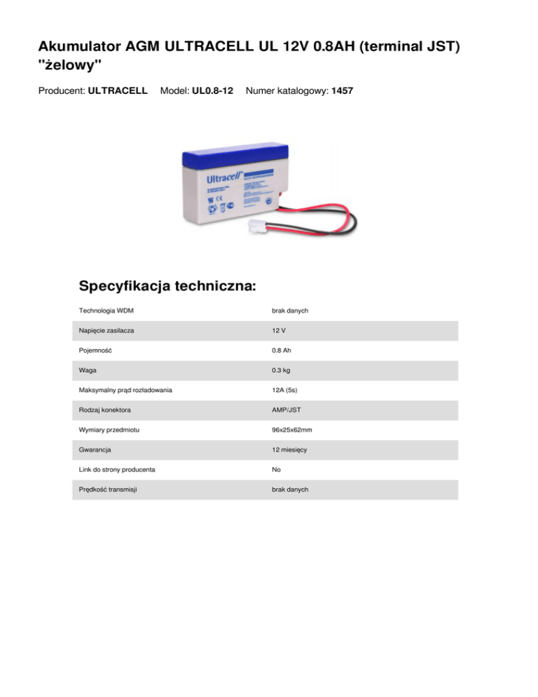 Akumulator AGM ULTRACELL UL 12V 0.8AH (terminal JST) "żelowy" Producent: ULTRACELL Model: UL0.8-12 Numer katalogowy: 1457 Specyfikacja techniczna: Technologia WDM brak danych Napięcie zasilacza 12 V Pojemność 0.8 Ah Waga 0.3 kg Maksymalny prąd rozładowania 12A (5s) Rodzaj konektora AMP/JST Wymiary przedmiotu 96x25x62mm Gwarancja 12 miesięcy Link do strony producenta No Prędkość transmisji brak danych