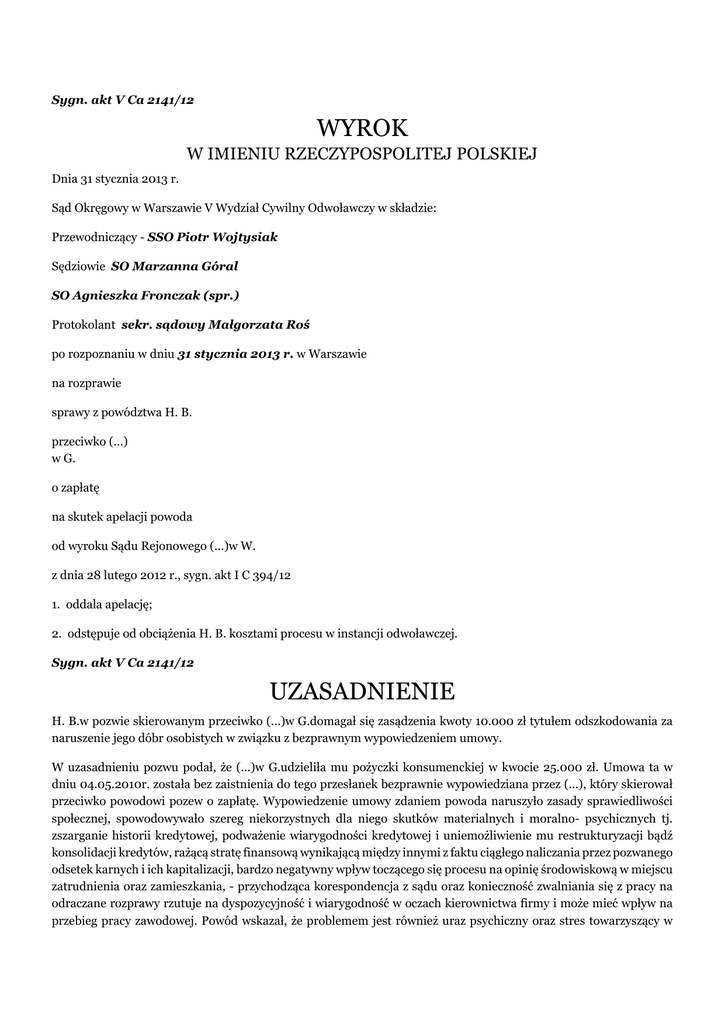 Sygn. akt V Ca 2141/12 WYROK W IMIENIU RZECZYPOSPOLITEJ POLSKIEJ Dnia 31 stycznia 2013 r. Sąd Okręgowy w Warszawie V Wydział Cywilny Odwoławczy w składzie: Przewodniczący - SSO Piotr Wojtysiak Sędziowie SO Marzanna Góral SO Agnieszka Fronczak (spr.) Protokolant sekr. sądowy Małgorzata Roś po rozpoznaniu w dniu 31 stycznia 2013 r. w Warszawie na rozprawie sprawy z powództwa H. B. przeciwko (...) w G. o zapłatę na skutek apelacji powoda od wyroku Sądu Rejonowego (...)w W. z dnia 28 lutego 2012 r., sygn. akt I C 394/12 1. oddala apelację; 2. odstępuje od obciążenia H. B. kosztami procesu w instancji odwoławczej. Sygn. akt V Ca 2141/12 UZASADNIENIE H. B.w pozwie skierowanym przeciwko (...)w G.domagał się zasądzenia kwoty 10.000 zł tytułem odszkodowania za naruszenie jego dóbr osobistych w związku z bezprawnym wypowiedzeniem umowy. W uzasadnieniu pozwu podał, że (...)w G.udzieliła mu pożyczki konsumenckiej w kwocie 25.000 zł. Umowa ta w dniu 04.05.2010r. została bez zaistnienia do tego przesłanek bezprawnie wypowiedziana przez (...), który skierował przeciwko powodowi pozew o zapłatę. Wypowiedzenie umowy zdaniem powoda naruszyło zasady sprawiedliwości społecznej, spowodowywało szereg niekorzystnych dla niego skutków materialnych i moralno- psychicznych tj. zszarganie historii kredytowej, podważenie wiarygodności kredytowej i uniemożliwienie mu restrukturyzacji bądź konsolidacji kredytów, rażącą stratę finansową wynikającą między innymi z faktu ciągłego naliczania przez pozwanego odsetek karnych i ich kapitalizacji, bardzo negatywny wpływ toczącego się procesu na opinię środowiskową w miejscu zatrudnienia oraz zamieszkania, - przychodząca korespondencja z sądu oraz konieczność zwalniania się z pracy na odraczane rozprawy rzutuje na dyspozycyjność i wiarygodność w oczach kierownictwa firmy i może mieć wpływ na przebieg pracy zawodowej. Powód wskazał, że problemem jest również uraz psychiczny oraz stres towarzyszący w życiu codziennym jemu i jego rodzinie z powodu toczącego się procesu. Bardzo stresującym i pracochłonnym jest zwłaszcza konieczność sporządzania pism procesowych. Ustosunkowania się i prostowania zarzutów pełnomocnika pozwanego zmieniającego ciągle materiał dowodowy. Pozwany - (...)w G.wniósł o oddalenie powództwa twierdząc, że prawidłowo wypowiedział powodowi umowę pożyczki, co znalazło wyraz w nieprawomocnym wyroku Sądu Rejonowego (...)który w sprawie IIC 25/11, który uwzględnił powództwo w całości. Wskazał, że żądanie powoda zasądzenia odszkodowania z tytułu naruszenia dóbr osobistych jest całkowicie bezpodstawne, powód wbrew obowiązkowi wynikającemu z art. 6 k.c. nie wykazał jakie to dobra zostały naruszone, a działanie pozwanego polegające na wypowiedzeniu pożyczki, dochodzeniu roszczeń na drodze sądowej, a nawet umieszczenie danych powoda w (...)nie jest bezprawne. Pozwany podniósł, że postąpił zgodnie z wymogami Prawa Bankowego i ustawy z dnia 14.02.2003r. o udostępnianiu informacji gospodarczych, nadto z pism banków złożonych do sprawy nie wynika, że odmowa restrukturyzacji miała miejsce na skutek informacji przekazywanych przez (...)do (...). Wyrokiem z dnia 28 lutego 2012r. Sąd Rejonowy (...)w Warszawie oddalił powództwo H. B.i obciążył powoda kosztami procesu. Ustalając stan faktyczny sprawy Sąd Rejonowy wskazał, że w dniu 23.10.2008r. pomiędzy(...) w G.a H. B.zawarta została umowa pożyczki konsumenckiej w kwocie 25.000 zł. H. B. mając problemy z zapłatą swoich zobowiązań spowodowane obniżeniem emerytury pozostawał w opóźnieniu w zapłacie miesięcznych rat pożyczki i wystąpił do (...) z prośbą o restrukturyzację pożyczki jednak (...) odmówił mu restrukturyzacji zadłużenia. W dniu 04.05.2010r. (...)w G.wypowiedziała H. B.umowę pożyczki wzywając go do zapłaty. H. B.ubiegał się o restrukturyzację swoich zobowiązań zaciągniętych w innych bankach, jednak banki (...), (...)i (...) odmówiły mu restrukturyzacji zaciągniętych w tych instytucjach kredytów. Następnie w dniu 05.07.2010r. (...) skierował przeciwko H. B. pozew o zapłatę kwoty 23.770,45 zł w elektronicznym postępowaniu upominawczym. W następstwie wniesienia przez H. B.sprzeciwu od nakazu zapłaty wydanego w tym postępowaniu, sprawa zawisła przed Sądem Rejonowym (...)w Warszawie, który nieprawomocnym jeszcze wyrokiem uwzględnił powództwo (...)w G.. Mając na względzie tak ustalony stan faktyczny sprawy Sąd Rejonowy uznał, że przedstawione mu pod osąd powództwo nie zasługuje na uwzględnienie. Sąd Rejonowy wskazał, że w myśl art. 23 k.c. dobra osobiste człowieka, jak w szczególności zdrowie, wolność, cześć, swoboda sumienia, nazwisko lub pseudonim, wizerunek, tajemnica korespondencji, nietykalność mieszkania, twórczość naukowa, artystyczna, wynalazcza i racjonalizatorska, pozostają pod ochroną prawa cywilnego niezależnie od ochrony przewidzianej w innych przepisach. Sąd Rejonowy przede wszystkim podniósł, że powód w tej sprawie nie określił, jakie jego dobra osobiste zostały przez pozwanego naruszone. W uzasadnieniu pozwu H. B. podawał, że wypowiedzenie umowy naruszyło zasady sprawiedliwości społecznej, spowodowywało szereg niekorzystnych dla niego skutków materialnych i moralno- psychicznych tj. zszarganie historii kredytowej, podważenie wiarygodności kredytowej i uniemożliwienie mu restrukturyzacji bądź konsolidacji kredytów, rażącą stratę finansową wynikającą między innymi z faktu ciągłego naliczania przez pozwanego odsetek karnych i ich kapitalizacji. Wskazywał też na bardzo negatywny wpływ toczącego się procesu na opinię środowiskową w miejscu zatrudnienia oraz zamieszkania podkreślając, że przychodząca korespondencja z sądu oraz konieczność zwalniania się z pracy na odraczane rozprawy rzutuje na jego dyspozycyjność i wiarygodność w 