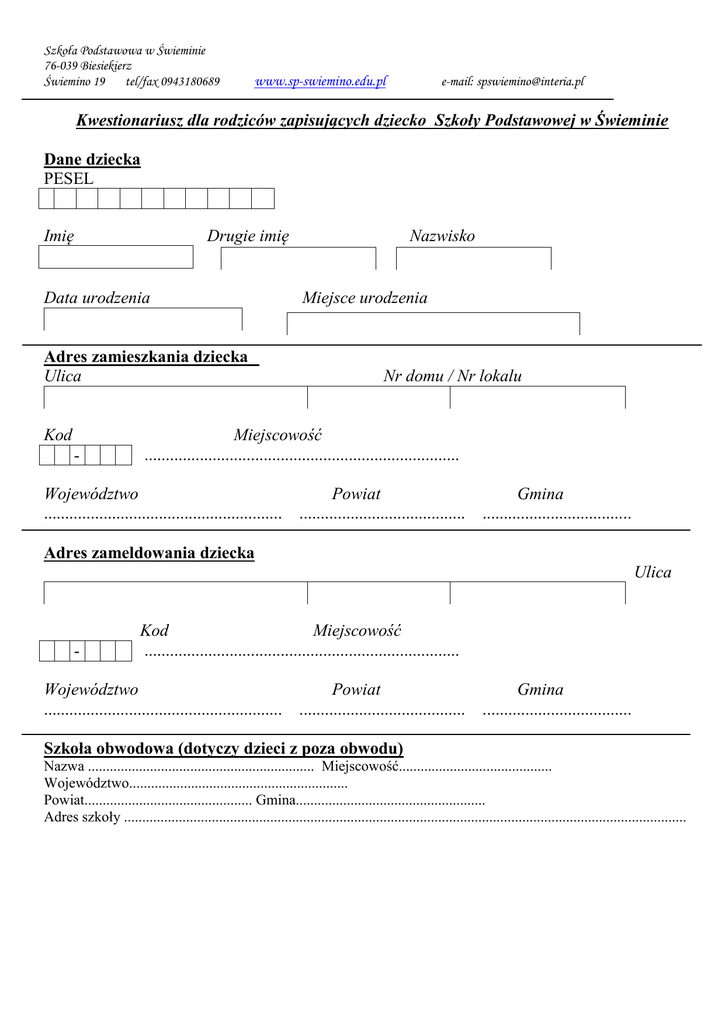 Szkoła Podstawowa w Świeminie 76-039 Biesiekierz Świemino 19 tel/fax 0943180689 www.sp-swiemino.edu.pl e-mail: [email protected] Kwestionariusz dla rodziców zapisujących dziecko Szkoły Podstawowej w Świeminie Dane dziecka PESEL Imię Drugie imię Data urodzenia Adres zamieszkania dziecka Ulica Kod - Nazwisko Miejsce urodzenia Nr domu / Nr lokalu Miejscowość .......................................................................... Województwo Powiat Gmina ........................................................ ....................................... ................................... Adres zameldowania dziecka Ulica - Kod Miejscowość .......................................................................... Województwo Powiat Gmina ........................................................ ....................................... ................................... Szkoła obwodowa (dotyczy dzieci z poza obwodu) Nazwa .............................................................. Miejscowość.......................................... Województwo............................................................ Powiat.............................................. Gmina.................................................... Adres szkoły .......................................................................................................................................................... Szkoła Podstawowa w Świeminie 76-039 Biesiekierz Świemino 19 tel/fax 0943180689 www.sp-swiemino.edu.pl e-mail: [email protected] Dane rodziców / prawnych opiekunów Dane matki /prawnej opiekunki* Dane ojca /prawnego opiekuna* Imię..................Nazwisko................................ Imię..................Nazwisko................................ Telefon ............................/............................... Telefon ............................/............................... Adres zamieszkania ( podać jeżeli jest inny niż dziecka) Adres zamieszkania ( podać jeżeli jest inny niż dziecka) Ulica..........................................Nr domu/Nr lokalu.................... Kod pocztowy ........-................Miejscowość................................ Ulica..........................................Nr domu/Nr lokalu.................... Kod pocztowy ........-................Miejscowość................................ Zakład pracy matki/opiekunki* s, telefon Zakład pracy ojca/opiekuna* Naz wa zakł adu prac y, adre Nazwa zakładu pracy, adres, telefon * niepotrzebne skreślić Deklaracja rodzica: Czy wyraża Pan/Pani zgodę aby Pana/ Pani dziecko uczęszczało na lekcję religii? TAK NIE Szkoła Podstawowa w Świeminie 76-039 Biesiekierz Świemino 19 tel/fax 0943180689 www.sp-swiemino.edu.pl e-mail: [email protected] Pytania dodatkowe: Czy dziecko ma w domu warunki do zabawy, jakie ? ....................................................................................................................................................... Jakie są ulubione zajęcia, zabawy dziecka w domu ? ....................................................................................................................................................... Czy dziecko wykazuje inicjatywę w organizowaniu sobie zabawy ? ....................................................................................................................................................... Czy ma jakieś obowiązki w domu, np. związane z samoobsługą, pomoc w sprzątaniu domu, itp. ? ....................................................................................................................................................... Czy chętnie przebywa wśród innych dzieci, jak się zachowuje ? ....................................................................................................................................................... Czy lubi słuchać bajek, oglądać książeczki, TV czy ma swoją ulubioną bajkę, jaką ? ....................................................................................................................................................... Ile czasu w ciągu dnia przebywa na powietrzu i pod opieką ? ....................................................................................................................................................... Czy w wychowaniu dziecka pomaga rodzina (np. babcia, dziadek, ciocia) ? ....................................................................................................................................................... Czy dziecko ma jakieś szczególne upodobania ? Co sprawia mu największą przyjemność, a czego się boi ? ....................................................................................................................................................... Czy wytrwale dąży do celu, czy szybko się zniechęca, gdy napotyka trudności(np. zdobyciu ulubionej zabawki) ? ....................................................................................................................................................... Jakie formy nagród stosowane są wobec dziecka w domu ? ....................................................................................................................................................... Co stanowi dla dziecka karę ? ....................................................................................................................................................... Jakie ma dziecko upodobania w jedzeniu, czy jest uczulony na jakiś rodzaj pożywienia ? ....................................................................................................................................................... Co należy zmienić w szkole, aby dziecko czuło się w niej dobrze ? ...................................................................................................................................................... Czy dziecko zna kolory ? ......................