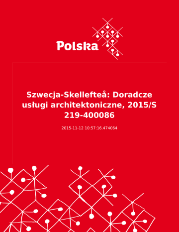 Szwecja-Skellefteå: Doradcze usługi architektoniczne, 2015/S 219-400086 2015-11-12 10:57:16.474064 2 Ta oferta nie stanowi informacji handlowej Dane kontaktowe Skellefteå kommun SE-931 91 Skellefteå Skeppargatan 16 Szwecja Osoba kontaktowa Anna Pakisjarvi [email protected] Tel: Opis przedmiotu zamówienia Doradcze usługi architektoniczne. Doradcze usługi inżynieryjne i budowlane. Usługi inżynieryjne w zakresie projektowania. Różne usługi inżynieryjne. Geofizyczne usługi doradcze. Doradcze usługi budowlane. Usługi zarządzania budową. Usługi w zakresie testowania technicznego, analizy i konsultacji technicznej. CPV ● ● ● ● ● ● ● ● Doradcze usługi architektoniczne Doradcze usługi inżynieryjne i budowlane Usługi inżynieryjne w zakresie projektowania Różne usługi inżynieryjne Geofizyczne usługi doradcze Doradcze usługi budowlane Usługi zarządzania budową Usługi w zakresie testowania technicznego, analizy i konsultacji technicznej 3 Forma przetargu Międzynarodowy Kraj Szwecja Adres WWW ted.europa.eu/udl?uri=TED:NOTICE:400086-2015:TEXT:PL:HTML&src=0 Termin składania ofert 21.12.2015 Ważna od 12.11.2015 Branże Budownictwo i architektura, 4