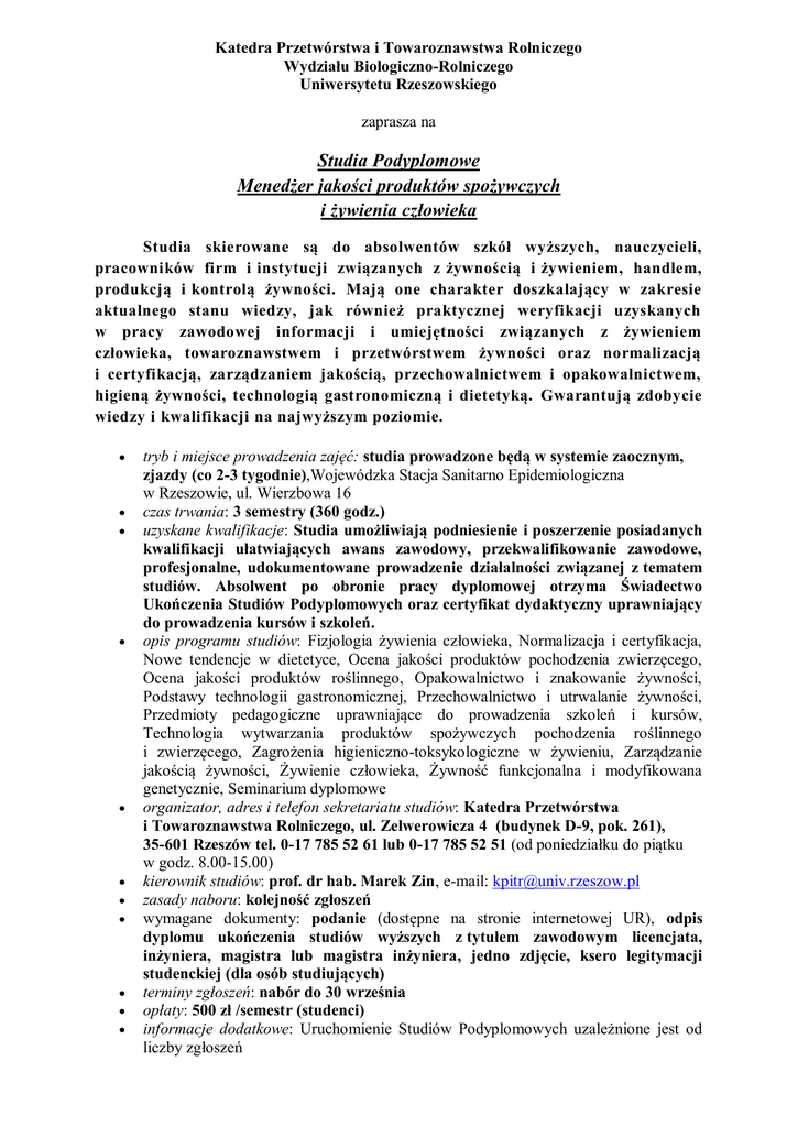 Katedra Przetwórstwa i Towaroznawstwa Rolniczego Wydziału Biologiczno-Rolniczego Uniwersytetu Rzeszowskiego zaprasza na Studia Podyplomowe Menedżer jakości produktów spożywczych i żywienia człowieka Studia skierowane są do absolwentów szkół wyższych, nauczycieli, pracowników firm i instytucji związanych z żywnością i żywieniem, handlem, produkcją i kontrolą żywności. Mają one charakter doszkalający w zakresie aktualnego stanu wiedzy, jak również praktycznej weryfikacji uzyskanych w pracy zawodowej informacji i umiejętności związanych z żywieniem człowieka, towaroznawstwem i przetwórstwem żywności oraz normalizacją i certyfikacją, zarządzaniem jakością, przechowalnictwem i opakowalnictwem, higieną żywności, technologią gastronomiczną i dietetyką. Gwarantują zdobycie wiedzy i kwalifikacji na najwyższym poziomie. tryb i miejsce prowadzenia zajęć: studia prowadzone będą w systemie zaocznym, zjazdy (co 2-3 tygodnie),Wojewódzka Stacja Sanitarno Epidemiologiczna w Rzeszowie, ul. Wierzbowa 16 czas trwania: 3 semestry (360 godz.) uzyskane kwalifikacje: Studia umożliwiają podniesienie i poszerzenie posiadanych kwalifikacji ułatwiających awans zawodowy, przekwalifikowanie zawodowe, profesjonalne, udokumentowane prowadzenie działalności związanej z tematem studiów. Absolwent po obronie pracy dyplomowej otrzyma Świadectwo Ukończenia Studiów Podyplomowych oraz certyfikat dydaktyczny uprawniający do prowadzenia kursów i szkoleń. opis programu studiów: Fizjologia żywienia człowieka, Normalizacja i certyfikacja, Nowe tendencje w dietetyce, Ocena jakości produktów pochodzenia zwierzęcego, Ocena jakości produktów roślinnego, Opakowalnictwo i znakowanie żywności, Podstawy technologii gastronomicznej, Przechowalnictwo i utrwalanie żywności, Przedmioty pedagogiczne uprawniające do prowadzenia szkoleń i kursów, Technologia wytwarzania produktów spożywczych pochodzenia roślinnego i zwierzęcego, Zagrożenia higieniczno-toksykologiczne w żywieniu, Zarządzanie jakością żywności, Żywienie człowieka, Żywność funkcjonalna i modyfikowana genetycznie, Seminarium dyplomowe organizator, adres i telefon sekretariatu studiów: Katedra Przetwórstwa i Towaroznawstwa Rolniczego, ul. Zelwerowicza 4 (budynek D-9, pok. 261), 35-601 Rzeszów tel. 0-17 785 52 61 lub 0-17 785 52 51 (od poniedziałku do piątku w godz. 8.00-15.00) kierownik studiów: prof. dr hab. Marek Zin, e-mail: [email protected] zasady naboru: kolejność zgłoszeń wymagane dokumenty: podanie (dostępne na stronie internetowej UR), odpis dyplomu ukończenia studiów wyższych z tytułem zawodowym licencjata, inżyniera, magistra lub magistra inżyniera, jedno zdjęcie, ksero legitymacji studenckiej (dla osób studiujących) terminy zgłoszeń: nabór do 30 września opłaty: 500 zł /semestr (studenci) informacje dodatkowe: Uruchomienie Studiów Podyplomowych uzależnione jest od liczby zgłoszeń