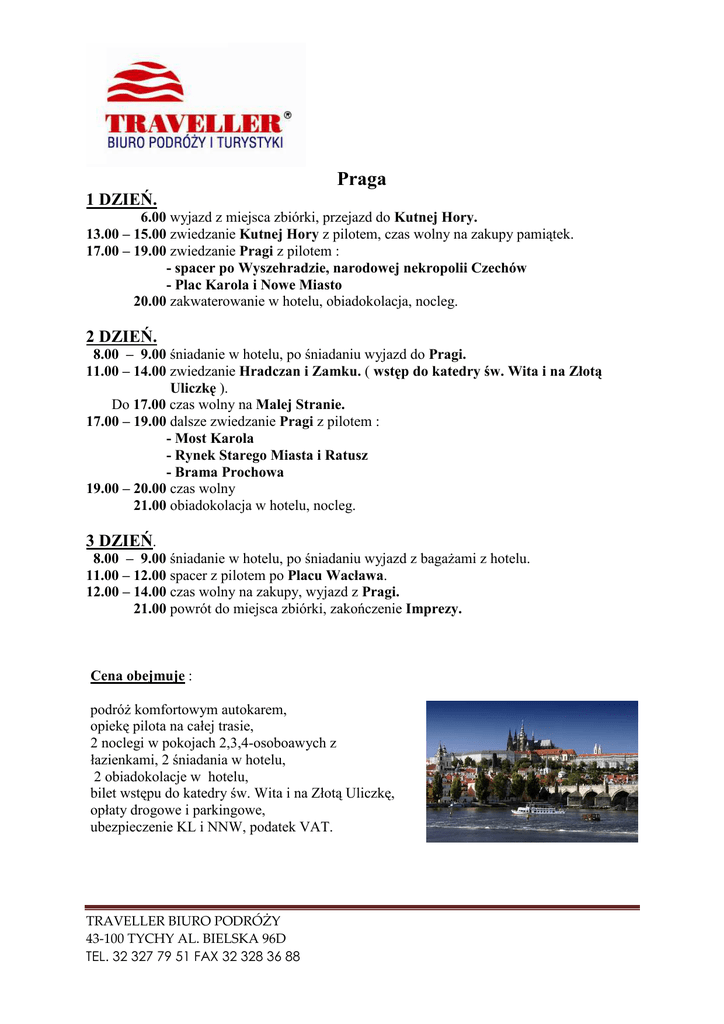 Praga 1 DZIEŃ. 6.00 wyjazd z miejsca zbiórki, przejazd do Kutnej Hory. 13.00 – 15.00 zwiedzanie Kutnej Hory z pilotem, czas wolny na zakupy pamiątek. 17.00 – 19.00 zwiedzanie Pragi z pilotem : - spacer po Wyszehradzie, narodowej nekropolii Czechów - Plac Karola i Nowe Miasto 20.00 zakwaterowanie w hotelu, obiadokolacja, nocleg. 2 DZIEŃ. 8.00 – 9.00 śniadanie w hotelu, po śniadaniu wyjazd do Pragi. 11.00 – 14.00 zwiedzanie Hradczan i Zamku. ( wstęp do katedry św. Wita i na Złotą Uliczkę ). Do 17.00 czas wolny na Malej Stranie. 17.00 – 19.00 dalsze zwiedzanie Pragi z pilotem : - Most Karola - Rynek Starego Miasta i Ratusz - Brama Prochowa 19.00 – 20.00 czas wolny 21.00 obiadokolacja w hotelu, nocleg. 3 DZIEŃ. 8.00 – 9.00 śniadanie w hotelu, po śniadaniu wyjazd z bagaŜami z hotelu. 11.00 – 12.00 spacer z pilotem po Placu Wacława. 12.00 – 14.00 czas wolny na zakupy, wyjazd z Pragi. 21.00 powrót do miejsca zbiórki, zakończenie Imprezy. Cena obejmuje : podróŜ komfortowym autokarem, opiekę pilota na całej trasie, 2 noclegi w pokojach 2,3,4-osoboawych z łazienkami, 2 śniadania w hotelu, 2 obiadokolacje w hotelu, bilet wstępu do katedry św. Wita i na Złotą Uliczkę, opłaty drogowe i parkingowe, ubezpieczenie KL i NNW, podatek VAT. TRAVELLER BIURO PODRÓŻY 43-100 TYCHY AL. BIELSKA 96D TEL. 32 327 79 51 FAX 32 328 36 88