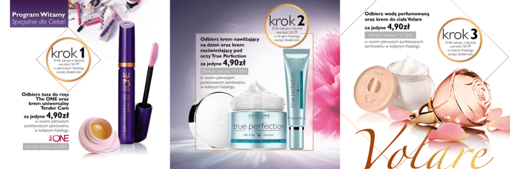 Program Witamy Specjalnie dla Ciebie! krok 1 Zrób zakupy o łącznej wartości 50 PP w pierwszym Katalogu swojej działalności krok 2 Odbierz krem nawilżający na dzień oraz krem rozświetlający pod oczy True Perfection za jedyne 4,90zł Wartość zestawu 114,80zł w swoim pierwszym punktowanym zamówieniu w kolejnym Katalogu Odbierz tusz do rzęs The ONE oraz krem uniwersalny Tender Care za jedyne 4,90zł w swoim pierwszym punktowanym zamówieniu w kolejnym Katalogu Wartość zestawu 63,80zł Zrób zakupy o łącznej wartości 50 PP w drugim Katalogu swojej działalności Odbierz wodę perfumowaną oraz krem do ciała Volare za jedyne 4,90zł Wartość zestawu 127,80zł w swoim pierwszym punktowanym zamówieniu w kolejnym Katalogu krok 3 Zrób zakupy o łącznej wartości 50 PP w trzecim Katalogu swojej działalności 1 3 Wyglądaj świetnie Oferujemy bogatą gamę produktów wysokiej jakości, dzięki którym będziesz wyglądać i czuć się doskonale. Nasze produkty inspirowane są naturą i zostały opracowane przy wykorzystaniu najnowocześniejszych technologii 2 Zarabiaj pieniądze Zarabiasz pieniądze od razu, a Twoje możliwości zarobkowe są nieograniczone. Współpracujesz z Oriflame w zgodzie ze swoim stylem życia i samodzielnie decydujesz, ile czasu chcesz nam poświęcić Baw się doskonale Spotykasz nowych ludzi i zawierasz nowe przyjaźnie. Podróżujesz po świecie i uczestniczysz w ekscytujących wydarzeniach. Rozwijasz się osobiście i zawodowo dzięki oferowanem przez nas systemom szkoleń biznesowych i kosmetycznych Jak dołączyć do Oriflame? Program Witamy Oferta dla nowych Konsultantów Skontaktuj się z Konsultantem w celu dopełnienia formalności i poznaj wspaniały Świat Oriflame Dołącz do Oriflame za jedyne 4,90zł 306,40zł! Twój Konsultant KROK 1 oszczędzasz Łączna wartość nagród Łącznie oszczędzasz 58,90zł! KROK 2 oszczędzasz 109,90zł! 291,70zł! KROK 3 oszczędzasz 122,90zł! Kod: 113898.1 3 powody, dla których warto dołączyć do Oriflame Oriflame Poland Sp. z o.o. ul. Wołoska 22, 02-675 Warszawa www.oriflame.pl