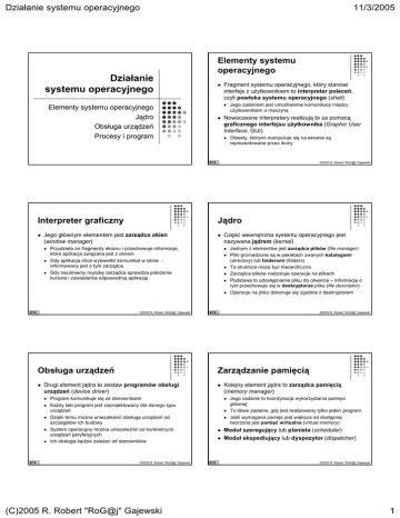 Działanie systemu operacyjnego 11/3/2005 Elementy systemu operacyjnego Działanie systemu operacyjnego ! Elementy systemu operacyjnego Jądro Obsługa urządzeń Procesy i program Fragment systemu operacyjnego, który stanowi interfejs z użytkownikiem to interpreter poleceń, czyli powłoka systemu operacyjnego (shell) ! ! Jego zadaniem jest umożliwienie komunikacji między użytkownikiem a maszyną Nowoczesne interpretery realizują to za pomocą graficznego interfejsu użytkownika (Graphic User Interface, GUI) ! Obiekty, którymi manipuluje się na ekranie są reprezentowane przez ikony 2/12 Interpreter graficzny ! Jądro Jego głównym elementem jest zarządca okien (window manager) ! ! ! ©2005 R. Robert ‘RoG@j’ Gajewski ! Przydziela on fragmenty ekranu i przechowuje informacje, która aplikacja związana jest z oknem Gdy aplikacja chce wyświetlić komunikat w oknie informowany jest o tym zarządca Gdy naciśniemy myszkę zarządca sprawdza położenie kursora i zawiadamia odpowiednią aplikację Część wewnętrzna systemu operacyjnego jest nazywana jądrem (kernel) ! ! ! ! ! ! 3/12 ©2005 R. Robert ‘RoG@j’ Gajewski 4/12 Obsługa urządzeń ! ! ! ! ! 5/12 ©2005 R. Robert ‘RoG@j’ Gajewski Zarządzanie pamięcią Drugi element jądra to zestaw programów obsługi urządzeń (device driver) ! Jednym z elementów jest zarządca plików (file manager) Pliki gromadzone są w pakietach zwanych katalogami (directory) lub folderami (folders) Ta struktura może być hierarchiczna Zarządca plików nadzoruje operacje na plikach Podstawa to udostępnienie pliku do otwarcia – informację o tym przechowuje się w deskryptorze pliku (file descriptor) Operacje na pliku dokonuje się zgodnie z deskryptorem ! Program komunikuje się ze sterownikami Każdy taki program jest zaprojektowany dla danego typu urządzeń Dzięki temu można uniezależnić obsługę urządzeń od szczegółów ich budowy System operacyjny można uniezależnić od konkretnych urządzeń peryferyjnych Ich obsługa będzie zależeć od sterowników ©2005 R. Robert ‘RoG@j’ Gajewski (C)2005 R. Robert "RoG@j" Gajewski Kolejny element jądra to zarządca pamięcią (memory manager) ! ! ! ! ! 6/12 Jego zadanie to koordynacja wykorzystania pamięci głównej To łatwe zadanie, gdy jest realizowany tylko jeden program Jeśli wymagana pamięć jest większa od dostępnej tworzona jest pamięć wirtualna (virtual memory) Moduł szeregujący lub planista (scheduler) Moduł ekspediujący lub dyspozytor (dispatcher) ©2005 R. Robert ‘RoG@j’ Gajewski 1 Działanie systemu operacyjnego 11/3/2005 Uruchamianie systemu ! Prawdziwe komputery… Jak uruchamia się system operacyjny? ! ! ! ! ! ! Dokonuje się to za pomocą procedury ładowania początkowego lub rozruchowej (boot strapping) Jednostkę centralną konstruuje się w taki sposób, że po włączeniu do licznika rozkazów ładuje się określoną wielkość Ta porcja zapisana jest w pamięci stałej ROM Proste urządzenia sterowane mikroprocesorami mają w zasadzie jedynie pamięć ROM Wykonywany jest bowiem tylko jeden program ! W ‘prawdziwych’ komputerach jedynie niewielka część pamięci to ROM Mały program, który jest tam zapisany na stałe to program ładujący lub rozruchowy (bootstrap) ! ! ! ! ! 7/12 ©2005 R. Robert ‘RoG@j’ Gajewski 8/12 Proces ! ! ! ! ! ©2005 R. Robert ‘RoG@j’ Gajewski Różnice proces - program Rozróżnienie pojęciowe programu i czynności polegającej na wykonywaniu programu ! ! Program to statyczny ciąg rozkazów Wykonywanie programu to czynność dynamiczna Ta czynność nosi nazwę procesu (process) Proces zawiera informacje o bieżącym stanie wykonania zwane stanem procesu (process state) Stan procesu to jakby fotografia systemu komputerowego w danej chwili ©2005 R. Robert ‘RoG@j’ Gajewski ! ! ! ! ! ! 11/12 ©2005 R. Robert ‘RoG@j’ Gajewski ! Moduł szeregujący (planista) Moduł ekspediujący (dyspozytor) Dyspozytor to część jądra, która dba o to, by były wykonywane odpowiednie procesy ! Moduł szeregujący przechowuje w pamięci tablice procesów (process table) z informacjami o wszystkich procesach Procesy mogą być w dwóch stanach ! Koordynacja działania procesów to zadanie systemu operacyjnego Komunikacja między procesami to komunikacja międzyprocesowa (interprocess communication) Dyspozytor Koordynację procesów wykonują: ! ! ! (C)2005 R. Robert "RoG@j" Gajewski ! ! 12/12 Wykonanie następuje w kwantach (quantum, time slice) Procedura zmiany aktualnie wykonywanych procesów to przełączanie procesów (process switch) Po wykonaniu kwantu system generuje sygnał zwany przerwaniem (interrupt) ! Proces jest gotowy (ready) jeśli jest w stanie, który umożliwia jego wykonanie Proces jest oczekujący (waiting) jeśli jego wykonanie odłożono na później ©2005 R. Robert ‘RoG@j’ Gajewski Dwóch użytkowników może w tym samym czasie edytować dwa różne dokumenty wykorzystując ten sam program System operacyjny będzie utrzymywał jedną kopię programu, z której będą korzystać użytkownicy w swoich kwantach czasu 10/12 Administrowanie procesami ! Jeden program może być związany z wieloma procesami ! ! 9/12 Wykonuje się on automatycznie po włączeniu komputera Jednostka centralna przenosi dane z określonego miejsca pamięci masowej (dysku) do pamięci operacyjnej RAM Po tej operacji kontrolę przejmuje system operacyjny Najczęściej zachodzi próba czytania systemu z… dyskietki Można sobie wyobrazić system ładowany z CD / DVD Jednostka centralna przerywa działanie Wtedy uruchamia się program obsługi przerwań (interrupt handler) Dyspozytor znowu przejmuje kontrolę… ©2005 R. Robert ‘RoG@j’ Gajewski 2