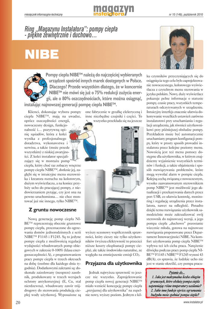 miesięcznik informacyjno-techniczny nr 10 (146), październik 2010 Ring „Magazynu Instalatora”: pompy ciepła - piękne zewnętrznie i duchowo… NIBE PompyciepłaNIBETM należądonajczęściejwybieranych urządzeńspośródinnychmarekdostępnychwPolsce. Dlaczego?Przedewszystkimdlatego,żewkoncernie NIBETM niemówisięjużo75%redukcjizużyciaenergii,aleo80%oszczędnościach,któremożnaosiągnąć, instalującnajnowszejgeneracjipompęciepłaNIBETM. Klienci, dokonując wyboru pompy ciepła NIBETM, mają na uwadze, oprócz oszczędności energii, nowoczesnydesign,funkcjonalność i… pozytywną opinię sąsiadów, która z kolei wynika z profesjonalnego doradztwa, wykonawstwa i serwisu,atakże(możeprzede wszystkim)zniskiejawaryjności.Zkoleiinstalatorspecjalizujący się w montażu pomp ciepła,którychoćrazzobaczywnętrze pompyciepłaNIBETM,dotkniejej,zagłębisięwintuicyjnemenusterownikaikreatorarozruchunakolorowym, dużymwyświetlaczu,anakoniecprzyłożyuchodopracującejpompy,zniedowierzaniempytając,czyjestonana pewnouruchomiona…niechcemontowaćjużnicinnego,tylkoNIBETM. Przyjaznadlaużytkownika kuczynnikówprzyczyniającychsiędo osiągnięciategocelubyłozaprojektowanienowoczesnego,kolorowegowyświetlaczazczytelnymmenusterowaniaw językupolskim.Nowy,dużywyświetlacz pokazuje pełne informacje o statusie pompy,czasiepracy,wszystkichtemperaturachodczytywanychwurządzeniu. Intuicyjnyinterfejsznacznieułatwiadokonywaniewszelkichustawieńzarówno instalatorowiprzyuruchamianiuiregulacjiurządzenia,jakrównieżużytkownikowiprzypóźniejszejobsłudzepompy. Przykładem może być automatycznie uruchamianyprogramkonfiguracjipompy,którywprostysposóbprowadziinstalatoraprzezkolejnepoziomymenu. Nowością jest też menu pomocy dostępnedlaużytkownika,wktórymznajdziemywyjaśnieniewszystkichterminówifunkcji,atakżeobjaśnieniaisposób rozwiązywania problemów, które mogąwywołaćalarmwpompieciepła. Kolejnącechązwiązanąznowoczesnym, wysokozaawansowanymsterownikiem pompNIBETM jestmożliwośćjegoaktualizacjiiprzekazywaniadanychprzez portUSB,coułatwiakontrolę,monitoringiregulacjęurządzeniaprzezinstalatora, nawet na odległość. Ponadto dziękitemurozwiązaniuużytkowniksamodzielnie może zaktualizować swój sterownikdonajnowszejwersji,ajego pompa ciepła „duchowo” pozostanie wieczniemłoda,gotowananajnowsze rozwiązaniaproponowaneprzezDepartamentInnowacyjnościNIBE.NakomfortużytkowaniapompciepłaNIBETM wpływateżichcichapraca.Natężenie dźwiękupodczaspracypompciepłaNIBETM F1145iNIBETM F1245wynosi43 dB(A),cosprawia,żeludzkieuchonie jestwstanieokreślić,czypompapracu- Jednaknajwyższasprawnośćtojeszcze nie wszystko. Zaprojektowanie pompciepłanowejgeneracjiNIBETM miałowznieśćkoncepcjępompyciepła „przyjaznejdlaużytkownika”nazupełnienowy,wyższypoziom.Jednymzkil- Pytaniedo... 1.Jakajestmaksymalnaliczbaobiegów grzewczych,któreobsłużypompaciepła zapewniającróżnetemperaturyzasilania? 2.Jakieinnefunkcjeopróczogrzewania budynkumożespełniaćpompaciepła? onefabryczniewgrzałkęelektrycznąi inne niezbędne czujniki i części. To wszystkoprzekładasięnajeszcze Zgruntunowoczesne Nową generację pomp ciepła NIBETM reprezentująobecniegruntowe pompyciepła,przeznaczonedoogrzewaniadomówjednorodzinnychzserii NIBETM F1145iF1245.Sątojedyne pompyciepłazmożliwościąregulacji wydajnościwbudowanychpompobiegowychwzakresie0-100%(klasaenergooszczędnościA),zprogramowaniem pracypompyciepławtrzechokresach nadobę(osobnodlakażdegodniatygodnia).Dodatkowymizaletamisą:doskonalezaizolowany(neopren)zasobnik, produkowany w trzech wersjach ochrony antykorozyjnej (E, Cu, stal nierdzewna), wbudowany zawór trójdrogowydosterowaniaprodukcjąciepłej wody użytkowej. Wyposażone są 20 wyższysezonowywspółczynniksprawności,którycieszynietylkoużytkowników(wyższaefektywnośćtoprzecież niższekosztyeksploatacjipompyciepła),aletakżeśrodowiskonaturalne,ze względunazmniejszenieemisjiCO2. www.instalator.pl Instalacja pewna jak... miesięcznik informacyjno-techniczny je, a konkurencja nie jest w stanie dorównać koncernowi NIBE. Wartością dodaną z punktu widzenia instalatora i serwisanta są udogodnienia w budowie pompy ciepła, np. wysuwany moduł chłodniczy, który może być montowany osobno (urządzenia montowane osobno są lżejsze i poręczniejsze przy wnoszeniu) lub serwisowany niezależnie od pompy ciepła. Dzięki takiemu rozwiązaniu wszystkie czynności serwisowe mogą być wykonywane od przodu pompy ciepła, co eliminuje konieczność zdejmowania pokryw bocznych i pozostawiania wolnej przestrzeni wokół urządzenia. Wszystkie króćce podłączeniowe wyprowadzone są na górze urządzenia, a zbiorniki i akcesoria idealnie pasujące do pompy ciepła powodują, że wszelkie połączenia rurowe stają się niewidoczne. Urządzenia niemal w każdej konfiguracji stanowią zwartą, jednolitą bryłę z eleganckim, ponadczasowym wyglądem. Pożądany owoc Przedstawicielem pomp ciepła nowej generacji jest także powietrzna pompa ciepła NIBETM Split, która powstała jako owoc współpracy między szwedzkim koncernem NIBE AB i japońskim Mitsubishi Heavy Industries Ltd. Jest to urządzenie typu powietrze/woda składające się z jednostki zewnętrznej i wewnętrznej, które utrzymuje komfort cieplny w budynku przez cały rok, zapewniając jednocześnie ogrzewanie, chłodzenie i ciepłą wodę użytkową. NIBETM Split oparta jest na technologii inwerterowej, zapewniającej wyższą niż w przypadku tradycyjnych pomp efektywność pracy, dzięki dowww.instalator.pl stosowywaniu mocy sprężarki (w zakresie 3,5-12 kW zgodnie z EN14511 A7/W45) do aktualnego zapotrzebowania budynku na ciepło. Brak konieczności wykonywania kolektora gruntowego, cicha praca, szeroki zakres temperatury pracy (od -20 do +43°C), zintegrowany wężownicowy wymiennik ciepłej wody użytkowej o pojemności 270 l, wbudowana grzałka elektryczna o maksymalnej mocy 9 kW i 