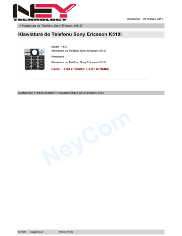 Utworzono : 01 marzec 2011 > Klawiatura do Telefonu Sony Ericsson K510i Klawiatura do Telefonu Sony Ericsson K510i Model : 1442 Klawiatura do Telefonu Sony Ericsson K510i Producent : Klawiatura do Telefonu Sony Ericsson K510i Cena : 3,53 zł Brutto ( 2,87 zł Netto) Dostępność: Produkt dostępny w naszym sklepie od 09 grudzień 2010 C y m o e N kontakt : - [email protected] Strona 1/{nb}