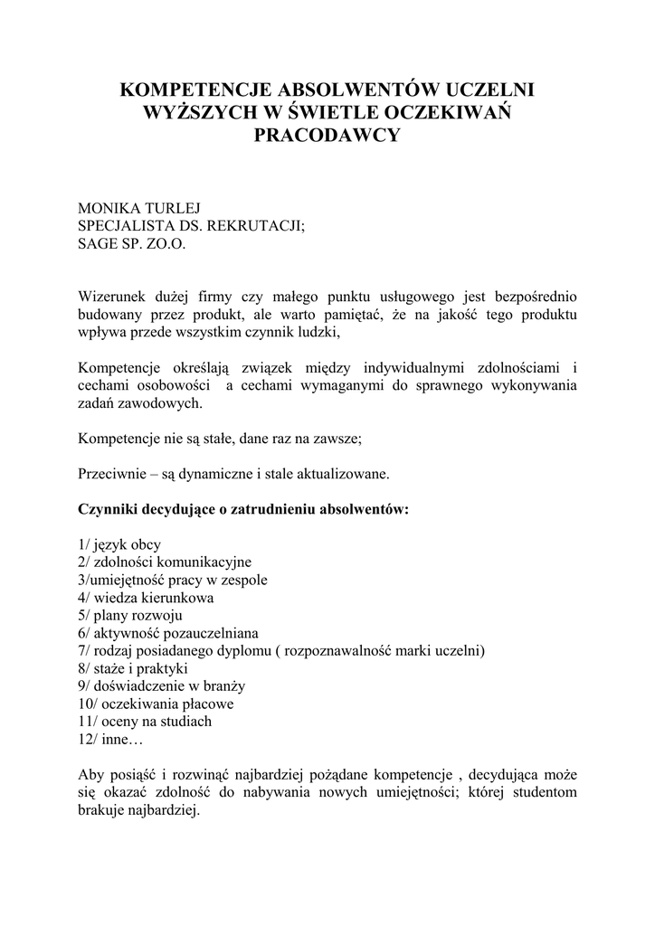 KOMPETENCJE ABSOLWENTÓW UCZELNI WYŻSZYCH W ŚWIETLE OCZEKIWAŃ PRACODAWCY MONIKA TURLEJ SPECJALISTA DS. REKRUTACJI; SAGE SP. ZO.O. Wizerunek dużej firmy czy małego punktu usługowego jest bezpośrednio budowany przez produkt, ale warto pamiętać, że na jakość tego produktu wpływa przede wszystkim czynnik ludzki, Kompetencje określają związek między indywidualnymi zdolnościami i cechami osobowości a cechami wymaganymi do sprawnego wykonywania zadań zawodowych. Kompetencje nie są stałe, dane raz na zawsze; Przeciwnie – są dynamiczne i stale aktualizowane. Czynniki decydujące o zatrudnieniu absolwentów: 1/ język obcy 2/ zdolności komunikacyjne 3/umiejętność pracy w zespole 4/ wiedza kierunkowa 5/ plany rozwoju 6/ aktywność pozauczelniana 7/ rodzaj posiadanego dyplomu ( rozpoznawalność marki uczelni) 8/ staże i praktyki 9/ doświadczenie w branży 10/ oczekiwania płacowe 11/ oceny na studiach 12/ inne… Aby posiąść i rozwinąć najbardziej pożądane kompetencje , decydująca może się okazać zdolność do nabywania nowych umiejętności; której studentom brakuje najbardziej. Kompetencje i kwalifikacje których studentom i absolwentom brakuje najbardziej: 1/ zdolność do nabywania nowych umiejętności 2/ wiedza kierunkowa 3/ zdolności komunikacyjne 4/ znajomość języków obcych 5/ umiejętność zastosowania wiedzy w praktyce zawodowej 6/ umiejętność pracy w zespole 7/ umiejętność samodzielnej analizy i wyciągania wniosków 8/ umiejętność podejmowania decyzji Poważnym problemem polskiego systemu edukacji jest niewystarczające dopasowanie go do szybko zmieniających się wymagań rynku pracy. Dopasowanie kompetencji kandydatów do rynku pracy na każdym etapie kształcenia jest bardzo ważne; a szczególnie dla młodych ludzi wchodzących w sferę gospodarki. Młodzi ludzie na tym etapie budują swoją tożsamość i poczucie własnej wartości i aby mogli sprostać wymaganiom rynku muszą być dobrze wykształceni i posiadać odpowiednie kompetencje. Osoby szukające zatrudnienia, zdają sobie sprawę, że na współczesnym rynku pracy już nie wystarczy dyplom ukończenia studiów wyższych. Wymagania rekrutacyjne stale rosną a każdy pracodawca zwraca uwagę również, jeśli nie przede wszystkim na inne cechy kandydatka , najczęściej określane mianem KOMPETENCJI MIĘKKICH. Należą one do najbardziej pożądanych wymogów. Bo kompetencje pracownika to nie tylko jego wykształcenie i kwalifikacje , ale to jego osobowość , system wartości , postawy wpływające na wynik pracy oraz zaangażowanie. Jest to pewien potencjał który uwidacznia się w zachowaniu człowieka, w interakcji czy realizacji zadań. Czyli: kompetencje miękkie to cechy wnoszone do poszczególnych ról zawodowych. Sądzę, że to właśnie kompetencje osobowościowe decydują o wartości nowoczesnych firm. Podczas kilku etapowych rekrutacji, ocenia się kompetencje kandydatów, wychodząc z założenia że jeśli prezentują wymagane cechy to braki w wiedzy i umiejętnościach można uzupełnić szkoleniami i kursami. W przypadku ludzi młodych , absolwentów uczelni wyższych , ich osobowość , jest często decydującym kryterium podczas zatrudniania. W ogłoszeniach o wakatach, stażach , pracodawcy umieszczają listę wymagań stawianych potencjalny kandydatom. Znajomość tych wymagań pozwala kandydatom rzetelnie „ odrobić lekcje” i przygotować się do rekrutacji. Jednak obecnie coraz częściej nie ujawnia się dodatkowych oczekiwań i kryteriów doboru; słusznie zakładając, że dzięki temu wzrasta prawdopodobieństwo uzyskania obiektywnej informacji o potencjale kandydata. Termin KWALIFIKACJE oznacza ogólnie akceptowane normy wymagań, opisujące niezbędne umiejętności i wiedzę do danego zawodu. Często zamiennie w miejsce terminu kwalifikacje używa się terminu KOMPETENCJE. Międzynarodowa Organizacja Pracy określa KWALIFIKACJE jako dotyczące sfery edukacji i oznaczają wyuczone lub nabyte w drodze doświadczenia sprawności lub umiejętności potrzebne do wykonywania danej pracy. KOMPETENCJE zaś dotyczą sfery pracy i są określane jako zdolność wykonywania zadań w zawodzie dobrze lub skutecznie, zgodnie z wymaganiami stanowiska pracy, wspierane umiejętnościami i wiadomościami oraz cechami psychofizycznymi. Można się pokusić o stwierdzenie że kompetencje pracownika są pochodną kwalifikacji i składają się nie tylko z wiedzy , doświadczenia , zdolności i umiejętności , ale także z cech psychologicznych człowieka ( wrodzonych lub nabytych), jak osobowość, inteligencja , odporność na stres , sposoby rozumowania , reakcje i zachowania w określonych sytuacjach, ale też powierzchowność lub kultura osobista. Czyli dla ludzi młodych nie posiadających bogatego doświadczenia,, czynnikiem decydującym jest posiadanie pewnych cech . Oczywiście występuje tu też pewna różnica, gdyż koncerny międzynarodowe akcentują umiejętności i predyspozycje kandydatów i wykazują się większą elastycznością w rekrutacji; Natomiast instytucje lokalne przywiązują ogromną wagę do wykształcenia akademickiego. Student, aby stać się pożądanym na rynku pracy kandydatem, powinien: - w miarę wcześnie zaplanować ścieżkę edukacji i kariery zawodowej; ustalić hierarchię poszczególnych kompetencji w odniesieniu do planów i priorytetów osobistych; - poznać siebie – określić swoje mocne i słabe strony oraz sposoby niwelowania ewentualnych niedociągnięć; - rozwijać własne kompetencje poprzez aktywne uczestnictwo w organizacjach studenckich i kołach zainteresowań; - interesować się współczesnym rynkiem pracy i wymaganiami pracodawców - zdobywać doświadczenie poprzez praktyki i staże zawodowe Uczelnia , powinna - wyposażyć absolwenta w dobrą i nowoczesną wiedzę kierunkową, biegłą znajomość języków obcych - rozwijać takie formy edukacji jak ćwiczenia, gry, symulacje, case