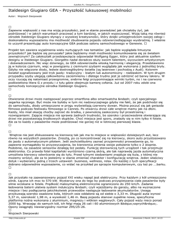 AutoRok.PL / DesignForum.PL Italdesign Giugiaro GEA - Przyszłość luksusowej mobilności Autor: Wojciech Sierpowski Zapewne większość z nas ma wizję przyszłości, jest w stanie powiedzieć jak chciałoby żyć, jak podróżować i w jakich warunkach pracować a tym bardziej, w jakich wypoczywać. Wizję taką ma również ośrodek Italdesign Giugiaro słynący z wysokiej kreatywności, który dzięki umiejętnościom swojej załogi i doskonałemu wyposażeniu ma możliwość zbudowania pojazdu odzwierciedlającego wyobraźnię. I właśnie to uczynił prezentując auto koncepcyjne GEA podczas salonu samochodowego w Genewie. Projekt ten zawiera wyjaśnienia wielu nurtujących nas tematów: jak będzie wyglądała limuzyna przyszłości? jak będzie się poruszała? jakie będziemy mieli możliwości komunikowania się ze światem zewnętrznym? Za całokształt przedsięwzięcia odpowiadał Wolfgang Egger, który jest aktualnie szefem designu w Italdesign Giugiaro. Giorgetto nadal doradczo służy swoim talentem, wyczuciem artystycznym i doświadczeniem. Nic więc dziwnego, że GEA odzwierciedla włoską harmonię i elegancję. Przedstawiono ją w kolorze czarnym, więc w powiązaniu z ciemnymi szybami wyglądała jak wykonana z jednolitej bryły. Gdyby nie włączone diody, ledwie dostrzeglibyśmy światła (są laserowe i pochodzą z Audi). Kolorem świateł sygnalizowany jest tryb jazdy: tradycyjny - białym lub autonomiczny - niebieskim. W tym drugim przypadku szyby ulegają całkowitemu zaciemnieniu i dlatego trudno jest je odróżnić od barwy lakieru. W oczy rzucają się natomiast przeogromne, srebrne felgi przypominające wirniki turbin, no i na czerwono podświetlona litera G z przodu i z tyłu gdzie obejmuje kamerę cofania. Już od 2007 roku zdobi ona samochody koncepcyjne ośrodka Italdesign Giugiaro. Otwieranie drzwi może następować poprzez smartfona albo smartwatcha – czyli specjalnego zegarka ręcznego. Być może nie byłoby w tym nic nadzwyczajnego gdyby nie fakt, że jak podchodzi się do samochodu, diody umieszczone w progu wyświetlają czerwony dywan. Można poczuć się jak gwiazda filmowa podczas festiwalu filmowego w Cannes. Po otwarciu drzwi całe wnętrze mamy jak na dłoni. Każdy, kto miał okazję choćby zajrzeć do środka, z pewnością zaskoczony był przestrzenią i rozwiązaniami. Zajęcie miejsca nie sprawia żadnych trudności, bo szeroko i przeciwsobnie otwierające się drzwi nie pozostawiają środkowych słupków. Choć miejsca jest sporo, znalazły się w nim tylko 4 fotele. Ale za to każdy z pasażerów może podróżować nie gorzej niż w lotniczej pierwszej klasie. Wnętrze nie jest sfokusowane na kierowcę tak jak ma to miejsce w większości dzisiejszych aut, lecz równo na wszystkich pasażerów. Zresztą, po co koncentrować się na kierowcy, skoro auto przystosowano do jazdy z automatycznym pilotem. Jeśli zechcielibyśmy zaznać przyjemności prowadzenia go, to zapewne wymagałoby to przyzwyczajenia, bo kierownica zmienia swoje położenie tylko o 2 stopnie. Podobnie, na zasadzie sensorów działają też pedały. Funkcję sterowniczą tych urządzeń i tak przejmuje elektronika. Co prawda fotel kapitański wyróżniono czarną skórą, ale tak naprawdę jazda automatyczna umożliwia kierowcy odwrócenie się do tyłu. Przed tylnymi siedzeniami znajduje się kula, z której nie możemy wróżyć, ale za to jesteśmy w stanie zmieniać charakter i konfigurację wnętrza. Jeden właściwy dotyk i wybieramy jedną z trzech ustawień: business, wellness, relax. Do każdej z tych specyfikacji dobrano odpowiednie wyposażenie, co widać na przykład po sprzęcie komputerowym, czy też po ...barku. Jak przystało na zaawansowany pojazd XXI wieku napęd jest elektryczny. Przy każdym z kół umieszczono silnik. Łączna ich moc to 570 kW. Wystarczy ona do tego by podczas przyspieszania ciała pasażerów były silnie wciskane w fotele. Prędkość maksymalną elektronicznie ograniczono do 250 km/h. Zadanie ładowania baterii ułatwia system indukcyjny – czyli wjeżdżamy do garażu, albo na wyznaczone miejsce i bez podłączania jakichkolwiek przewodów następuje ładowanie akumulatorów. Uwagę przykuwają szeroko osadzone koła, których osie oddalone są od siebie o 3,33 m. Długość auta wynosi 5,37 m, szerokość 1,98 m, a wysokość 1,46 m. Bazę pojazdu stanowi zupełnie nowa, specyficzna platforma nośna wykonana z aluminium, magnezu i włókien węglowych. Cały pojazd waży nieco ponad 2000 kg. Wracając do samych kół, ich felgi mają 26 cali i 60 aluminiowych „szprych”. Opony osiągnęły niewiarygodny rozmiar 295/25-26. Wojciech Sierpowski http://mas.auto.pl Kreator PDF Utworzono 3 March, 2017, 16:23 AutoRok.PL / DesignForum.PL Galeria zdjęć http://mas.auto.pl Kreator PDF Utworzono 3 March, 2017, 16:23