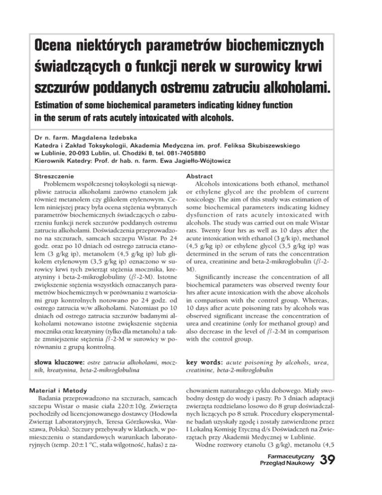 Ocena niektórych parametrów biochemicznych wiadcz¹cych o funkcji nerek w surowicy krwi szczurów poddanych ostremu zatruciu alkoholami. Nr 11-12/2007 Estimation of some biochemical parameters indicating kidney function in the serum of rats acutely intoxicated with alcohols. Dr n. farm. Magdalena Izdebska Katedra i Zak³ad Toksykologii, Akademia Medyczna im. prof. Feliksa Skubiszewskiego w Lublinie, 20-093 Lublin, ul. Chodki 8, tel. 081-7405880 Kierownik Katedry: Prof. dr hab. n. farm. Ewa Jagie³³o-Wójtowicz Streszczenie Problemem współczesnej toksykologii są niewątpliwie zatrucia alkoholami zarówno etanolem jak również metanolem czy glikolem etylenowym. Celem niniejszej pracy była ocena stężenia wybranych parametrów biochemicznych świadczących o zaburzeniu funkcji nerek szczurów poddanych ostremu zatruciu alkoholami. Doświadczenia przeprowadzono na szczurach, samcach szczepu Wistar. Po 24 godz. oraz po 10 dniach od ostrego zatrucia etanolem (3 g/kg ip), metanolem (4,5 g/kg ip) lub glikolem etylenowym (3,5 g/kg ip) oznaczono w surowicy krwi tych zwierząt stężenia mocznika, kreatyniny i beta-2-mikroglobuliny (>-2-M). Istotne zwiększenie stężenia wszystkich oznaczanych parametrów biochemicznych w porównaniu z wartościami grup kontrolnych notowano po 24 godz. od ostrego zatrucia w/w alkoholami. Natomiast po 10 dniach od ostrego zatrucia szczurów badanymi alkoholami notowano istotne zwiększenie stężenia mocznika oraz kreatyniny (tylko dla metanolu) a także zmniejszenie stężenia >-2-M w surowicy w porównaniu z grupą kontrolną. Abstract Alcohols intoxications both ethanol, methanol or ethylene glycol are the problem of current toxicology. The aim of this study was estimation of some biochemical parameters indicating kidney dysfunction of rats acutely intoxicated with alcohols. The study was carried out on male Wistar rats. Twenty four hrs as well as 10 days after the acute intoxication with ethanol (3 g/k ip), methanol (4,5 g/kg ip) or ethylene glycol (3,5 g/kg ip) was determined in the serum of rats the concentration of urea, creatinine and beta-2-mikroglobulin (>-2M). Significantly increase the concentration of all biochemical parameters was observed twenty four hrs after acute intoxication with the above alcohols in comparison with the control group. Whereas, 10 days after acute poisoning rats by alcohols was observed significant increase the concentration of urea and creatinine (only for methanol group) and also decrease in the level of >-2-M in comparison with the control group. słowa kluczowe: ostre zatrucia alkoholami, mocznik, kreatynina, beta-2-mikroglobulina key words: acute poisoning by alcohols, urea, creatinine, beta-2-mikroglobulin Materia³ i Metody Badania przeprowadzono na szczurach, samcach szczepu Wistar o masie ciała 220±10g. Zwierzęta pochodziły od licencjonowanego dostawcy (Hodowla Zwierząt Laboratoryjnych, Teresa Górzkowska, Warszawa, Polska). Szczury przebywały w klatkach, w pomieszczeniu o standardowych warunkach laboratoryjnych (temp. 20±1 oC, stała wilgotność, hałas) z za- chowaniem naturalnego cyklu dobowego. Miały swobodny dostęp do wody i paszy. Po 3 dniach adaptacji zwierzęta rozdzielano losowo do 8 grup doświadczalnych liczących po 8 sztuk. Procedury eksperymentalne badań uzyskały zgodę i zostały zatwierdzone przez I Lokalną Komisję Etyczną d/s Doświadczeń na Zwierzętach przy Akademii Medycznej w Lublinie. Wodne roztwory etanolu (3 g/kg), metanolu (4,5 Farmaceutyczny Przegl¹d Naukowy !' Ocena niektórych parametrów biochemicznych wiadcz¹cych o funkcji nerek w surowicy krwi ... g/kg) lub glikolu etylenowego (3,5 g/kg) przygotowywano ex tempore i podawano szczurom jednorazowo (1x), dootrzewnowo (ip), w stałej objętości 0,5 ml/100g m.c. Zwierzęta grup kontrolnych otrzymywały identyczne objętości rozpuszczalnika tj. 0,5 ml/ 100 g m.c. W przeprowadzonych doświadczeniach zwierzęta poszczególnych grup otrzymywały kolejno: I i V - wodę do iniekcji ip jednorazowo (1x) II i VI - etanol (3 g/kg) 1 x III i VII - metanol (4,5 g/kg) 1 x IV i VIII - glikol etylenowy (3,5 g/kg) 1 x W końcu doświadczeń zwierzęta dekapitowano i pobierano krew na skrzep, po 24 godz. od iniekcji (grupy I-IV) oraz po 10 dniach od iniekcji (grupy VVIII). Krew po wykrzepnięciu była wirowana przez 15 min. przy 3000 obr./min. Następnie pobierano surowicę do probówek polistyrenowych i przechowywano w temp. (-20 oC) do jednoczasowego oznaczania biochemicznego. W surowicy krwi oznaczano przy użyciu gotowych zestawów diagnostycznych stężenia: mocznika, kreatyniny (Cormay Diagnostic S.A., Lublin, Polska) oraz >-2-M (ELISA, IBL Immuno-Biological Laboratories, Hamburg, Niemcy). Analizę statystyczną uzyskanych wyników przeprowadzono używając testu t-Studenta przy poziomie istotności p<0,05. Wyniki Uzyskane w pracy wyniki badań przedstawiono w postaci rycin. Z ryciny 1 wynika, że zarówno po 24 godz. jak też po 10 dniach od ostrego zatrucia szczurów etanolem (3,0 g/kg ip), metanolem (4,5 g/kg ip) lub glikolem etylenowym (3,5 g/kg ip) dochodzi do istotnego zwiększenia stężenia mocznika w surowicy krwi w porównaniu z grupami kontrolnymi. Największe stężenie mocznika notowano po 24 godz. od ostrego zatrucia glikolem etylenowym (o około 300% w porównaniu z grupą kontrolną). Na podstawie uzyskanych w pracy wyników stwierdzono także istotny wzrost stężenia kreatyniny po 24 godz. od ostrego zatrucia szczurów w/w alkoholami. Natomiast po 10 dniach od ostrego zatrucia tylko metanolem odnotowano zwiększenie stężenia tego parametru biochemicznego w surowicy krwi tych zwierząt w porównaniu z grupą kontrolną (Rycina 2). Badania tej pracy wykazały również po 24 godz. od ostrego zatrucia szczurów stosowanymi w pracy alkoholami istotne zwiększenie stężenia >-2-M w surowicy krwi, natomiast po 10 dniach od zatrucia ob- " Farmaceutyczny Przegl¹d Naukowy Nr 11-12/2007 serwowano istotne zmniejszenie
