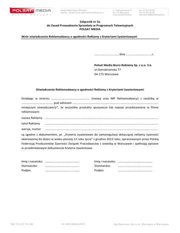 Załącznik nr 5a do Zasad Prowadzenia Sprzedaży w Programach Telewizyjnych POLSAT MEDIA Wzór oświadczenia Reklamodawcy o zgodności Reklamy z Kryteriami żywieniowymi ............................, dnia ...............................r. Polsat Media Biuro Reklamy Sp. z o.o. S.k. ul.Ostrobramska 77 04-175 Warszawa Oświadczenie Reklamodawcy o zgodności Reklamy z Kryteriami żywieniowymi Działając w imieniu ………………………………………….. (nazwa oraz NIP Reklamodawcy) z siedzibą w ………………………………….. pod adresem ……..……………………………………………………………………………..…………… niniejszym oświadczam/y*, że wszystkie produkty spożywcze lub napoje przedstawione w filmie reklamowym: nazwa Reklamy ....................................................................................................................................... tytuł Reklamy ....................................................................................................................................... wersja, numer ....................................................................................................................................... są zgodne z dokumentem, pt. „Kryteria żywieniowe do samoregulacji dotyczącej reklamy żywności skierowanej do dzieci w wieku poniżej 12 roku życia” z grudnia 2013 roku, opracowanym przez Polską Federację Producentów Żywności Związek Pracodawców z siedzibą w Warszawie i spełniają opisane w przedmiotowym dokumencie kryteria żywieniowe. Imię i nazwisko: ……………………………………… Stanowisko: ……………………………………… Podpis: ……………………………………… Imię i nazwisko: ……………………………………… Stanowisko: ……………………………………… Podpis: ……………………………………… Załącznik nr 5b do Zasad Prowadzenia Sprzedaży w Programach Telewizyjnych POLSAT MEDIA Wzór oświadczenia Reklamodawcy o zgodności Wskazania sponsorskiego z Kryteriami żywieniowymi ............................, dnia ...............................r. Polsat Media Biuro Reklamy Sp. z o.o. S.k. ul.Ostrobramska 77 04-175 Warszawa Oświadczenie Reklamodawcy o zgodności Wskazania sponsorskiego z Kryteriami żywieniowymi Działając w imieniu ………………………………………….. (nazwa oraz NIP Reklamodawcy) z siedzibą w ………………………………….. pod adresem ……..……………………………………………………………………………..…………… niniejszym oświadczam/y*, że wszystkie produkty spożywcze lub napoje przedstawione we Wskazaniu sponsorskim: nazwa Wskazania sponsorskiego ............................................................................................................. tytuł Wskazania sponosrskiego ............................................................................................................. wersja, numer ............................................................................................................. są zgodne z dokumentem, pt. „Kryteria żywieniowe do samoregulacji dotyczącej reklamy żywności skierowanej do dzieci w wieku poniżej 12 roku życia” z grudnia 2013 roku, opracowanym przez Polską Federację Producentów Żywności Związek Pracodawców z siedzibą w Warszawie i spełniają opisane w przedmiotowym dokumencie kryteria żywieniowe. Imię i nazwisko: ……………………………………… Stanowisko: ……………………………………… Podpis: ……………………………………… Imię i nazwisko: ……………………………………… Stanowisko: ……………………………………… Podpis: ………………………………………