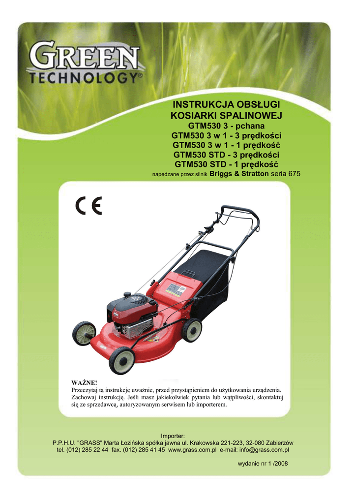 Instrukcja kosiarki GTM530 INSTRUKCJA OBSŁUGI KOSIARKI SPALINOWEJ GTM530 3 - pchana GTM530 3 w 1 - 3 prędkości GTM530 3 w 1 - 1 prędkość GTM530 STD - 3 prędkości GTM530 STD - 1 prędkość napędzane przez silnik Briggs & Stratton seria 675 WAŻNE! Przeczytaj tą instrukcję uważnie, przed przystąpieniem do użytkowania urządzenia. Zachowaj instrukcję. Jeśli masz jakiekolwiek pytania lub wątpliwości, skontaktuj się ze sprzedawcą, autoryzowanym serwisem lub importerem. Importer: P.P.H.U. "GRASS" Marta Łozińska spółka jawna ul. Krakowska 221-223, 32-080 Zabierzów tel. (012) 285 22 44 fax. (012) 285 41 45 www.grass.com.pl e-mail: [email protected] wydanie nr 1 /2008 Instrukcja kosiarki GTM530 SPIS TREŚCI ROZDZIAŁ 1: ZASADY BEZPIECZNEJ OBSŁUGI ...................….…………… ROZDZIAŁ 2: ODSZUKIWANIE NUMERU MODELU ………….……………….. ROZDZIAŁ 3: KONSULATACJE Z DOSTAWCĄ ……………….………………. ROZDZIAŁ 4: INSTRUKCJE ROZPAKOWYWANIA …………….……………… ROZDZIAŁ 5: INSTRUKCJE MONTAŻU ........ ……….......……….…………….. ROZDZIAŁ 6: ELEMENTY STEROWANIA ………………………………………. ROZDZIAŁ 7: OBSŁUGA …………………………………………………………… ROZDZIAŁ 8: REGULACJE ………………………………………………………… ROZDZIAŁ 9: OBSŁUGA KONSERWACYJNA ………………………………….. ROZDZIAŁ 10: SMAROWANIE …………………………………………………….. ROZDZIAŁ 11: PRZECHOWYWANIE PO SEZONIE ……………......………….. ROZDZIAŁ 12: WSKAZÓWKI USUWANIA NIESPRAWNOŚCI ……………….. ROZDZIAŁ 13: GWARANCJA ............................................................................ ROZDZIAŁ 14: POSTĘPOWANIE ZE ZUŻYTYMI MASZYNAMI, OCHRONA ŚRODOWISKA ........................................................ ROZDZIAŁ 15: WYKAZ PUNKTÓW SERWISOWYCH ....................................... ROZDZIAŁ 16: DANE TECHNICZNE ................................................................... 3 6 7 7 8 9 11 14 15 17 17 19 19 19 19 19 PRZEZNACZENIE KOSIARKI SPALINOWEJ Kosiarka spalinowa samobieżna GREEN TECHNOLOGY GTM530 z silnikiem Briggs&Stratton serii 675 przeznaczona jest do koszenia trawy w ogrodach przydomowych o powierzchni do 2000m2. Jakiekolwiek próby modyfikacji lub adaptacji do innych celów są rzeczą niebezpieczną i zabronioną. Wykorzystywanie sprzętu niezgodnie z przeznaczeniem jest zabronione i powoduje utratę gwarancji. UWAGA Ilustracje w niniejszej instrukcji obsługi mają charakter poglądowy i w niektórych szczegółach mogą różnić się od rzeczywistego wyglądu urządzeń. Instrukcja kosiarki GTM530 ROZDZIAŁ 1: ZASADY BEZPIECZNEJ OBSŁUGI – ZNACZENIE SYMBOLI OSTRZEŻENIE: TEN SYMBOL OZNACZA WAŻNE INSTRUKCJE DOTYCZĄCE BEZPIECZEŃSTWA, KTÓRE, JEŻELI NIE BĘDĄ PRZESTRZEGANE, MOGĄ ZAGRAŻAĆ BEZPIECZEŃSTWU OSÓB I/LUB MAJĄTKU TWOJEGO I INNYCH. PRZED PRZYSTĄPIENIEM DO OBSŁUGI KOSIARKI DO TRAWY PRZECZYTAĆ WSZYSTKIE INSTRUKCJE ZAWARTE W TYM PODRĘCZNIKU I PRZESTRZEGAĆ ICH. NIEPRZESTRZEGANIE TYCH INSTRUKCJI MOŻE SPOWODOWAĆ OBRAŻENIA OSÓB. POKAZANY OBOK SYMBOL OZNACZA OSTRZEŻENIE. NIEBEZPIECZEŃSTWO: Kosiarka do trawy została zbudowana do pracy zgodnie z zasadami bezpiecznej obsługi podanymi w tym podręczniku. Jak w każdym urządzeniu mechanicznym, brak zachowania ostrożności lub błąd ze strony operatora może spowodować poważne obrażenia. Ta kosiarka do trawy może amputować ręce i stopy i wyrzucać przedmioty. Nieprzestrzeganie poniższych instrukcji bezpieczeństwa może spowodować poważne obrażenia lub śmierć. UWAGI OGÓLNE O OBSŁUDZE • • • • • • • • Przed przystąpieniem do montażu tej maszyny przeczytać uważnie wszystkie wskazówki dla użytkownika. Przed obsługą przeczytać, zrozumieć i przestrzegać wszystkich instrukcji znajdujących się na maszynie i w niniejszej instrukcji obsługi. Przed obsługą maszyny zapoznać się dokładnie z elementami sterowania i prawidłowym jej użytkowaniem. Przechowywać ten podręcznik w bezpiecznym miejscu dla przyszłego i regularnego korzystania oraz dla zamawiania części zamiennych. Kosiarka rotacyjna jest precyzyjnym urządzeniem mechanicznym, a nie zabawką. W związku z tym zawsze należy zachowywać wyjątkową ostrożność. Ta kosiarka do trawy została zaprojektowana do wykonywania jednego zadania: do ścinania trawy. Nie używać jej do żadnego innego celu. Dzieciom poniżej wieku 16 lat nigdy nie pozwalać obsługiwać kosiarki. Dzieci od wieku 16 lat powinny obsługiwać kosiarkę tylko pod ścisłym nadzorem rodziców. Pozwalać używać tej kosiarki tylko osobom odpowiedzialnym, które znają zasady bezpiecznej obsługi. Żadne osoby, a zwłaszcza dzieci i zwierzęta domowe nie powinny znajdować się w obszarze pracy kosiarki. Gdy takie osoby znajdą się w pobliżu kosiarki, zatrzymać silnik, by uniemożliwić obrażenia przez kontakt z nożem lub przez wyrzucane przedmioty. Chociaż miejsce pracy powinno być całkowicie oczyszczone od obcych przedmiotów, taki przedmiot mógł być przeoczony i mógłby zostać przypadkowo wyrzucony przez kosiarkę w przypadkowym kierunku i spowodować poważne obrażenia operatora lub innych osób znajdujących się w pobliżu. Dokładnie sprawdzić miejsce, gdzie urządzenie ma być używane. Usunąć wszelkie kamienie, patyki, drut, kości, zabawki i inne przedmioty obce, które mogłyby być uniesione i wyrzucone przez kosiarkę w przypadkowym kierunku i spowodować poważne obrażenia operatora lub innych osób znajdujących się w pobliżu. Zaplanować przebieg koszenia w celu uniknięcia wyrzucania materiału na drogi, chodniki, osoby postronne i tym podobne. By uniknąć obrażeń przez wyrzucane przedmioty, dzieci, osoby postronne i pomocnicy powinni znajdować się przynajmniej 25 m od pracującej kosiarki. Podczas 