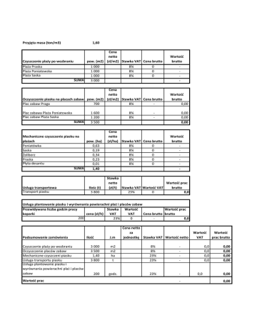 Przyjęta masa (ton/m3) 1,60 Cena netto Czyszczenie plaży po wezbraniu pow. (m2) (zł/m2) Stawka VAT Cena brutto Plaża Praska 1 000 8% 0 Plaża Poniatowska 1 000 8% 0 Plaża Saska 1 000 8% 0 SUMA 3 000 Wartość brutto - Cena netto Oczyszczenie piasku na placach zabaw pow. (m2) (zł/m2) Stawka VAT Cena brutto Plac zabaw Praga 700 8% - Wartość brutto 0,00 Plac zabawa Plaża Poniatowska Plac zabaw Plaża Saska SUMA 1 600 1 200 3 500 Mechaniczne czyszczenie piasku na plażach pow. (ha) Poniatówka 0,63 Saska 0,19 Żoliborz 0,34 Praska 0,23 Płyta desantu 0,01 SUMA 1,40 Usługa transportowa Transport piasku Ilośc (t) 3 800 8% 8% - Cena netto (zł/ha) Stawka VAT Cena brutto 8% 0 8% 0 8% 0 8% 0 8% 0 0,00 0,00 0,00 Wartość brutto - Stawka netto Wartość prac (zł/t) Stawka VAT Wartość VAT brutto 23% 0 0,0 Usługa plantowanie piasku i wyrównania powierachni plaż i placów zabaw Przewidywana liczba godzin pracy Stawka Wartość Wartość prac koparki cena (zł/h) VAT VAT Cena brutto brutto 200 23% 0 0,0 Podsumowanie zamówienia Czyszczenie plaży po wezbraniu Oczyszczenie placów zabaw Mechaniczne czyszczeni piasku Usługa transportu piasku Usługa plantowanie piasku i wyrównania powierachni plaż i placów zabaw Wartość prac Ilość 3 000 3 500 1,40 3 800 200 J.m Cena netto za jednostkę Stawka VAT Wartość netto m2 m2 ha t 8% 8% 23% 23% - godz. 23% - Wartość VAT 0,0 0,0 0,0 0,0 0,0 Wartość prac brutto 0,00 0,00 0,00 0,00 0,00 0,00
