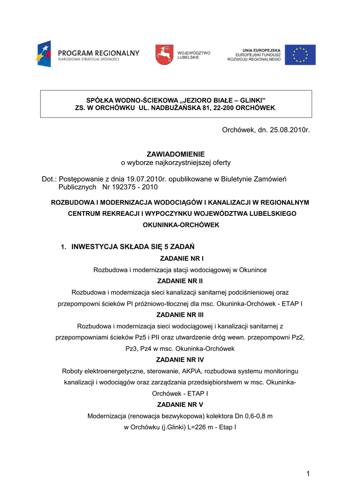 SPÓŁKA WODNO-ŚCIEKOWA „JEZIORO BIAŁE – GLINKI” ZS. W ORCHÓWKU UL. NADBUŻAŃSKA 81, 22-200 ORCHÓWEK. Orchówek, dn. 25.08.2010r. ZAWIADOMIENIE o wyborze najkorzystniejszej oferty Dot.: Postępowanie z dnia 19.07.2010r. opublikowane w Biuletynie Zamówień Publicznych Nr 192375 - 2010 ROZBUDOWA I MODERNIZACJA WODOCIĄGÓW I KANALIZACJI W REGIONALNYM CENTRUM REKREACJI I WYPOCZYNKU WOJEWÓDZTWA LUBELSKIEGO OKUNINKA-ORCHÓWEK 1. INWESTYCJA SKŁADA SIĘ 5 ZADAŃ ZADANIE NR I Rozbudowa i modernizacja stacji wodociągowej w Okunince ZADANIE NR II Rozbudowa i modernizacja sieci kanalizacji sanitarnej podciśnieniowej oraz przepompowni ścieków PI próżniowo-tłocznej dla msc. Okuninka-Orchówek - ETAP I ZADANIE NR III Rozbudowa i modernizacja sieci wodociągowej i kanalizacji sanitarnej z przepompowniami ścieków Pz5 i PII oraz utwardzenie dróg wewn. przepompowni Pz2, Pz3, Pz4 w msc. Okuninka-Orchówek ZADANIE NR IV Roboty elektroenergetyczne, sterowanie, AKPiA, rozbudowa systemu monitoringu kanalizacji i wodociągów oraz zarządzania przedsiębiorstwem w msc. OkuninkaOrchówek - ETAP I ZADANIE NR V Modernizacja (renowacja bezwykopowa) kolektora Dn 0,6-0,8 m w Orchówku (j.Glinki) L=226 m - Etap I 1 2. INFORMACJA O ZŁOŻONYCH OFERTACH Oferta Nr 1 - dotyczy Zadania V - złożył Wykonawca pod nazwą: INFRA S.A. z siedzibą ul. Skórzewska 35 Wysogotowo k. Poznania 62-081 Przeźmierowo; tel/faks 61 639 87 04 / 61 639 839 87 06 Oferta Nr 2 - dotyczy Zadania V - złożył Wykonawca pod nazwą: Per Arsleff Polska Sp. z o.o. z siedzibą 02-952 Warszawa, ul. Wiertnicza 131 tel/faks 022 651 69 72 Oferta Nr 3 - dotyczy Zadania II - złożył Wykonawca pod nazwą: Przedsiębiorstwo „TECHNOBUD” Sp. z o.o., ul. Ceramiczna 34D, 22-100 Chełm Oferta Nr 4 - dotyczy Zadania III - złożył Wykonawca pod nazwą: Zakład Remontowo-Budowlany Eugeniusz Pruszkowski, 22-200 Włodawa, ul. Jasna 18 3. INFORMACJA O OFERTACH ODRZUCONYCH W wyniku badania oferty nr 4 dotyczącej zadania nr III złożonej przez Wykonawcę pod nazwą: Zakład Remontowo-Budowlany Eugeniusz Pruszkowski, 22-200 Włodawa, ul. Jasna 18 stwierdzono, co następuje: a) w części dotyczącej Rozbudowy i modernizacji sieci kanalizacji sanitarnej w msc. Okuninka – Orchówek – Sieć wodociągowa Orchówek J.Glinki Przep. PII- Wykonawca wycenił na str. 54 w poz. 28 tj. Rury stalowe osłonowe czarne o śr. zewnętrznej i grub. Ścianek 159/5.6 mm - 5 m , zamiast wymaganej zgodnie z przedmiarem długości - 28 m, co jest niezgodne z treścią SIWZ; b) w części dotyczącej Rozbudowy i modernizacji sieci kanalizacji sanitarnej w msc. Okuninka – Orchówek – Kanalizacja grawitacyjna J. Glinki PII Wykonawca wycenił na str. 75 w poz. 9 tj. Mechaniczne karczowanie zagajników średnich od 31% do 60% powierzchni - 0.015 ha , zamiast wymaganej zgodnie z przedmiarem powierzchni - 0,02 ha , co jest niezgodne z treścią SIWZ; Działając na podstawie art. 89 ust. 1 pkt. 2) Prawa zamówień publicznych Zamawiający ODRZUCA ofertę nr 4 Wykonawcy pod nazwą, Zakład Remontowo-Budowlany Eugeniusz Pruszkowski, 22-200 Włodawa, ul. Jasna 18 z postępowania o udzielenie zamówienia z powodu znacznych niezgodności jej treści ze specyfikacją istotnych warunków zamówienia, a ich usunięcie stanowiłoby istotne zmiany w treści oferty. 4. INFORMACJA O WYBORZE NAJKORZYSTNIEJSZEJ OFERTY I PRZYZNANEJ PUNKTACJI Dla zadania nr II Za najkorzystniejszą ofertę uznano Ofertę Nr 3 - złożoną przez Wykonawcę pod nazwą: Przedsiębiorstwo „TECHNOBUD” Sp. z o.o., ul. Ceramiczna 34D, 22-100 Chełm – 100 pkt. Dla zadania nr III Oferta Nr 4 - Zakład Remontowo-Budowlany Eugeniusz Pruszkowski, 22-200 Włodawa, ul. Jasna 18 – OFERTA ODRZUCONA 2 Dla zadania nr V Za najkorzystniejszą ofertę uznano Ofertę Nr 1 - złożoną przez Wykonawcę pod nazwą: INFRA S.A. z siedzibą ul. Skórzewska 35, Wysogotowo k. Poznania, 62-081 Przeźmierowo – 100 pkt. Oferta Nr 2 - Per Arsleff Polska Sp. z o.o. z siedzibą 02-952 Warszawa, ul. Wiertnicza 131 – 89,79 pkt. Na zadanie nr I i nr IV ofert nie złożono 5. INFORMACJA O ŚRODKACH ODWOŁAWCZYCH 1. Wykonawcy przysługują środki ochrony prawnej określone w dział VI, rozdziały 1-4 (art. 179 – 198) ustawy Pzp. 2. Z uwagi na wartość zamówienia nie przekraczającą równowartości 4 845 000 euro odwołanie wnosi się w terminie określonym w art. 182 ustawy PZP. 3. Wniesienie odwołania jest dopuszczalne tylko przed zawarciem umowy. 4. Odwołanie przysługuje wyłącznie wobec czynności: a) wyboru trybu negocjacji bez ogłoszenia, zamówienia z wolnej ręki lub zapytania o cenę; b) opisu sposobu dokonywania oceny spełniania warunków udziału w postępowaniu; c) wykluczenia odwołującego z postępowania o udzielenie zamówienia; d) odrzucenia oferty odwołującego. 5. Odwołanie powinno wskazywać czynność lub zaniechanie czynności zamawiającego, której zarzuca się niezgodność z przepisami ustawy, zawierać zwięzłe przedstawienie zarzutów, określać żądanie oraz wskazywać okoliczności faktyczne i prawne uzasadniające wniesienie odwołania. 6. Odwołanie wnosi się do Prezesa Izby w formie pisemnej albo elektronicznej opatrzonej bezpiecznym podpisem elektronicznym weryfikowanym za pomocą ważnego kwalifikowanego certyfikatu. 7. Odwołujący przesyła kopię odwołania Zamawiającemu przed upływem terminu do wniesienia odwołania w taki sposób, aby mógł on zapoznać się z jego treścią przed upływem tego terminu. Domniemywa się, iż Zamawiający mógł zapoznać się z treścią odwołania przed upływem terminu do jego wniesienia, jeżeli przesłanie jego kopii nastąpiło przed upływem terminu do jego wniesienia za pomocą faksu. 3