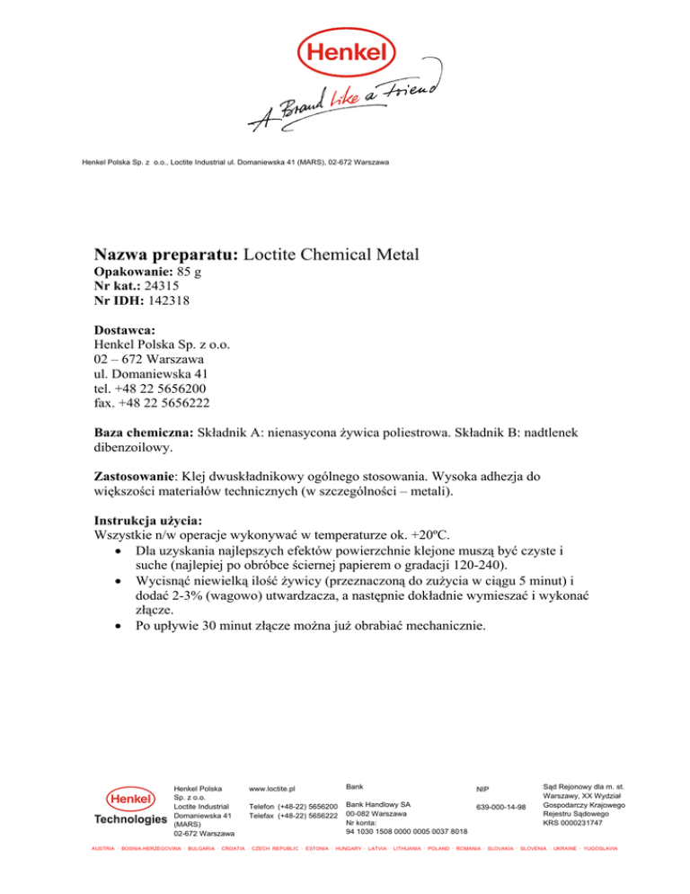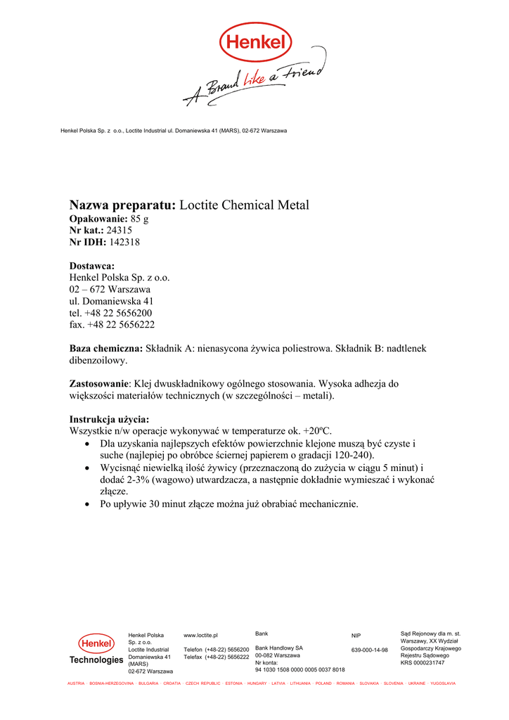 Henkel Polska Sp. z o.o., Loctite Industrial ul. Domaniewska 41 (MARS), 02-672 Warszawa Nazwa preparatu: Loctite Chemical Metal Opakowanie: 85 g Nr kat.: 24315 Nr IDH: 142318 Dostawca: Henkel Polska Sp. z o.o. 02 – 672 Warszawa ul. Domaniewska 41 tel. +48 22 5656200 fax. +48 22 5656222 Baza chemiczna: Składnik A: nienasycona żywica poliestrowa. Składnik B: nadtlenek dibenzoilowy. Zastosowanie: Klej dwuskładnikowy ogólnego stosowania. Wysoka adhezja do większości materiałów technicznych (w szczególności – metali). Instrukcja użycia: Wszystkie n/w operacje wykonywać w temperaturze ok. +20ºC. • Dla uzyskania najlepszych efektów powierzchnie klejone muszą być czyste i suche (najlepiej po obróbce ściernej papierem o gradacji 120-240). • Wycisnąć niewielką ilość żywicy (przeznaczoną do zużycia w ciągu 5 minut) i dodać 2-3% (wagowo) utwardzacza, a następnie dokładnie wymieszać i wykonać złącze. • Po upływie 30 minut złącze można już obrabiać mechanicznie. Henkel Polska Sp. z o.o. Loctite Industrial Domaniewska 41 (MARS) 02-672 Warszawa www.loctite.pl Bank NIP Telefon (+48-22) 5656200 Telefax (+48-22) 5656222 Bank Handlowy SA 00-082 Warszawa Nr konta: 94 1030 1508 0000 0005 0037 8018 639-000-14-98 Sąd Rejonowy dla m. st. Warszawy, XX Wydział Gospodarczy Krajowego Rejestru Sądowego KRS 0000231747 AUSTRIA · BOSNIA-HERZEGOVINA · BULGARIA · CROATIA · CZECH REPUBLIC · ESTONIA · HUNGARY · LATVIA · LITHUANIA · POLAND · ROMANIA · SLOVAKIA · SLOVENIA · UKRAINE · YUGOSLAVIA