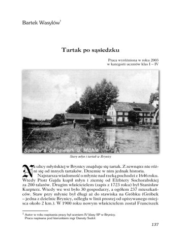 1 Bartek Wasylów Tartak po sąsiedzku Praca wyróżniona w roku 2003 w kategorii uczniów klas I – IV Stary młyn i tartak w Brynicy N a ulicy młyńskiej w Brynicy znajduje się tartak. Z zewnątrz nie różni się od innych tartaków. Drzemie w nim jednak historia. Najstarsza wiadomość o młynie nad rzeką pochodzi z 1646 roku. Wtedy Piotr Gajda kupił młyn i ziemię od Elżbiety Sochorabskiej za 200 talarów. Drugim właścicielem (zapis z 1723 roku) był Stanisław Kurpierz. Wtedy we wsi było 30 gospodarzy, a ogółem 237 mieszkańców. Staw przy młynie był długi aż do stawiska na Gróbku (Gróbek – jedna z dzielnic Brynicy, odległa w linii prostej od opisywanego miejsca około 2 km.). W 1900 roku nowym właścicielem został Franciszek 1 Autor w roku napisania pracy był uczniem IV klasy SP w Brynicy. Praca napisana pod kierunkiem mgr Danuty Sudoł. 137 Sochor wraz z żoną Marią Sochor. Młyn był napędzany wodą, która obracała koło młyńskie. W 1927 roku Franciszek Sochor kupił trak [maszynę do cięcia drzewa]. Żeby uruchomić trak trzeba było zastosować maszynę parową. Była ona opalana drewnem i trocinami. O godzinie 5 rano trzeba było wstać by ją uruchomić. Gotująca się woda zamieniła się w parę i napędzała trak. Ponieważ było to bardzo pracochłonne, to Franciszek Sochor w 1934 roku zamienił maszynę parową na silnik spalinowy. Silnik ten był wysokoprężny, zasilany olejem napędowym. W tym czasie wokół tartaku było centrum kulturalne. Odbywały się tu zabawy taneczne na wolnym powietrzu oraz okolicznościowe festyny. Orkiestra przygrywająca na zabawach i festynach składała się z pracowników tartaku. W 1938 roku założona była nowa instalacja elektryczna i silnik elektryczny. Ten silnik napędzał trak bez żadnego remontu do 2003 roku. Tartak nadal jest ten sam, pracuje w nim już trzecie pokolenie Sochorów. Proszę jednak pamiętać, że zostawiono go w 1927 roku. Przez cały ten czas w tartaku pracowało wielu ludzi, którym dawał on zatrudnienie oraz utrzymanie im i ich rodzinom. Mimo starej historii i starej maszyny tartak pracuje nowocześnie i stale się rozwija. W codziennej pracy ludziom pomagają maszyny takie jak suwnice i wózki widłowe. Tartak przeciera z roku na rok coraz więcej drewna. Trociny są wykorzystywane do ogrzewania budynków mieszkalnych i stolarni. 2 2 Informacji udzielił obecny właściciel - Józef Sochor, którego dziadek Franciszek założył ten tartak. 138 1 Renata Polak Wiannoł skrzinia I nagroda w roku 2006 Praca nadesłana na XIII konkurs „Ze Śląskiem na ty” Kategoria osób dorosłych M ani, wiynci 200 lołt tymu, w rodzinie krawca Kaspara W. z Ksiynżowsi (w 1935 roku przyłączonej do Leśnicy) urodziół se małi Matuszek. Czas lecioł, matczyne jodło mu służyło, Matuszek rosł na szykownego synka i wdycki mioł co do roboty. Nie rołz go matka Agata na wieczór musiała wołać: „A dyć pódź już do dóm, bo ćma se robi!”. Bardzo rołd kopoł i budowoł w piołsku, sfłóczół s pola kamiynie, kere w dóma ukłołdoł, a jak bielyli chlyw, abo chałupa wołpnem, to do miyszanioł i pyndzlowanioł bół piyrszi. Łojciec chnet wiedzioł: S tego synka bandzie dobri mulołrz. I tak se tysz stało. Jak se już dobrze we fachu wyuczół, to go robota gónióła. We wsi i bliskim miejście bogatsi zaczli stawiać chałupy s kamiynia i cegły, bo ty drewniane czanści gorały, a niekere s nich bóły jusz bardzo stare i zmurszałe. Nieskorzi Matusz zaczón se rozglóndać za jakómś gryfnóm dziołchóm. Matka mu niy łomiyszkali przikołzać: „Synek, ale tysz takom, coby dobrze umiała gospodarzyć!”. Na miyjscu szykownych dziołch bóło moc. S całyj łokolicy przichodziyły do farnygo kojścioła, do miasta na tołrg, do służby u gospodołrzów, do sklepów, na weselne muzyki! A łón zalecioł rołz do Łobrowca (Obrowca koło Gogolina) i tam znołd swoje przeznaczynie, kere se nazywało Marianna. W lutym 1873 roku, w Jesionie, bół jejich ślub. Dołwnij, we familiach w kerych boły dziołchy, łojcowie (rodzic) szykowali im ałsztojer (posag) na nowe gospodarstwo. Bez połra zim przed ślubym dziołchy szyły, sztikowały (haftowały), heklowały (na szydełku), sztrykowały (na drutach), wyszywały monogramem (inicjałami) roztomajte rzeczy. Potyn ranczniki, pojściel, deczki (obrusiki), łoblecze (odzież, bieliznę) ukłołdało se w drewnianym kufrze zwanym tysz „wiannóm skrzinióm” nie rołz tak wielkym, jak pół stoła. Fater zamołwioł tyn kufer u stolołrza i podług rubojści portmoneja (portfela) bół abo 1 mieszkanka Leśnicy. 139 kunsztownie pomalowani, abo blank ajnfachowi (skromny, prosty). Zima bóła mrojźnoł i śniyżnoł, a dróga z Łoleszki do Ksienżowsi dalekoł. Na szrómek (sanie na płozach) zaladowano do wiyrchu wiannoł skrzinia, keroł na miejscu chopy ledwo umieli sflyc. Mari (tak jóm wołali) se tak rubo łoblykła, iże nie zmarzła po dródze. Na gowie miała pliszowoł chustka s dugimi fryndzlami, zawiónzanoł pod brodóm. Srogoł i i ruboł wełnianoł chusta przikrywała jóm łod ramión aże na spodek. Coby se poły niy roschodziyły, przi karku spiynte były broszóm. Pod chustóm nojsiyła ciepłi kabołt i dugoł kecka, zakóńczónoł na dole pliszbortóm (pluszową tasiemką). Adamaszkowi fortuch (używany od święta) dopełnioł tyn prawie odświyntny nastrój. Na nogach miała ciepłe, wołniane czołrne pończochy, kere se kobiyty w każdo zima same robiły na jegliczkach (drutach). Nowe, wysokie, skórzane trzewiki ino tak zgrzipiały po śniegu! Po dródze rozwiónzały se sznurMarianna W. fot. ok. roku 1914 ki z jednego szczewika i Mari przi w chodzyniu do siyni nadepła jy drugóm nogóm. Keby niy Matusz, kery jóm prandko chyciół, bółoby widać na ziymi jakoł dugoł łóna richtig je. Ze śmiychym wszyscy uznali, iże modym to dobrze wróży. We skrzyni nie brachowało: - peklówek - 