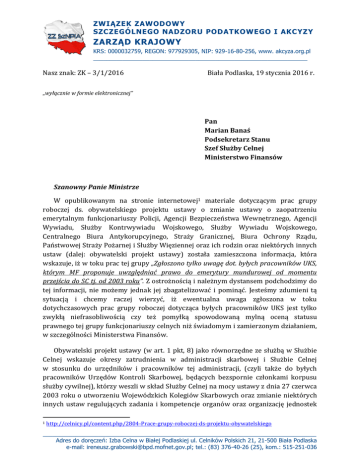ZWIĄZEK ZAWODOWY SZCZEGÓLNEGO NADZORU PODATKOWEGO I AKCYZY ZARZĄD KRAJOWY KRS: 0000032759, REGON: 977929305, NIP: 929-16-80-256, www. akcyza.org.pl _________________________________________________________________ Nasz znak: ZK – 3/1/2016 Biała Podlaska, 19 stycznia 2016 r. „wyłącznie w formie elektronicznej” Pan Marian Banaś Podsekretarz Stanu Szef Służby Celnej Ministerstwo Finansów Szanowny Panie Ministrze W opublikowanym na stronie internetowej1 materiale dotyczącym prac grupy roboczej ds. obywatelskiego projektu ustawy o zmianie ustawy o zaopatrzeniu emerytalnym funkcjonariuszy Policji, Agencji Bezpieczeństwa Wewnętrznego, Agencji Wywiadu, Służby Kontrwywiadu Wojskowego, Służby Wywiadu Wojskowego, Centralnego Biura Antykorupcyjnego, Straży Granicznej, Biura Ochrony Rządu, Państwowej Straży Pożarnej i Służby Więziennej oraz ich rodzin oraz niektórych innych ustaw (dalej: obywatelski projekt ustawy) została zamieszczona informacja, która wskazuje, iż w toku prac tej grupy „Zgłoszono tylko uwagę dot. byłych pracowników UKS, którym MF proponuje uwzględniać prawo do emerytury mundurowej od momentu przejścia do SC tj. od 2003 roku”. Z ostrożnością i należnym dystansem podchodzimy do tej informacji, nie możemy jednak jej zbagatelizować i pominąć. Jesteśmy zdumieni tą sytuacją i chcemy raczej wierzyć, iż ewentualna uwaga zgłoszona w toku dotychczasowych prac grupy roboczej dotycząca byłych pracowników UKS jest tylko zwykłą niefrasobliwością czy też pomyłką spowodowaną mylną oceną statusu prawnego tej grupy funkcjonariuszy celnych niż świadomym i zamierzonym działaniem, w szczególności Ministerstwa Finansów. Obywatelski projekt ustawy (w art. 1 pkt, 8) jako równorzędne ze służbą w Służbie Celnej wskazuje okresy zatrudnienia w administracji skarbowej i Służbie Celnej w stosunku do urzędników i pracowników tej administracji, (czyli także do byłych pracowników Urzędów Kontroli Skarbowej, będących bezspornie członkami korpusu służby cywilnej), którzy weszli w skład Służby Celnej na mocy ustawy z dnia 27 czerwca 2003 roku o utworzeniu Wojewódzkich Kolegiów Skarbowych oraz zmianie niektórych innych ustaw regulujących zadania i kompetencje organów oraz organizację jednostek 1 http://celnicy.pl/content.php/2804-Prace-grupy-roboczej-ds-projektu-obywatelskiego ___________________________________________________________________________________ Adres do doręczeń: Izba Celna w Białej Podlaskiej ul. Celników Polskich 21, 21-500 Biała Podlaska e-mail: [email protected]; tel.: (83) 376-40-26 (25), kom.: 515-251-036 organizacyjnych podległych ministrowi właściwemu do spraw finansów publicznych (Dz.U. Nr 137 poz. 1302), a następnie zostali funkcjonariuszami Służby Celnej. Zapis ten nie został sformułowany „na wyrost”, nie stanowi też żadnej „gratyfikacji” czy „ukłonu” w stosunku do tej grupy funkcjonariuszy. Nie zgadzamy się, aby był tak postrzegany. Zapis ten wynika tylko i wyłącznie z prostego obowiązku szanowania prawa i jest bezsprzecznym dowodem jego przestrzegania. Starając się skrótowo wykazać „niefrasobliwość” potencjalnej uwagi o prawach byłych pracowników UKS do ewentualnej emerytury mundurowej pragnę zaznaczyć, iż przytoczona powyżej ustawa z 27 czerwca 2003 roku „o utworzeniu Wojewódzkich Kolegiów Skarbowych……” na mocy, której nastąpiło przeniesienie pracowników UKS do Izb i Urzędów Celnych wprowadziła jednocześnie istotne zmiany w ustawie z dnia 24 lipca 1999 r. „o Służbie Celnej” (Dz.U. Nr 72, poz. 802 ze zm.) dokładnie regulujące kwestie zaliczenia stażu pracy w służbie cywilnej do okresu służby w Służbie Celnej, gdzie w art. 22b ust 8 czytamy „Członkowi korpusu służby cywilnej, który na podstawie ust. 1 stał się funkcjonariuszem celnym, okres stażu pracy w służbie cywilnej lub jednostkach organizacyjnych administracji celnej wlicza się do okresu służby w Służbie Celnej”. Należy dodać koniecznie, iż w obowiązującej obecnie ustawie z dnia 27 sierpnia 2009 roku „o Służbie Celnej” (Dz. U. 2013 r. poz. 1404 ze zm.) także znajdujemy stosowną regulację. Art. 99 ust. 8 stanowi, bowiem: „Członkowi korpusu służby cywilnej, który stał się funkcjonariuszem, okres stażu pracy w służbie cywilnej lub jednostkach organizacyjnych wlicza się do okresu służby w Służbie Celnej”. W świetle przytoczonych uregulowań prawnych za sprzeczne z prawem w naszym przekonaniu należy uznać wszelkie ewentualne działania zmierzające do pozbawienie byłych pracowników Urzędów Kontroli Skarbowej praw nabytych w zakresie uznania wszystkich okresów zatrudnienia w służbie cywilnej do okresu służby w Służbie Celnej. Ponadto, nie uwzględnienie byłym pracownikom UKS w prawie do emerytury mundurowej pełnego okresu zatrudnienia w służbie cywilnej a jedynie okresu od 2003 roku rodzi automatyczne wątpliwości, co do równego traktowania wszystkich funkcjonariuszy i naraża Służbę Celną na zarzut dyskryminowania. Potencjana propozycja uznania prawa byłych pracowników UKS do emerytury mundurowej od roku 2003 wydaje się tak nieracjonalna i zastanawiająca, że może być odbierana nawet jako rozmyślne dążenie do dyskredytacji słuszności proponowanych w projekcie obywatelskim propozycji uznania byłym pracownikom UKS pełnego okresu zatrudnienia w służbie cywilnej, zwłaszcza, że do tej pory nikt nie kwestionował przytoczonych zapisów ustawowych, które w naszym przekonaniu są wyjątkowo transparentne i jednoznaczne. Szanowny Panie Ministrze Wierzymy, że nasze uwagi okażą się niezwykle przydatne i zgodzi się Pan Minister z naszym uzasadnieniem. Oczekujemy jednocześnie, iż powyższe stanowisko zostanie bezzwłocznie przedłożone grupie roboczej z Pana aprobatą i wsparciem. 2/3 Oświadczamy także, iż jesteśmy gotowi w każdym momencie przedstawić Panu M