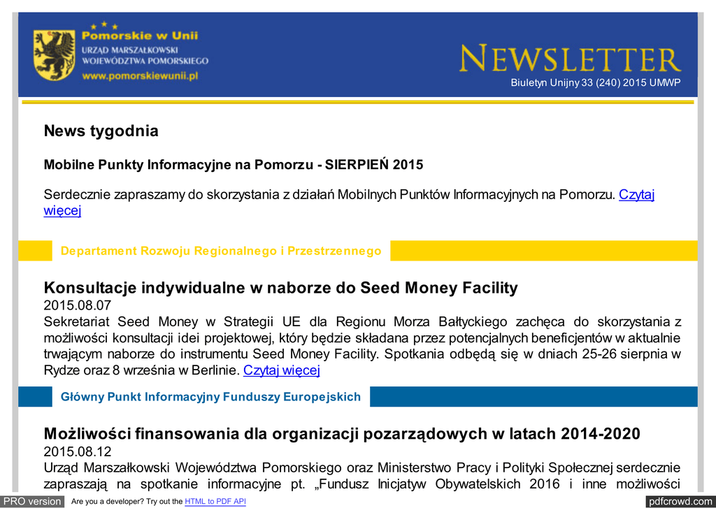 Biuletyn Unijny 33 (240) 2015 UMWP News tygodnia Mobilne Punkty Informacyjne na Pomorzu - SIERPIEŃ 2015 Serdecznie zapraszamy do skorzystania z działań Mobilnych Punktów Informacyjnych na Pomorzu. Czytaj więcej Departament Rozwoju Regionalnego i Przestrzennego Konsultacje indywidualne w naborze do Seed Money Facility 2015.08.07 Sekretariat Seed Money w Strategii UE dla Regionu Morza Bałtyckiego zachęca do skorzystania z możliwości konsultacji idei projektowej, który będzie składana przez potencjalnych beneficjentów w aktualnie trwającym naborze do instrumentu Seed Money Facility. Spotkania odbędą się w dniach 25-26 sierpnia w Rydze oraz 8 września w Berlinie. Czytaj więcej Główny Punkt Informacyjny Funduszy Europejskich Możliwości finansowania dla organizacji pozarządowych w latach 2014-2020 2015.08.12 Urząd Marszałkowski Województwa Pomorskiego oraz Ministerstwo Pracy i Polityki Społecznej serdecznie zapraszają na spotkanie informacyjne pt. „Fundusz Inicjatyw Obywatelskich 2016 i inne możliwości PRO version Are you a developer? Try out the HTML to PDF API pdfcrowd.com finansowania dla organizacji pozarządowych na lata 2014-2020". Czytaj więcej Mobilne Punkty Informacyjne na Pomorzu - SIERPIEŃ 2015 2015.08.12 Serdecznie zapraszamy do skorzystania z działań Mobilnych Punktów Informacyjnych na Pomorzu. Czytaj więcej Spotkanie informacyjne w Gdańsku: „Kwalifikowalność wydatków w ramach EFRR i EFS, ze szczególnym uwzględnieniem RPO WP 2014-2020” 2015.08.12 Główny Punkt Informacyjny Funduszy Europejskich Departamentu Programów Regionalnych Urzędu Marszałkowskiego Województwa Pomorskiego zaprasza na spotkanie informacyjne poświęcone zagadnieniom kwalifikowalności wydatków. Tematyka spotkania zostanie omówiona ze szczególnym uwzględnieniem Regionalnego Programu Operacyjnego Województwa Pomorskiego na lata 2014-2020. Czytaj więcej Spotkanie informacyjne w Sztumie: „Fundusze Europejskie na lata 2014-2020 dla jednostek samorządu terytorialnego” 2015.08.12 Lokalny Punkt Informacyjny Funduszy Europejskich w Malborku zaprasza na spotkanie informacyjne poświęcone wsparciu jednostek samorządu terytorialnego z Funduszy Europejskich na lata 2014-2020. Czytaj więcej Spotkania informacyjne: „Finansowanie działalności gospodarczej z dotacji unijnych oraz zwrotnych instrumentów finansowych” 2015.08.12 Punkty Informacyjne Funduszy Europejskich w województwie pomorskim zapraszają na spotkania informacyjne poświęcone zagadnieniom związanym ze wsparciem działalności gospodarczej. Czytaj więcej Dotacje dla samorządów na projekty z zakresu działań energooszczędnych i OZE PRO version Are you a developer? Try out the HTML to PDF API pdfcrowd.com 2015.08.12 Narodowy Fundusz Ochrony Środowiska i Gospodarki Wodnej uruchamia nowe nabory wniosków m.in. dla samorządów na dofinansowanie projektów energooszczędnych i na rzecz OZE. Czytaj więcej Wykorzystaj Bon na innowacje! 2015.08.12 Od 31 sierpnia 2015 r. do 30 grudnia 2015 r. można składać wnioski w ramach programu Bon na Innowacje, którego organizatorem jest Polska Agencja Rozwoju Przedsiębiorczości. Celem programu jest zainicjowanie kontaktów mikro lub małych przedsiębiorców z jednostkami naukowymi. W ramach programu przedsiębiorcy mogą uzyskać do 15 000 zł na zakup usługi od jednostek naukowych. Czytaj więcej Wsparcie inwestycji w infrastrukturę B+R przedsiębiorstw 2015.08.12 Od 1 września 2015 r. do 30 października 2015 r. będzie trwał nabór wniosków w ramach Programu Operacyjnego Inteligentny Rozwój Działanie 2.1 Wsparcie inwestycji w infrastrukturę B+R przedsiębiorstw. Budżet działania wynosi 2,3 mld zł. W aktualnym naborze na finansowanie projektów przeznaczono 460 mln zł. Czytaj więcej Dotacje na rozwój infrastruktury badawczej sektora nauki 2015.08.12 Ośrodek Przetwarzania Informacji ogłosił nabór wniosków o dofinansowanie projektów w ramach Programu Operacyjnego Inteligentny Rozwój 2014-2020, działanie 4.2: Rozwój nowoczesnej infrastruktury badawczej sektora nauki. Nabór potrwa od 1 października 2015 r. do 31 marca 2016 r. Czytaj więcej Dotacje na innowacje w medycynie 2015.08.12 Narodowe Centrum Badań i Rozwoju ogłasza nabór wniosków na dofinansowanie projektów dla Programu sektorowego „INNOMED – Program badań naukowych i prac rozwojowych dla sektora gospodarki w obszarze medycyny innowacyjnej”, finansowanego ze środków w ramach Działania 1.2 „Sektorowe programy B+R” Programu Inteligentny Rozwój. Wsparcie w ramach konkursu udzielane jest na realizację projektów, które obejmują badania przemysłowe i prace rozwojowe albo prace rozwojowe. Czytaj więcej PRO version Are you a developer? Try out the HTML to PDF API pdfcrowd.com Dotacje na wdrożenie innowacji 2015.08.12 Polska Agencja Rozwoju Przedsiębiorczości ogłasza konkurs na dofinansowanie projektów w ramach Działania 3.2 „Wsparcie wdrożeń wyników prac B+R” Poddziałania 3.2.1 Badania na rynek Programu Operacyjnego Inteligentny Rozwój. Dofinansowanie przeznaczone jest na realizację projektów dotyczących wdrożenia wyników prac badawczo-rozwojowych przeprowadzonych przez wnioskodawcę samodzielnie lub na jego zlecenie, prowadzących do wprowadzenia na rynek nowych bądź znacząco ulepszonych produktów (wyrobów lub usług). Nabór potrwa od 31.08.2015 r. do 30.09.2015 r. Czytaj więcej Dotacje dla przedsiębiorców na realizacje badań przemysłowych i prac rozwojowych 2015.08.12 Trwa nabór wniosków na dofinansowanie projektów w ramach Działania 1.1 „Projekty B+R przedsiębiorstw”, Poddziałanie 1.1.1 „Badania przemysłowe i prace rozwojowe realizowane przez przedsiębiorstwa” Programu Inteligentny Rozwój. Nabór trwa do 31.12.2015 r. Czytaj więcej Departament Europejskiego Funduszu Społecznego Pytania i odpowiedzi do konkursu z Poddziałania 6.1.2 RPO WP 2015.08.13 Informujemy, że na bieżąco są publikow