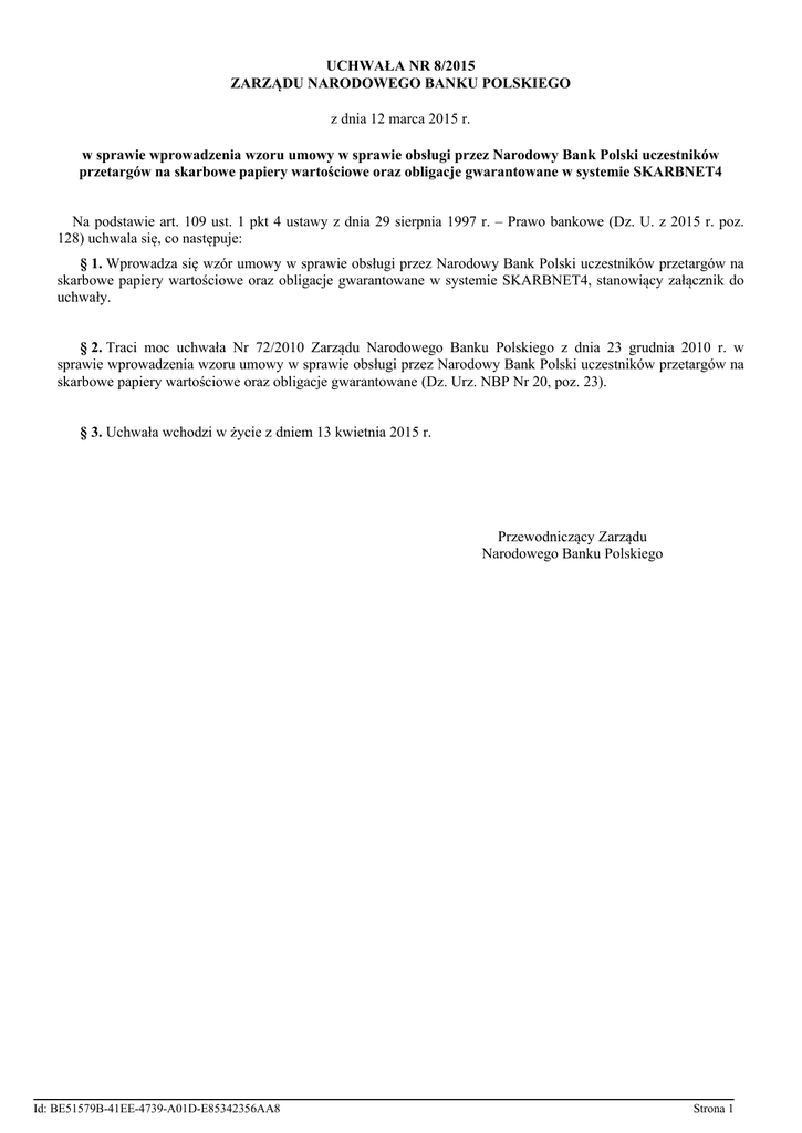 UCHWAŁA NR 8/2015 ZARZĄDU NARODOWEGO BANKU POLSKIEGO z dnia 12 marca 2015 r. w sprawie wprowadzenia wzoru umowy w sprawie obsługi przez Narodowy Bank Polski uczestników przetargów na skarbowe papiery wartościowe oraz obligacje gwarantowane w systemie SKARBNET4 Na podstawie art. 109 ust. 1 pkt 4 ustawy z dnia 29 sierpnia 1997 r. – Prawo bankowe (Dz. U. z 2015 r. poz. 128) uchwala się, co następuje: § 1. Wprowadza się wzór umowy w sprawie obsługi przez Narodowy Bank Polski uczestników przetargów na skarbowe papiery wartościowe oraz obligacje gwarantowane w systemie SKARBNET4, stanowiący załącznik do uchwały. § 2. Traci moc uchwała Nr 72/2010 Zarządu Narodowego Banku Polskiego z dnia 23 grudnia 2010 r. w sprawie wprowadzenia wzoru umowy w sprawie obsługi przez Narodowy Bank Polski uczestników przetargów na skarbowe papiery wartościowe oraz obligacje gwarantowane (Dz. Urz. NBP Nr 20, poz. 23). § 3. Uchwała wchodzi w życie z dniem 13 kwietnia 2015 r. Przewodniczący Zarządu Narodowego Banku Polskiego Id: BE51579B-41EE-4739-A01D-E85342356AA8 Strona 1 Załącznik do uchwały nr 8/2015 Zarządu Narodowego Banku Polskiego z dnia 12 marca 2015 r. UMOWA W SPRAWIE OBSŁUGI PRZEZ NARODOWY BANK POLSKI UCZESTNIKÓW PRZETARGÓW NA SKARBOWE PAPIERY WARTOŚCIOWE ORAZ OBLIGACJE GWARANTOWANE W SYSTEMIE SKARBNET4 zawarta w dniu............................... w Warszawie pomiędzy Narodowym Bankiem Polskim, zwanym dalej „NBP”, reprezentowanym przez: 1) ........................................................................................................................................., (imię i nazwisko oraz tytuł reprezentacji) 2) ........................................................................................................................................., (imię i nazwisko oraz tytuł reprezentacji) a .................................................................................................................................................... (nazwa uczestnika przetargów na skarbowe papiery wartościowe oraz obligacje gwarantowane), z siedzibą w ................................................................................................................................., (dokładny adres) zwanym dalej „uczestnikiem przetargów”, reprezentowanym przez: 1) ........................................................................................................................................., (imię i nazwisko oraz tytuł reprezentacji) 2) ........................................................................................................................................., (imię i nazwisko oraz tytuł reprezentacji) zwanymi dalej „stronami”, zwana dalej „Umową”. Strony ustalają, co następuje: § 1. Użyte w Umowie wyrażenia oznaczają: 1) DOK – Departament Operacji Krajowych w Centrali NBP; 2) PW – skarbowe papiery wartościowe oraz obligacje gwarantowane emitowane przez Bank Gospodarstwa Krajowego na rzecz Krajowego Funduszu Drogowego, poręczone lub gwarantowane przez Skarb Państwa; Id: BE51579B-41EE-4739-A01D-E85342356AA8 Strona 1 3) system SKARBNET4 – działający w DOK system rejestracji bonów skarbowych i bonów pieniężnych NBP, w którym prowadzone są przez NBP rachunki i konta depozytowe tych bonów; w systemie realizowana jest także obsługa przez NBP uczestników przetargów na PW; 4) uczestnik systemu SKARBNET4 – podmiot, dla którego NBP prowadzi rachunek i konto depozytowe bonów skarbowych i bonów pieniężnych NBP w systemie SKARBNET4; 5) KDPW – Krajowy Depozyt Papierów Wartościowych S.A.; 6) bezpieczne połączenie – dwustronnie uwierzytelnione, poufne i integralne połączenie nawiązywane między usługą na serwerach NBP a przeglądarką internetową na stacji uczestnika przetargów podłączonej do sieci Internet; 7) pakiet kryptograficzny – certyfikat i klucz kryptograficzny niezbędny do nawiązania bezpiecznego połączenia z NBP poprzez przeglądarkę internetową; 8) rachunek bankowy – rachunek w złotych prowadzony w NBP dla banków w systemie SORBNET2; 9) akcja w systemie SKARBNET4 – dokonanie czynności logicznej wynikającej z funkcjonalności tego systemu, którego interfejs udostępniony jest uczestnikowi przetargów; 10) uczestnik rozliczający: a) transakcje na bonach skarbowych – bank będący uczestnikiem systemu SKARBNET4, którego konto depozytowe bonów skarbowych jest obciążane i uznawane w związku z transakcjami na wszystkich rodzajach przetargów na bony skarbowe, zawartymi przez uczestnika przetargów niebędącego uczestnikiem systemu SKARBNET4 oraz dokonywane jest z tego tytułu obciążanie lub uznawanie jego rachunku bankowego, b) transakcje na obligacjach – uczestnik KDPW będący posiadaczem konta depozytowego lub rachunku papierów wartościowych prowadzonego w KDPW, które to konto lub rachunek jest uznawane lub obciążane w związku z transakcjami na wszystkich rodzajach przetargów na obligacje skarbowe oraz obligacje gwarantowane, zawartymi przez uczestnika przetargów niebędącego uczestnikiem KDPW. § 2. 1. NBP zobowiązuje się do prowadzenia obsługi uczestnika przetargów w zakresie dotyczącym jego uczestnictwa w przetargach na PW organizowanych przez NBP. 2. System SKARBNET4 dostępny jest dla uczestnika przetargów poprzez przeglądarkę internetową. Przeglądarki zalecane przez NBP: Internet Explorer od wersji 8.0 oraz Firefox od wersji 18.0. W celu zapewnienia bezpieczeństwa zaleca się stosowanie najnowszych wersji ww. przeglądarek internetowych. § 3. 1. Szczegółowe warunki dotyczące przetargów sprzedaży, przetargów uzupełniających i przetargów odkupu bonów skarbowych określają przepisy o warunkach emitowania bonów skarbowych. 2. Szczegółowe warunki dotyczące przetargów sprzedaży, przetargów uzupełniających, przetargów odkupu i przetargów zamiany obligacji skarbowych określają przepisy o warunkach emito