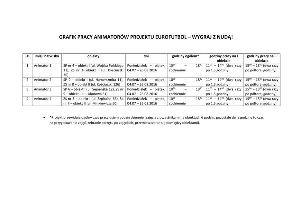 GRAFIK PRACY ANIMATORÓW PROJEKTU EUROFUTBOL – WYGRAJ Z NUDĄ! L.P. Imię i nazwisko 1 Animator 1 2 Animator 2 3 Animator 3 4 Animator 4 obiekty SP nr 4 – obiekt I (ul. Wojska Polskiego 13), ZS nr 2- obiekt II (ul. Kościuszki 36) SP 9 – obiekt I (ul. Hamerszmita 11), ZS nr 8 – obiekt II (ul. Kościuszki 126) SP 6 – obiekt I (ul. Sejneńska 12), ZS nr 9 – obiekt II (ul. Klonowa 51) ZS nr 3 – obiekt I (ul. Szpitalna 66), Sp nr 7 – obiekt II (ul. Minkiewicza 50) dni godziny ogółem* Poniedziałek – piątek, 1030 – 04.07 – 26.08.2016 codziennie Poniedziałek – piątek, 04.07 – 26.08.2016 Poniedziałek – piątek, 04.07 – 26.08.2016 Poniedziałek – piątek, 04.07 – 26.08.2016 1030 – codziennie 1030 – codziennie 1030 – codziennie 1830 godziny pracy na I godziny pracy na II obiekcie obiekcie 00 00 00 11 – 14 (dwa razy 15 – 1800 (dwa razy po 1,5 godziny) po półtorej godziny) 1830 1100 – 1400 (dwa razy 1500 – 1800 (dwa razy po 1,5 godziny) po półtorej godziny) 30 00 00 18 11 – 14 (dwa razy 1500 – 1800 (dwa razy po 1,5 godziny) po półtorej godziny) 1830 1100 – 1400 (dwa razy 1500 – 1800 (dwa razy po 1,5 godziny) po półtorej godziny) *Projekt przewiduje ogólny czas pracy osiem godzin dziennie (zajęcia z uczestnikami na obiektach 6 godzin, pozostałe dwie godziny to czas na przygotowanie zajęć, zebranie sprzętu po zajęciach, przemieszczanie się pomiędzy obiektami).