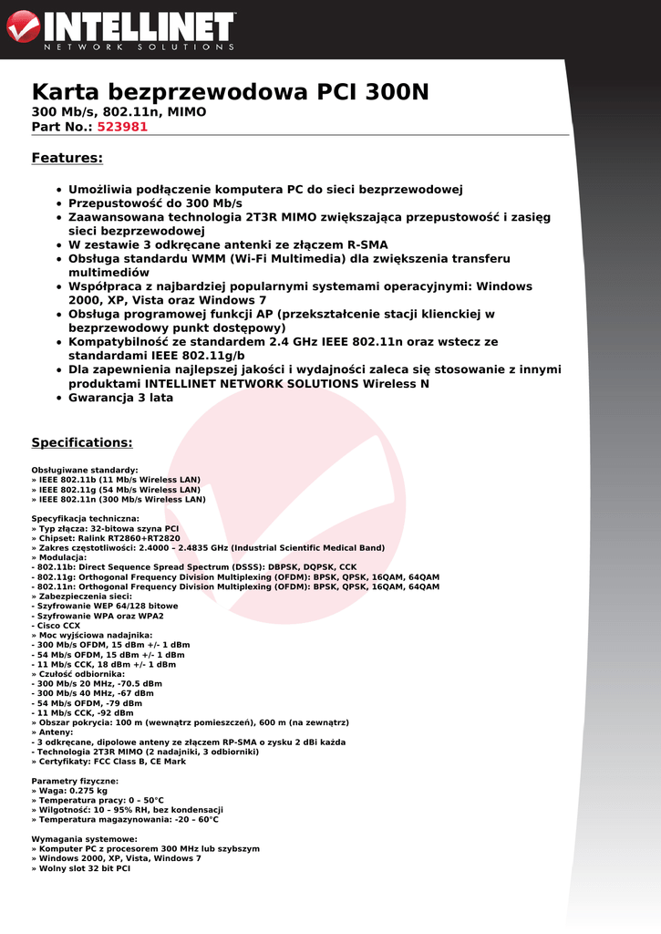 Karta bezprzewodowa PCI 300N 300 Mb/s, 802.11n, MIMO Part No.: 523981 Features: Umożliwia podłączenie komputera PC do sieci bezprzewodowej Przepustowość do 300 Mb/s Zaawansowana technologia 2T3R MIMO zwiększająca przepustowość i zasięg sieci bezprzewodowej W zestawie 3 odkręcane antenki ze złączem R-SMA Obsługa standardu WMM (Wi-Fi Multimedia) dla zwiększenia transferu multimediów Współpraca z najbardziej popularnymi systemami operacyjnymi: Windows 2000, XP, Vista oraz Windows 7 Obsługa programowej funkcji AP (przekształcenie stacji klienckiej w bezprzewodowy punkt dostępowy) Kompatybilność ze standardem 2.4 GHz IEEE 802.11n oraz wstecz ze standardami IEEE 802.11g/b Dla zapewnienia najlepszej jakości i wydajności zaleca się stosowanie z innymi produktami INTELLINET NETWORK SOLUTIONS Wireless N Gwarancja 3 lata Specifications: Obsługiwane standardy: » IEEE 802.11b (11 Mb/s Wireless LAN) » IEEE 802.11g (54 Mb/s Wireless LAN) » IEEE 802.11n (300 Mb/s Wireless LAN) Specyfikacja techniczna: » Typ złącza: 32-bitowa szyna PCI » Chipset: Ralink RT2860+RT2820 » Zakres częstotliwości: 2.4000 – 2.4835 GHz (Industrial Scientific Medical Band) » Modulacja: - 802.11b: Direct Sequence Spread Spectrum (DSSS): DBPSK, DQPSK, CCK - 802.11g: Orthogonal Frequency Division Multiplexing (OFDM): BPSK, QPSK, 16QAM, 64QAM - 802.11n: Orthogonal Frequency Division Multiplexing (OFDM): BPSK, QPSK, 16QAM, 64QAM » Zabezpieczenia sieci: - Szyfrowanie WEP 64/128 bitowe - Szyfrowanie WPA oraz WPA2 - Cisco CCX » Moc wyjściowa nadajnika: - 300 Mb/s OFDM, 15 dBm +/- 1 dBm - 54 Mb/s OFDM, 15 dBm +/- 1 dBm - 11 Mb/s CCK, 18 dBm +/- 1 dBm » Czułość odbiornika: - 300 Mb/s 20 MHz, -70.5 dBm - 300 Mb/s 40 MHz, -67 dBm - 54 Mb/s OFDM, -79 dBm - 11 Mb/s CCK, -92 dBm » Obszar pokrycia: 100 m (wewnątrz pomieszczeń), 600 m (na zewnątrz) » Anteny: - 3 odkręcane, dipolowe anteny ze złączem RP-SMA o zysku 2 dBi każda - Technologia 2T3R MIMO (2 nadajniki, 3 odbiorniki) » Certyfikaty: FCC Class B, CE Mark Parametry fizyczne: » Waga: 0.275 kg » Temperatura pracy: 0 – 50°C » Wilgotność: 10 – 95% RH, bez kondensacji » Temperatura magazynowania: -20 – 60°C Wymagania systemowe: » Komputer PC z procesorem 300 MHz lub szybszym » Windows 2000, XP, Vista, Windows 7 » Wolny slot 32 bit PCI Zawartość opakowania: » Karta bezprzewodowa PCI 300N » 3 antenki » Płyta CD ze sterownikiem oraz instrukcją użytkownika