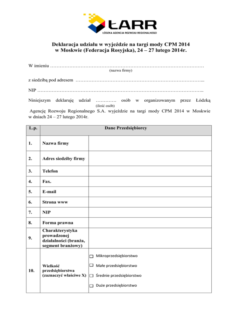 Deklaracja udziału w wyjeździe na targi mody CPM 2014 w Moskwie (Federacja Rosyjska), 24 – 27 lutego 2014r. W imieniu …………………………………………………………………………………… (nazwa firmy) z siedzibą pod adresem ……………………………………………………………………... NIP ………………………………………………………………………………………….. Niniejszym deklaruję udział …………. osób w organizowanym przez Łódzką (ilość osób) Agencję Rozwoju Regionalnego S.A. wyjeździe na targi mody CPM 2014 w Moskwie w dniach 24 – 27 lutego 2014r. Dane Przedsiębiorcy L.p. 1. Nazwa firmy 2. Adres siedziby firmy 3. Telefon 4. Fax. 5. E-mail 6. Strona www 7. NIP 8. Forma prawna 9. Charakterystyka prowadzonej działalności (branża, segment branżowy) Mikroprzedsiębiorstwo 10. Wielkość przedsiębiorstwa (zaznaczyć właściwe X) Małe przedsiębiorstwo Średnie przedsiębiorstwo Duże przedsiębiorstwo Dane osoby kontaktowej 11. Osoba wyznaczona do kontaktu 12. Telefon kontaktowy 13. E-mail Dane osobowe uczestników misji 14. Imię i nazwisko 15. Stanowisko 16. Telefon kontaktowy 17. E-mail Język rosyjski 18. Znajomość języków obcych Język angielski Inne Proszę zaznaczyć odpowiednią wartość liczbową. Liczba 1 oznacza znajomość podstawową, 5-biegła Proszę opisać, z jakimi partnerami chcieliby się Państwo spotkać (branża, kierunek i cel współpracy, zakres działalności, itd.): Wyrażamy zgodę na przetwarzanie danych osobowych w celu organizacji wyjazdu na targi mody CPM 2014 w Moskwie na podstawie art. 23 ust. 1 pkt 5 Ustawy z dnia 29 sierpnia 1997 r. o ochronie danych osobowych (tekst jednolity Dz. U. z 2002 r. Nr 101, poz. 926, ze. zmianami). Wypełniony formularz zgłoszeniowy prosimy wysłać faxem na numer 042 664 37 50 lub e-mailem na adres: [email protected] bądź dostarczyć osobiście: Łódzka Agencja Rozwoju Regionalnego S.A.– VIII piętro, pok. 805 ul. Tuwima 22/26, 90-002 Łódź ……………………….. Miejsce /data …………………………………. podpis osób reprezentujących firmę, pieczątka