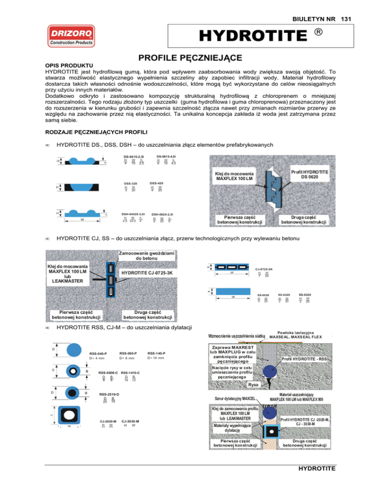 BIULETYN NR 131 HYDROTITE PROFILE PĘCZNIEJĄCE OPIS PRODUKTU HYDROTITE jest hydrofilową gumą, która pod wpływem zaabsorbowania wody zwiększa swoją objętość. To stwarza możliwość elastycznego wypełnienia szczeliny aby zapobiec infiltracji wody. Materiał hydrofilowy dostarcza takich własności odnośnie wodoszczelności, które mogą być wykorzystane do celów nieosiągalnych przy użyciu innych materiałów. Dodatkowo odkryto i zastosowano kompozycję strukturalną hydrofilową z chloroprenem o mniejszej rozszerzalności. Tego rodzaju złożony typ uszczelki (guma hydrofilowa i guma chloroprenowa) przeznaczony jest do rozszerzenia w kierunku grubości i zapewnia szczelność złącza nawet przy zmianach rozmiarów przerwy ze względu na zachowanie przez nią elastyczności. Ta unikalna koncepcja zakłada iż woda jest zatrzymana przez samą siebie. RODZAJE PĘCZNIEJĄCYCH PROFILI • HYDROTITE DS., DSS, DSH – do uszczelniania złącz elementów prefabrykowanych DS-0415-2,5I H W h 4 15 2,5 DS-0615-4,5I H W h 6 15 4,5 Profil HYDROTITE DS 0620 Klej do mocowania MAXFLEX 100 LM DSS-320 H W 3 20 DSH-04525-3,0I H W h 4,5 52,5 4 • DSS-420 H W 4 20 DSH-0620-2,5l H W h 6 20 6 Pierwsza część betonowej konstrukcji Druga część betonowej konstrukcji HYDROTITE CJ, SS – do uszczelniania złącz, przerw technologicznych przy wylewaniu betonu Zamocowanie gwoździami do betonu Klej do mocowania MAXFLEX 100 LM lub LEAKMASTER CJ-0725-3K H W 7 25 HYDROTITE CJ-0725-3K SS-0520 H W 5 20 Pierwsza część betonowej konstrukcji • SS-0220 H W 2 20 SS-0320 H W 3 20 Druga część betonowej konstrukcji HYDROTITE RSS, CJ-M – do uszczelniania dylatacji Wzmocnienie uszczelnienia siatką D RSS-040-P D = 4 mm D RSS-080-P D = 8 mm RSS-0806-C RSS-1410-C D B D B 8 6 14 10 RSS-140-P D = 14 mm Zaprawa MAXREST lub MAXPLUG w celu zamknięcia profilu pęczniejącego Powłoka izolacyjna MAXSEAL, MAXS EAL FLEX Profil HYDROTITE - RSS Nacięcie rysy w celu umieszczenia profilu pęczniejącego Rysa D RSS-2519-D D B 25 19 CJ-2020-M H W 20 20 Sznur dylatacyjny MAXCEL CJ-3030-M H W 30 30 Klej do zamocowania profilu MAXFLEX 100 LM lub LEAKMASTER Materiały wypełniające dylatację Pierwsza Pierwsza część część betonowej konstrukcji betonowej konstrukcji Materiał uszczelniający MAXFLEX 100 LM lub MAXFLEX 900 Profil HYDROTITE CJ -2020-M, CJ - 3030-M Druga Druga część część betonowej konstrukcji betonowej konstrukcji HYDROTITE ŁĄCZENIE PROFILI HYDROTITE Połączenie profili HYDROTITE wykonuje się na styk. Jeżeli w przekroju HYDROTITE znajdują się komory to należy zwrócić uwagę na staranne ich zaklejenie, aby zapobiec penetracji wody wzdłuż profilu. Do tego celu należy użyć kleju cjanoakrylowego lub silikonu pęczniejącego LEAKMASTER. W celu uzyskania większej pewności połączenia doczołowego, w miejscu połączenia można dodatkowo zaaplikować silikon pęczniejący LEAKMASTER. połącz yć na st yk i skleić HYDRO TITE CJ Łączenie na skrzyżowaniu LEAKMAST ER połącz yć na st yk i skleić Łączenie w narożniku połącz yć na styk i skleić Łączenie na długości połącz yć na st yk i skleić gwoździe do betonu LEAKMAST ER Wygięcie promieniowe Promień gięc ia profilu CJ to min. 60mm. Jeżeli potrz eba więcej to należ y rozciąć i skleić Przykłady zastosowań Jeżeli powierzchnia betonu nie jest gładka to należ y ją dok ładnie w ygładzić lub uż yć Przejścia szczelne Prefabrykaty s i l i k on u p ę c z n i e j ą c e go LEAKMASTER. H YDR OTITE CJ H YDR OTITE CJ H YDR OTITE CJ min. 10cm Złącza w ścianach Tunele L EA KMAS TE R H YDR OTITE CJ APROBATY I ATESTY Aprobata Techniczna ITB nr AT ITB 15-6557/2011 i Aneks nr 1 Krajowa Deklaracja Zgodności nr 25/2016 GWARANCJA Informacje zawarte w tej instrukcji zostały uzyskane na bazie naszych doświadczeń i wiedzy fachowej, uzyskanej z testów i z danych bibliograficznych. DRIZORO zachowuje sobie prawo do wprowadzania zmian bez wcześniejszego zawiadomienia. Za wszelkie użycie tych danych do celów innych niż ściśle określonych w tym biuletynie firma nie ponosi odpowiedzialności, chyba że takie działanie zostanie przez nas autoryzowane. Nie ponosimy odpowiedzialności przewyższającej wartość nabytego produktu. UWAGA Wraz z ukazaniem się tej instrukcji technicznej wszelkie wcześniejsze publikacje techniczne dotyczące produktu tracą swą ważność. Wyłączny dystrybutor na kraj DRIZORO - Poland Przeds. „carmen” Sp. z o.o. 85-738 Bydgoszcz, ul. Szajnochy 14, Tel./fax: (052) 342 02 27, 348 91 14 www.drizoro-polska.pl e-mail: [email protected] 11/2016 HYDROTITE