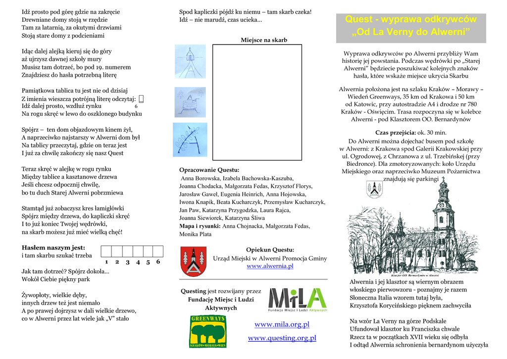Idź prosto pod górę gdzie na zakręcie Drewniane domy stoją w rzędzie Tam za latarnią, za okutymi drzwiami Stoją stare domy z podcieniami Spod kapliczki pójdź ku niemu – tam skarb czeka! Idź – nie marudź, czas ucieka… Miejsce na skarb Idąc dalej alejką kieruj się do góry aż ujrzysz dawnej szkoły mury Musisz tam dotrzeć, bo pod 19. numerem Znajdziesz do hasła potrzebną literę Wyprawa odkrywców po Alwerni przybliży Wam historię jej powstania. Podczas wędrówki po „Starej Alwerni” będziecie poszukiwać kolejnych znaków hasła, które wskaże miejsce ukrycia Skarbu Alwernia położona jest na szlaku Kraków – Morawy – Wiedeń Greenways, 35 km od Krakowa i 50 km od Katowic, przy autostradzie A4 i drodze nr 780 Kraków - Oświęcim. Trasa rozpoczyna się w kolebce Alwerni - pod Klasztorem OO. Bernardynów Pamiątkowa tablica tu jest nie od dzisiaj Z imienia wieszcza potrójną literę odczytaj: _ Idź dalej prosto, wzdłuż rynku 6 Na rogu skręć w lewo do oszklonego budynku Spójrz – ten dom objazdowym kinem żył, A naprzeciwko najstarszy w Alwerni dom był Na tablicy przeczytaj, gdzie on teraz jest I już za chwilę zakończy się nasz Quest Teraz skręć w alejkę w rogu rynku Między tablice a kasztanowe drzewa Jeśli chcesz odpocznij chwilę, bo tu duch Starej Alwerni pobrzmiewa Opracowanie Questu: Anna Borowska, Izabela Bachowska-Kaszuba, Joanna Chodacka, Małgorzata Fedas, Krzysztof Florys, Jarosław Gaweł, Eugenia Heinrich, Anna Hojowska, Iwona Knapik, Beata Kucharczyk, Przemysław Kucharczyk, Jan Paw, Katarzyna Przygodzka, Laura Rajca, Joanna Siewiorek, Katarzyna Śliwa Mapa i rysunki: Anna Chojnacka, Małgorzata Fedas, Monika Plata Stamtąd już zobaczysz kres łamigłówki Spójrz między drzewa, do kapliczki skręć I to już koniec Twojej wędrówki, na skarb możesz już mieć wielką chęć! Hasłem naszym jest: i tam skarbu szukać trzeba 1 2 3 Quest - wyprawa odkrywców „Od La Verny do Alwerni” 4 Jak tam dotrzeć? Spójrz dokoła… Wokół Ciebie piękny park Żywopłoty, wielkie dęby, innych drzew też jest niemało A po prawej dojrzysz w dali wielkie drzewo, co w Alwerni przez lat wiele jak „V” stało 5 6 Czas przejścia: ok. 30 min. Do Alwerni można dojechać busem pod szkołę w Alwerni: z Krakowa spod Galerii Krakowskiej przy ul. Ogrodowej, z Chrzanowa z ul. Trzebińskej (przy Biedronce). Dla zmotoryzowanych: koło Urzędu Miejskiego oraz naprzeciwko Muzeum Pożarnictwa znajdują się parkingi Opiekun Questu: Urząd Miejski w Alwerni Promocja Gminy www.alwernia.pl Questing jest rozwijany przez Fundację Miejsc i Ludzi Aktywnych www.mila.org.pl www.questing.org.pl Alwernia i jej klasztor są wiernym obrazem włoskiego pierwowzoru - poznajmy je razem Słoneczna Italia wzorem tutaj była, Krzysztofa Korycińskiego pięknem zachwyciła Na wzór La Verny na górze Podskale Ufundował klasztor ku Franciszka chwale Rzecz ta w początkach XVII wieku się odbyła I odtąd Alwernia schronienia bernardynom użyczyła Klasztorna furta to początek Twej przygody Na jej końcu skarb znajdziesz, podróżniku młody Odczytaj ważne dwa słowa z bramy A poznasz mądrość przodków tej ziemi A teraz słuchaj uważnie, skieruj swe kroki w lewo Aż zobaczysz po drodze niejedno orzechowe drzewo Spójrz na zabytkową studnię po Twej lewej stronie Jeśli zechcesz, możesz na chwilkę udać się do niej Obejrzałeś? Wracaj więc znów na naszą ścieżkę W studni skarbu nie znajdziesz - kontynuuj wycieczkę Idź przed siebie, a gdy miniesz bramy progi Rozejrzyj się, a znajdziesz kierunek dalszej drogi Gdy po schodkach szybko zejdziesz w dół, Idąc policz czy na pewno jest ich koło stu I jak? Policzyłeś? Nie jest źle? Jeśli tak, to teraz kieruj dalej kroki swe Zmierzaj ku tablicy, w lewą stronę, gdzie dowiesz się że z _ _ _ _ _ _ _ _ _ Podskale jest zbudowane 3 Poniżej jest wąwóz lessowy, bardzo głęboki, a w nim woda wycieka, to tzw. _ _ _ _ _ 2 Gdy zawrócisz przy tablicy do przodu 10 kroków przejdź Znajdziesz ścieżkę po prawicy I po niej na górę wejdź Pnij się ścieżką mijając grube mury Niezbyt daleko, aż zobaczysz wież kontury To kościół klasztorny, a w nim, jak wiadomo cudami słynący obraz Ecce Homo Teraz idź prosto na chodnik Kamień wielki ujrzysz – to pomnik Jeśli chcesz podejdź do niego żwawym krokiem, Przypatrz się uważniej, zerknij nań ciekawym okiem Odczytasz na nim mądrości ukryte W litej skale ku pamięci papieża wyryte Przeczytaj i zapamiętaj je dobrze A Alwernia skarbami obdaruje Cię szczodrze Od tego momentu kieruj się ku górze Aż 4 Ewangelistów zobaczysz na kościelnym murze Przed nim tablica duża stoi Chwilę się zatrzymaj i poczytaj o historii. Gdy już wiesz skąd nazwa Alwernia pochodzi i dlaczego od La Verny się wywodzi Wejdź na Rajski Plac, gdzie wokół rosną drzewa Idź ku zachodowi i kolejnych wskazówek się spodziewaj Popatrz nad bramą wysoko do góry, podróżniku Pod dwiema figurami jest napis w łacińskim języku Pierwsza litera wersu trzeciego to: _ To hasła naszego początkowa litera 1 Czy kościół w środku pozwiedzałeś? Cudowny obraz Jezusa Ecce Homo ujrzałeś? Wyjdź przed bramę i znajdź Chrystusa Frasobliwego, W którą stronę iść - wyczytasz z oczu jego Ulicą Klasztorną kieruj się do góry, Wnet zobaczysz na postumencie dwie figury A po drugiej drogi stronie _ _ _ _ _ na krzyżu w cierniowej koronie 5 Tam przy św. Franciszku oczy wznieś do góry Czy pamiętasz dzieciństwo, szkołę, czas matury? Znasz to drzewo? To _ _ _ _ _ _ _ _ _ _ _ _ A jego owoce to kasztany - zapamiętaj to sobie 4 Przejdź uważnie przez ulicę Tu muzeum pożarnicze A w nim wozy, dodge, fiaty... Co strażakom służyły przed laty