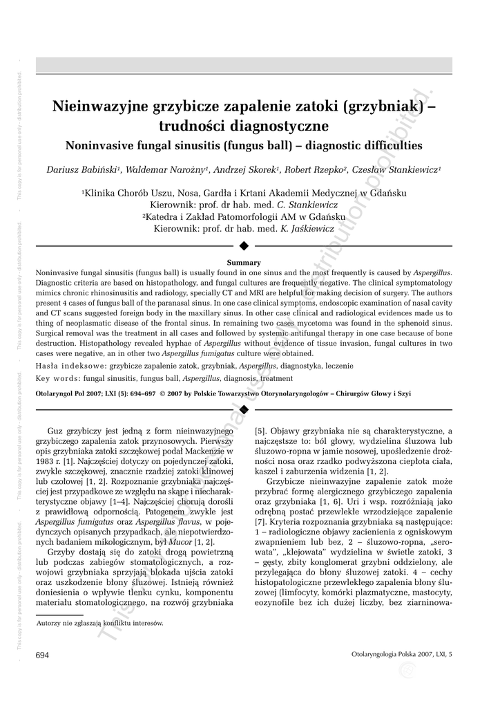 ed . tio np roh ibit Nieinwazyjne grzybicze zapalenie zatoki (grzybniak) – trudności diagnostyczne Noninvasive fungal sinusitis (fungus ball) – diagnostic difficulties Dariusz Babiński¹, Waldemar Narożny¹, Andrzej Skorek¹, Robert Rzepko², Czesław Stankiewicz¹ eo nly -d istr Summary Noninvasive fungal sinusitis (fungus ball) is usually found in one sinus and the most frequently is caused by Aspergillus. Diagnostic criteria are based on histopathology, and fungal cultures are frequently negative. The clinical symptomatology mimics chronic rhinosinusitis and radiology, specially CT and MRI are helpful for making decision of surgery. The authors present 4 cases of fungus ball of the paranasal sinus. In one case clinical symptoms, endoscopic examination of nasal cavity and CT scans suggested foreign body in the maxillary sinus. In other case clinical and radiological evidences made us to thing of neoplasmatic disease of the frontal sinus. In remaining two cases mycetoma was found in the sphenoid sinus. Surgical removal was the treatment in all cases and followed by systemic antifungal therapy in one case because of bone destruction. Histopathology revealed hyphae of Aspergillus without evidence of tissue invasion, fungal cultures in two cases were negative, an in other two Aspergillus fumigatus culture were obtained. - This copy is for personal use only - distribution prohibited. ibu ¹Klinika Chorób Uszu, Nosa, Gardła i Krtani Akademii Medycznej w Gdańsku Kierownik: prof. dr hab. med. C. Stankiewicz ²Katedra i Zakład Patomorfologii AM w Gdańsku Kierownik: prof. dr hab. med. K. Jaśkiewicz - This copy is for personal use only - distribution prohibited. D. Babiński i inni - us Ke y wo rds: fungal sinusitis, fungus ball, Aspergillus, diagnosis, treatment Otolaryngol Pol 2007; LXI (5): 694–697 © 2007 by Polskie Towarzystwo Otorynolaryngologów – Chirurgów Głowy i Szyi on al is c op y is for pe rs Guz grzybiczy jest jedną z form nieinwazyjnego grzybiczego zapalenia zatok przynosowych. Pierwszy opis grzybniaka zatoki szczękowej podał Mackenzie w 1983 r. [1]. Najczęściej dotyczy on pojedynczej zatoki, zwykle szczękowej, znacznie rzadziej zatoki klinowej lub czołowej [1, 2]. Rozpoznanie grzybniaka najczęściej jest przypadkowe ze względu na skąpe i niecharakterystyczne objawy [1–4]. Najczęściej chorują dorośli z prawidłową odpornością. Patogenem zwykle jest Aspergillus fumigatus oraz Aspergillus flavus, w pojedynczych opisanych przypadkach, ale niepotwierdzonych badaniem mikologicznym, był Mucor [1, 2]. Grzyby dostają się do zatoki drogą powietrzną lub podczas zabiegów stomatologicznych, a rozwojowi grzybniaka sprzyjają blokada ujścia zatoki oraz uszkodzenie błony śluzowej. Istnieją również doniesienia o wpływie tlenku cynku, komponentu materiału stomatologicznego, na rozwój grzybniaka [5]. Objawy grzybniaka nie są charakterystyczne, a najczęstsze to: ból głowy, wydzielina śluzowa lub śluzowo-ropna w jamie nosowej, upośledzenie drożności nosa oraz rzadko podwyższona ciepłota ciała, kaszel i zaburzenia widzenia [1, 2]. Grzybicze nieinwazyjne zapalenie zatok może przybrać formę alergicznego grzybiczego zapalenia oraz grzybniaka [1, 6]. Uri i wsp. rozróżniają jako odrębną postać przewlekłe wrzodziejące zapalenie [7]. Kryteria rozpoznania grzybniaka są następujące: 1 – radiologiczne objawy zacienienia z ogniskowym zwapnieniem lub bez, 2 – śluzowo-ropna, „serowata”, „klejowata” wydzielina w świetle zatoki, 3 – gęsty, zbity konglomerat grzybni oddzielony, ale przylegająca do błony śluzowej zatoki. 4 – cechy histopatologiczne przewlekłego zapalenia błony śluzowej (limfocyty, komórki plazmatyczne, mastocyty, eozynofile bez ich dużej liczby, bez ziarninowa- Autorzy nie zgłaszają konfliktu interesów. Th This copy is for personal use only - distribution prohibited. - This copy is for personal use only - distribution prohibited. Hasła i n de kso we : grzybicze zapalenie zatok, grzybniak, Aspergillus, diagnostyka, leczenie 694 Otolaryngologia Polska 2007, LXI, 5 ed . MATERIAŁ I METODY nly -d istr ibu Materiał stanowi 4 chorych w wieku 35–75 lat leczonych w Klinice Otolaryngologii w Gdańsku w latach 2004–2006. Metoda: Rozpoznanie izolowanego grzybiczego zapalenia zatok ustalano na podstawie badania podmiotowego, przedmiotowego i radiologicznego – TK i MR. U wszystkich chorych wykonano badanie bakteriologiczne i histopatologiczne materiału uzyskanego podczas zabiegu oraz badanie mikoserologiczne. is c op y is for pe rs on al us Grzybicze izolowane zapalenie zatoki (grzybniak) rozpoznano u 4 chorych. Szczegółowo dane kliniczne zestawiono w tabeli I. W 1 przypadku choroba była ograniczona do zatoki szczękowej, w 1 przypadku do zatoki czołowej, a w 2 przypadkach grzybniaka stwierdzono w zatoce klinowej. Objawy stwierdzane u chorych były niecharakterystyczne, takie jak w przewlekłym zapaleniu zatok w przypadku nr 1, bóle głowy jako izolowany objaw u chorych z grzybniakiem umiejscowionym w zatoce klinowej oraz objawy sugerujące obecność guza w zatoce czołowej w przypadku nr 2. W obrazach TK w przypadku grzybniaka zatoki czołowej stwierdzono całkowite zacienienie zatoki z destrukcją fragmentu tylnej jej ściany. W pozostałych przypadkach zacienienie dotyczyło tylko fragmentu zatoki i w jej obrębie obserwowano wzmocnienie zacienienia sugerujące „zwapnienie”. W badaniu MR grzybniaka zatoki czołowej stwierdzono zmianę o niskiej intensywności sygnału w obrazach T1- i T2-zależnych otoczoną warstwą o wysokiej intensywności sygnału odpowiadającej zmienionej zapalnie błonie śluzowej. Wszystkich chorych leczono operacyjnie, zatokę czołową z dostępu zewnętrznego, natomiast w przypadku zmian w zatoce szczękowej i klinowej wykonano operację endoskopową. Otwarcie zatoki czołowej wykonano przez ścianę dolną, uzyskując dobrą kontrolę wnętrza eo WYNIKI Otol