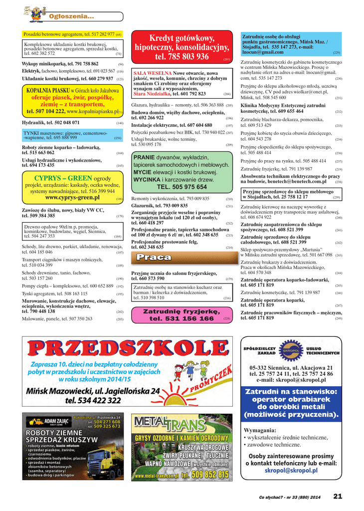 Ogłoszenia... Posadzki betonowe agregatem, tel. 517 282 977 (64) Kompleksowe układanie kostki brukowej, posadzki betonowe agregatem, sprzedaż kostki, tel. 602 382 572 (74) (201) Wykopy minikoparką, tel. 791 758 862 (94) Elektryk, fachowo, kompleksowo, tel. 691 023 567 (116) Układanie kostki brukowej, tel. 660 279 937 (123) KOPALNIA PIASKU w Górach koło Jakubowa oferuje piasek, żwir, pospółkę, ziemię – z transportem, tel. 507 104 222, www.kopalniapiasku.pl(71) Hydraulik, tel. 502 048 071 TYNKI maszynowe: gipsowe, cementowo-wapienne, tel. 695 888 999 (140) (156) (164) Usługi hydrauliczne i wykończeniowe, tel. 694 173 435 (165) CYPRYS – GREEN ogrody projekt, urządzanie: kaskady, oczka wodne, systemy nawadniające, tel. 516 399 944 Zawiozę do ślubu, nowy, biały VW CC, tel. 509 384 385 Drewno opałowe 90zł/m p, promocja, kominkowe, budowlane, węgiel, Siennica, tel. 504 247 353 (166) (179) (184) Schody, lite drewno, parkiet, układanie, renowacja, tel. 604 185 046 (187) Transport ciągników i maszyn rolniczych, tel. 510 034 399 (189) Schody drewniane, tanio, fachowo, tel. 503 157 260 (190) Pompy ciepła – kompleksowo, tel. 600 652 889 (192) Tynki agregatem, tel. 508 163 115 (195) Murowanie, konstrukcje dachowe, elewacje, ocieplenia, wykończenia wnętrz, (202) tel. 790 448 138 Malowanie, panele, tel. 507 350 263 SALA WESELNA Nowe otwarcie, nowa jakość, wesela, komunie, chrzciny z dobrym smakiem Ci zrobimy oraz oferujemy wynajem sali z wyposażeniem, (204) Stara Niedziałka, tel. 601 792 823 Glazura, hydraulika – remonty, tel. 506 363 888 (205) Budowa domów, więźby dachowe, ocieplenia, tel. 692 266 922 (196) Instalacje elektryczne, tel. 607 604 680 (197) Pożyczki pozabankowe bez BIK, tel. 730 940 022 (207) Roboty ziemne koparko – ładowarką, tel. 515 663 062 www.cyprys-green.pl Kredyt gotówkowy, hipoteczny, konsolidacyjny, tel. 785 803 936 (203) Usługi brukarskie, wolne terminy, tel. 530 095 178 (209) PRANIE dywanów, wykładzin, tapicerek samochodowych i meblowych. MYCIE elewacji i kostki brukowej. WYCINKA i karczowanie drzew. TEL. 505 975 654 Zatrudnię osobę do obsługi punktu gastronomicznego, Mińsk Maz. / Stojadła, tel. 535 147 273, e-mail: [email protected] (229) Zatrudnię kosmetyczki do gabinetu kosmetycznego w centrum Mińska Mazowieckiego. Proszę o nadsyłanie ofert na adres e-mail: lnocun@gmail. (230) com, tel. 535 147 273 Przyjmę do sklepu alkoholowego młodą, uczciwą dziewczynę, CV pod adres [email protected], Mińsk, tel. 508 545 600 (231) Klinika Medycyny Estetycznej zatrudni kosmetyczkę, tel. 609 655 464 (232) Zatrudnię blacharza-dekarza, pomocnika, tel. 609 513 429 (233) Przyjmę kobietę do szycia obuwia dziecięcego, tel. 604 543 278 (234) Przyjmę ekspedientkę do sklepu spożywczego, tel. 505 488 414 (236) Przyjmę do pracy na rynku, tel. 505 488 414 (237) Zatrudnię fryzjerkę, tel. 791 139 987 (219) Absolwenta technikum elektrycznego do pracy na budowie, [email protected] (238) (208) Przyjmę sprzedawcę do sklepu meblowego (239) w Stojadłach, tel. 25 758 12 17 Remonty i wykończenia, tel. 793 009 835 (210) Glazurnik, tel. 793 009 835 (211) Zorganizuję przyjęcie weselne i poprawiny w wynajętym lokalu (od 120 zł od osoby), tel. 660 418 297 Zatrudnię kierowcę na naczepę wywrotkę z doświadczeniem przy transporcie masy asfaltowej, (240) tel. 608 674 922 (212) Zatrudnię zaopatrzeniowca do sklepu spożywczego, tel. 608 521 399 (241) Zatrudnię sprzedawcę do sklepu całodobowego, tel. 608 521 399 (242) Profesjonalne pranie, tapicerka samochodowa od 100 zł dywany 6 zł/ m2, tel. 602 348 635 (213) Profesjonalne prostowanie felg, tel. 602 348 635 (214) Praca Przyjmę ucznia do salonu fryzjerskiego, tel. 660 573 590 Zatrudnię osobę na stanowisko kucharz oraz barman / kelnerka z doświadczeniem, tel. 510 398 510 Zatrudnię fryzjerkę, tel. 531 156 166 (179) (216) (228) Sklep spożywczo-przemysłowy „Martusia” w Mińsku zatrudni sprzedawcę, tel. 501 667 098 (243) Zatrudnię brukarzy z doświadczeniem. Praca w okolicach Mińska Mazowieckiego, tel. 604 570 348 (244) Zatrudnię operatora koparko-ładowarki, tel. 605 171 819 (245) Zatrudnię kosmetyczkę, tel. 791 139 987 (246) Zatrudnię operatora koparki, tel. 605 171 819 (247) Zatrudnię pracowników fizycznych – mężczyzn, (249) tel. 605 171 819 05-332 Siennica, ul. Akacjowa 21 tel. 25 757 24 11, tel. 25 757 24 86 e-mail: [email protected] Zatrudni na stanowisko: operator obrabiarek do obróbki metali (możliwość przyuczenia). Wymagania: • wykształcenie średnie techniczne, • zawodowe techniczne. Osoby zainteresowane prosimy o kontakt telefoniczny lub e-mail: [email protected] Co słychać? - nr 33 (880) 2014 21